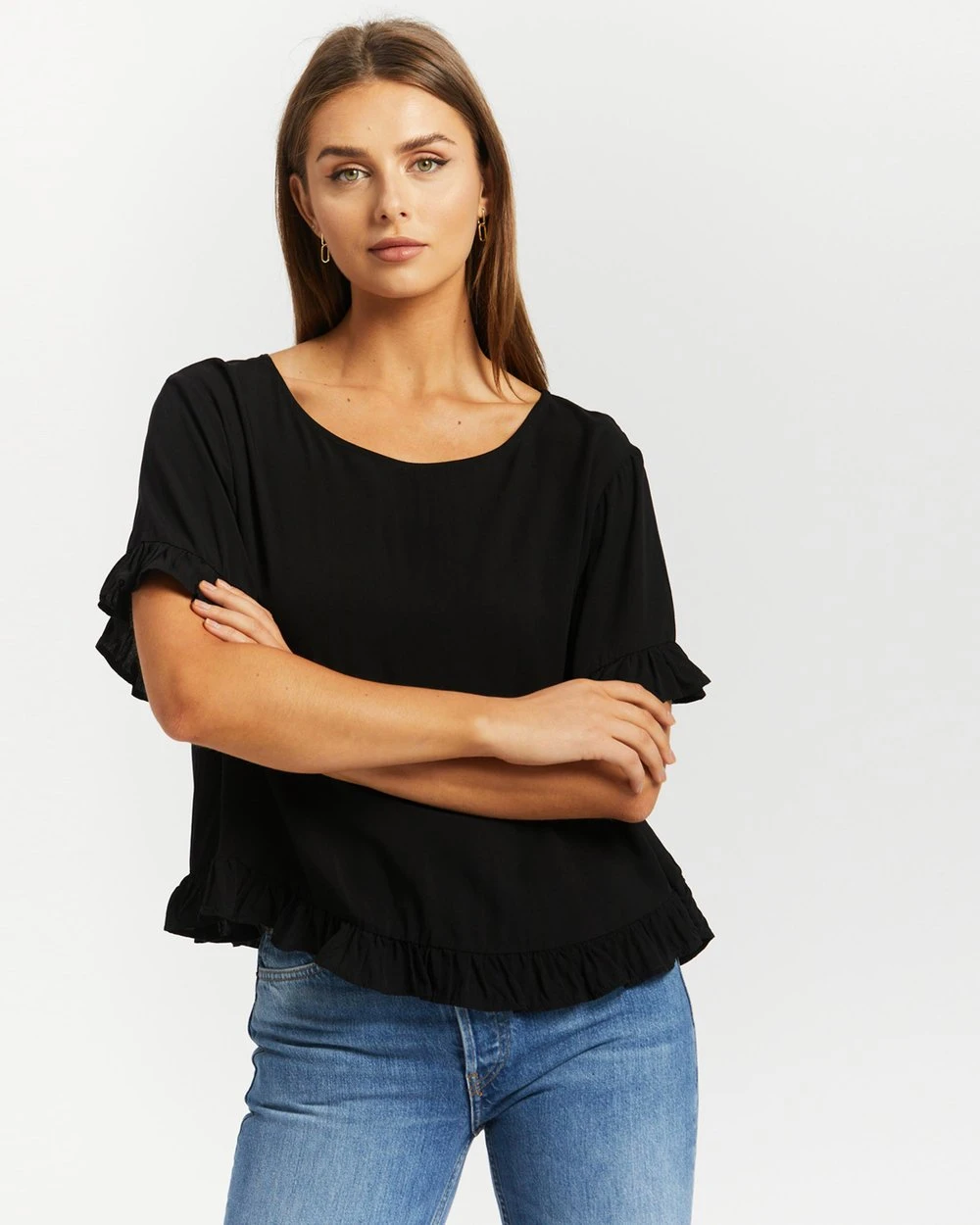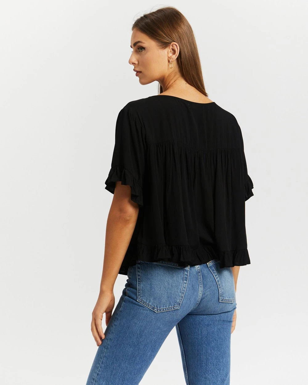 Whether you’re at the office or going out, the Blainey Frill Sleeve Top from Atmos&Here adds easy, breezy midnight flair to any ensemble.