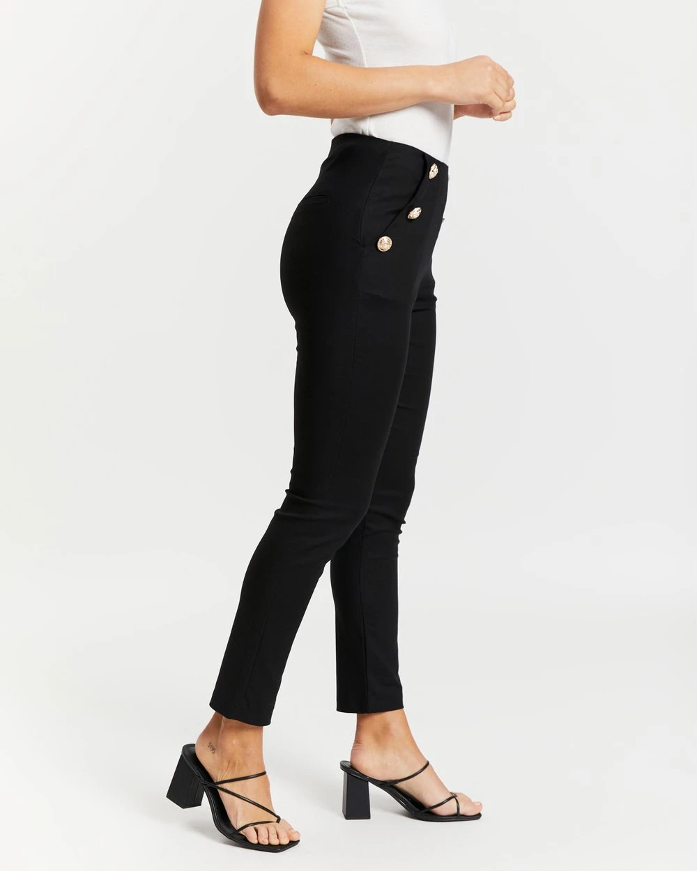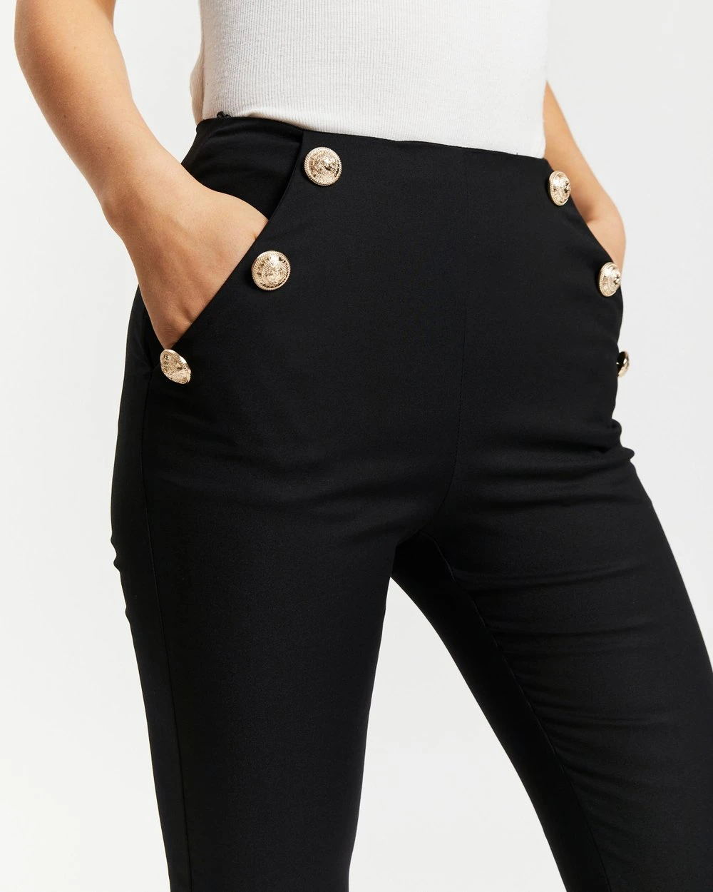 – Slant hip pockets; button details