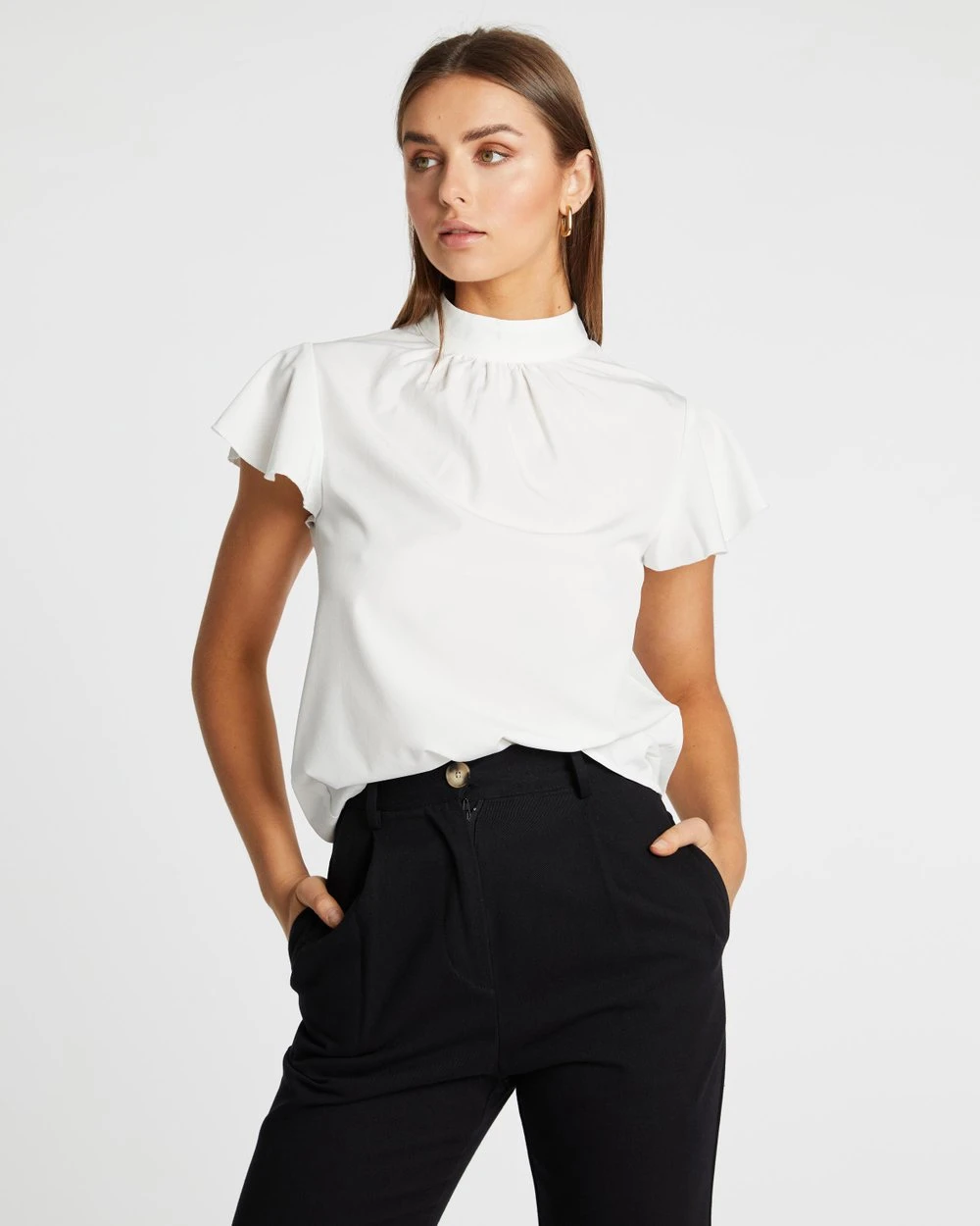 With a gathered collar and a crisp white fabric, Atmos&Here’s Fia Flutter Sleeve Blouse is a chic desk-to-dinner piece.