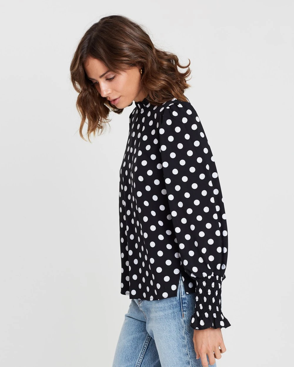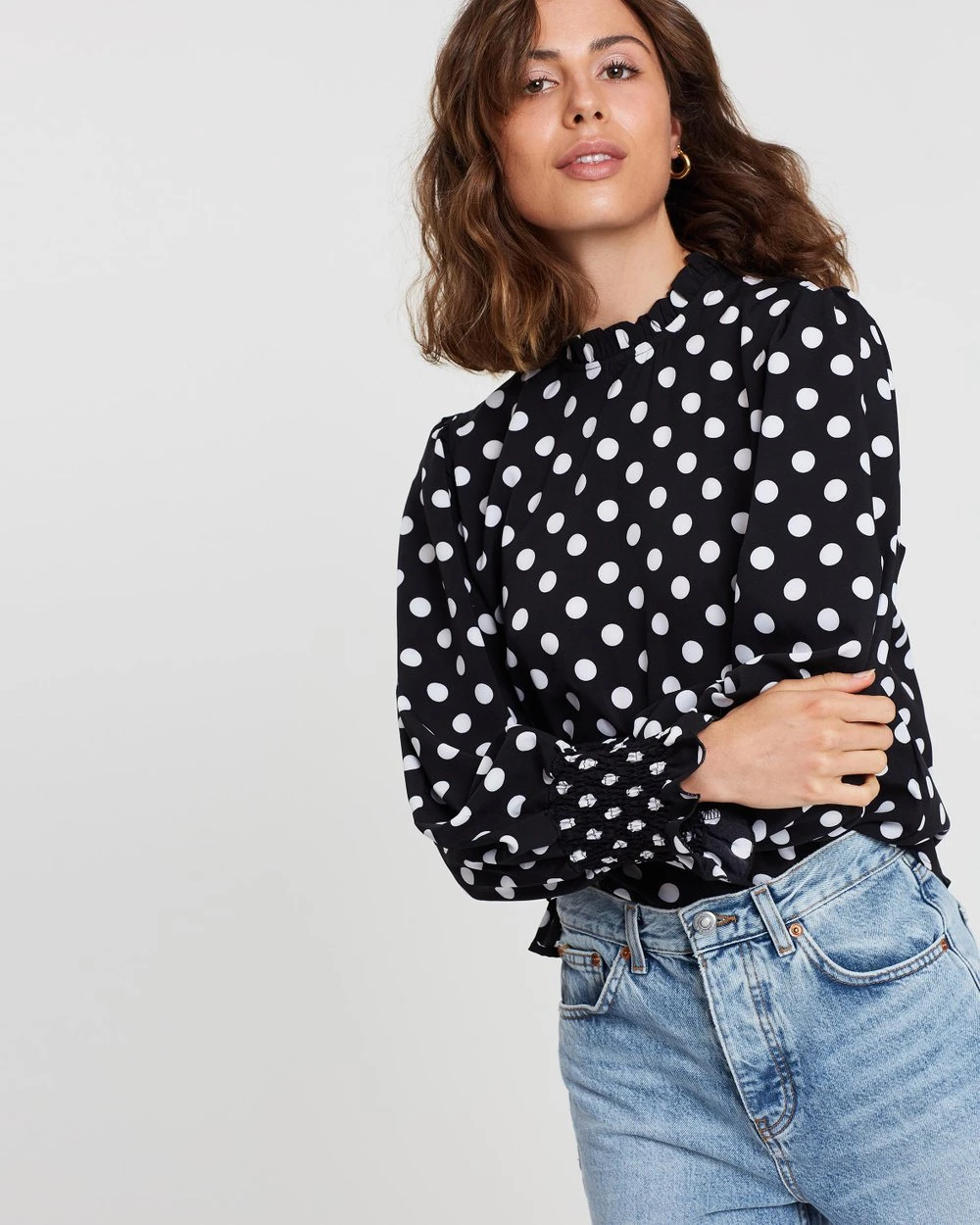 Featuring a high ruffle neckline and shirred cuffs, the Georgie Top from Atmos&Here will transition from day to dinner in a flash.