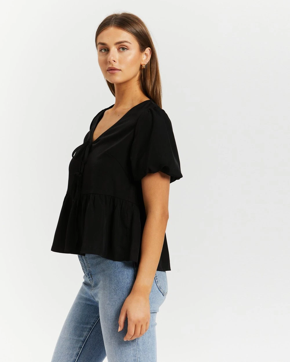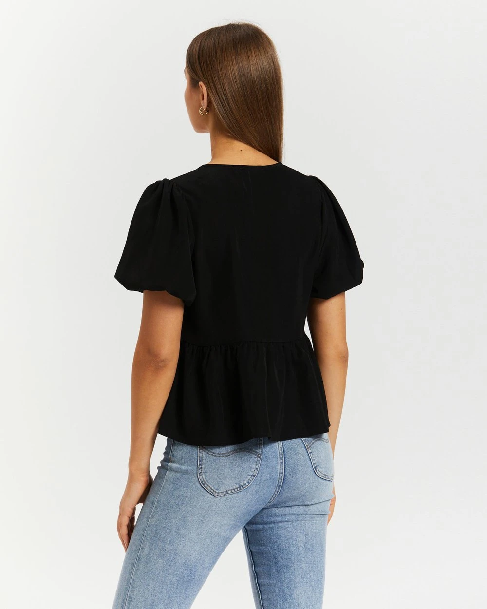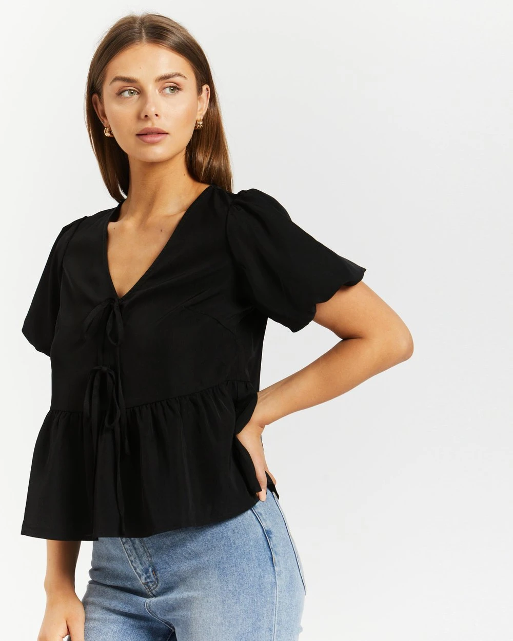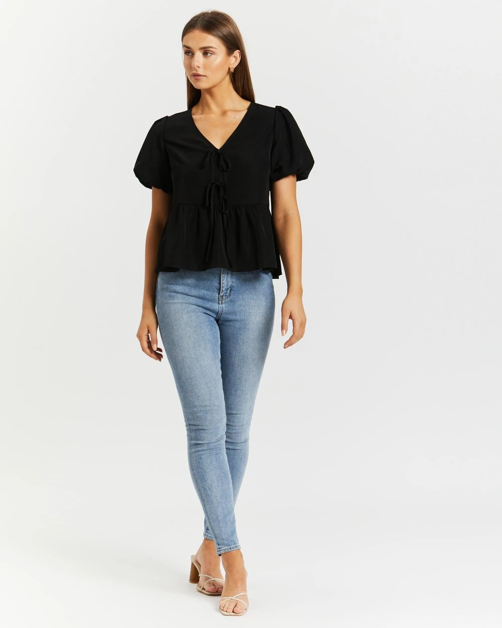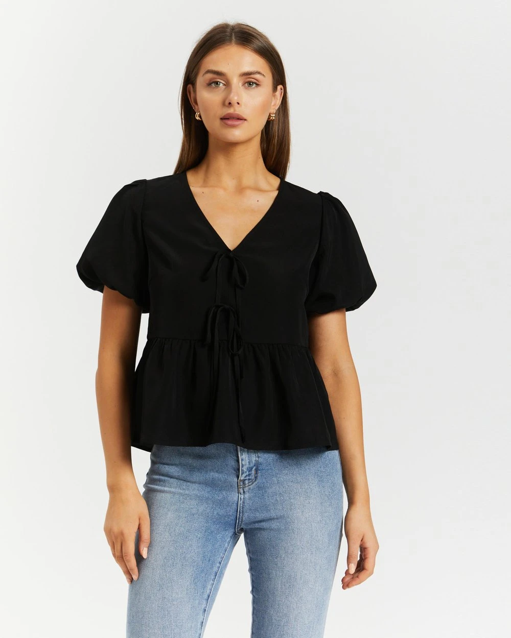 Atmos&Here Kalia Bow Front Puff Sleeve Blouse Black