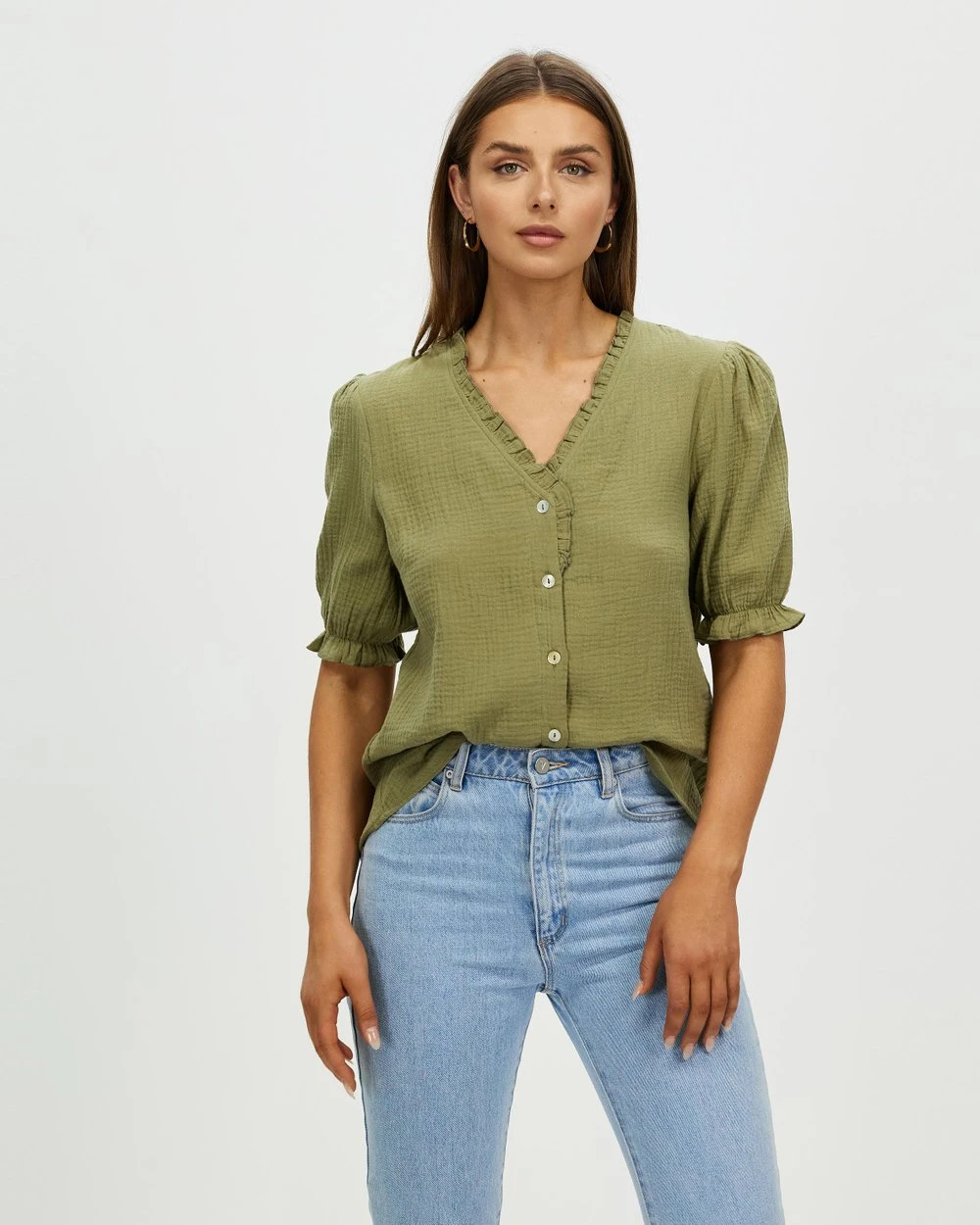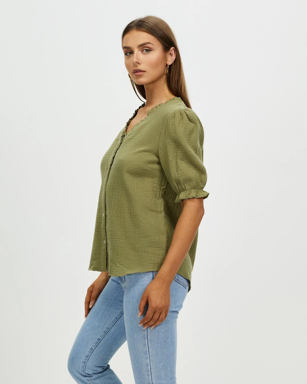 – V-neckline; ruffled