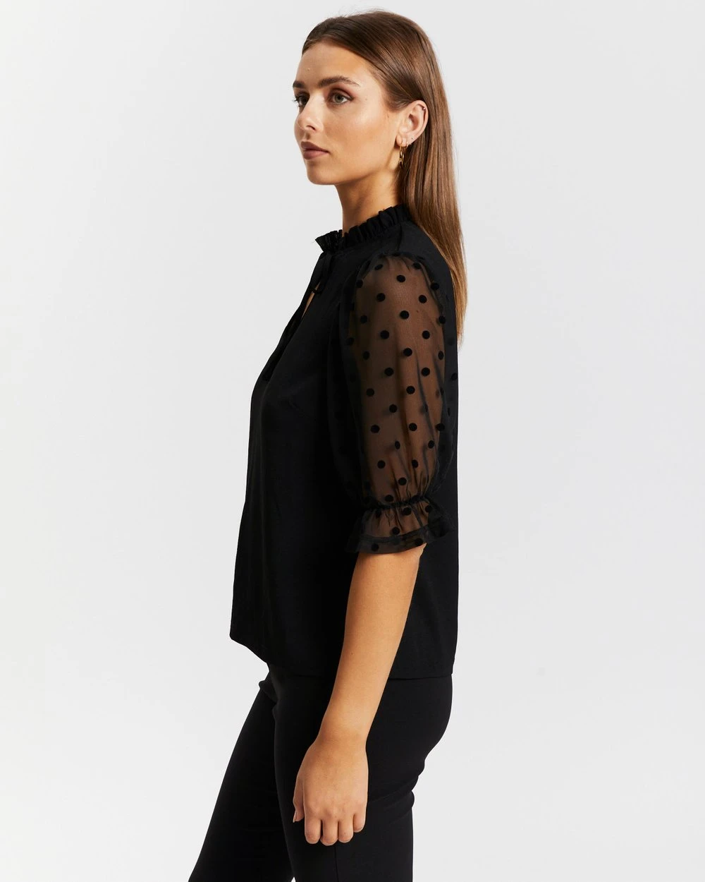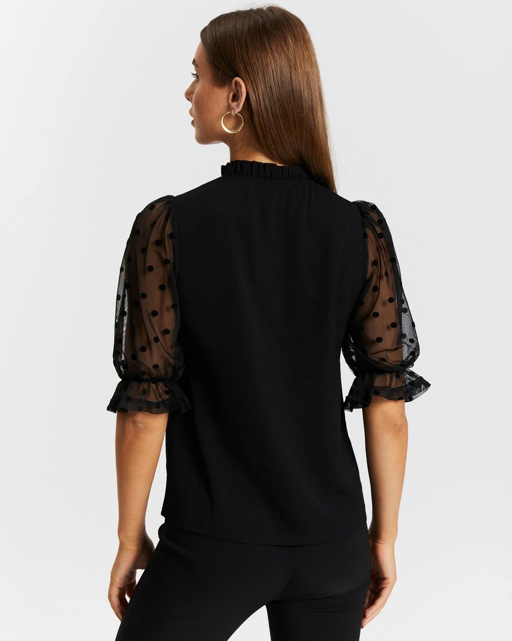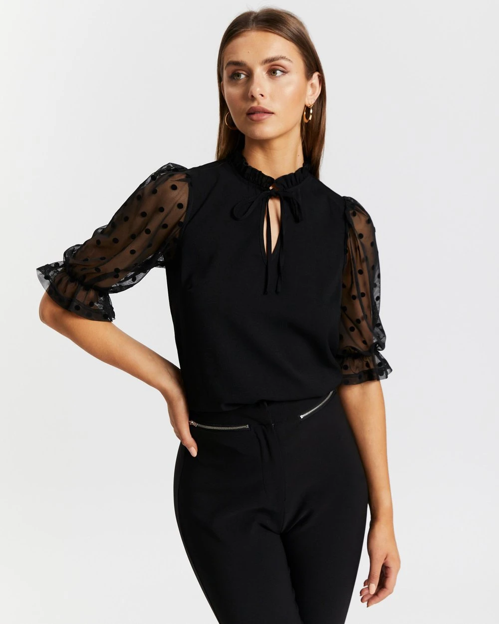 – Sheer elbow-length sleeves