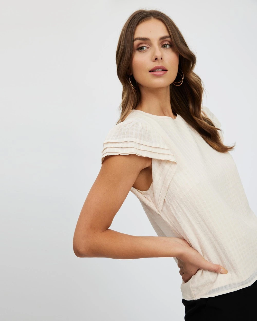 – Round neckline; flutter cap sleeves