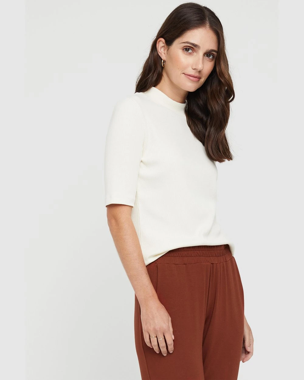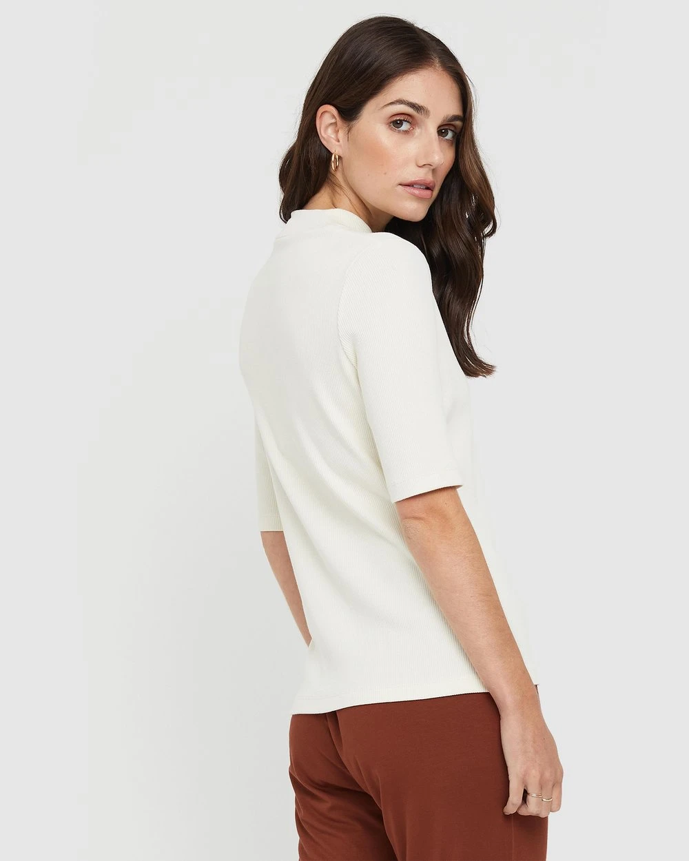 The ultimate everyday layer made from bamboo and organic cotton. Cut in a slim fit, the Taylor Ribbed Top in Cream, by Bamboo Body features an elegant high neckline and short sleeves that reach just above the elbow. The ribbed fabric feels luxuriously soft against the skin while having a UPF rating of 50+.