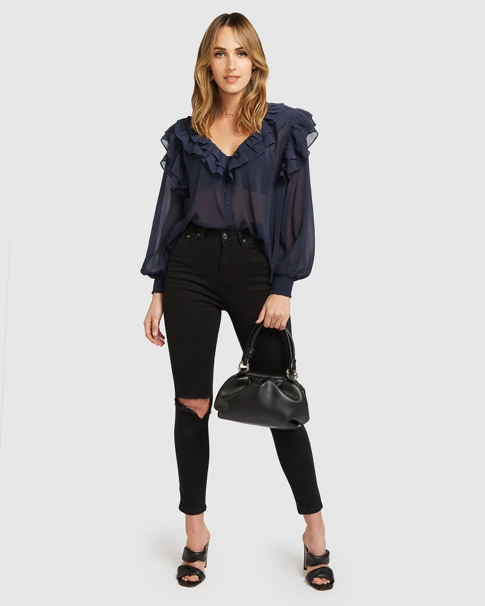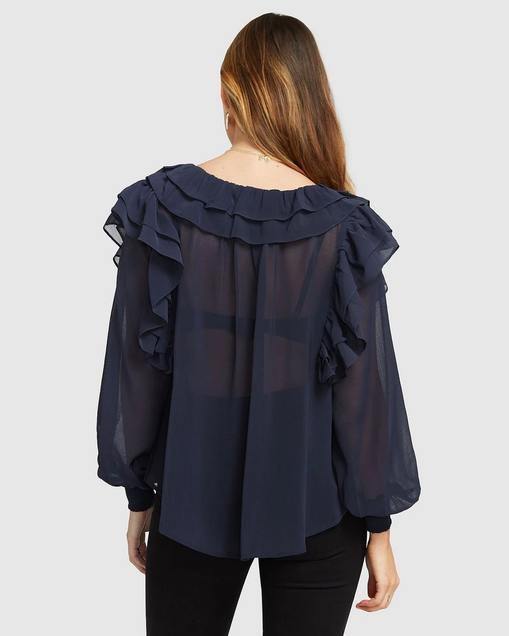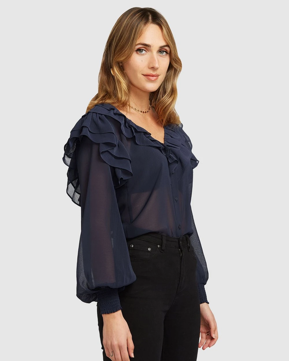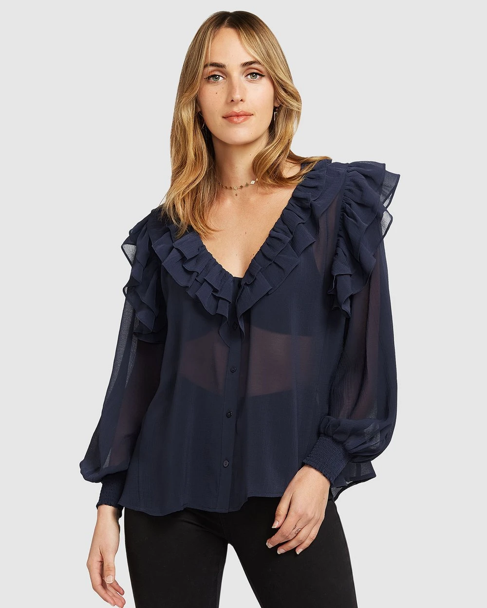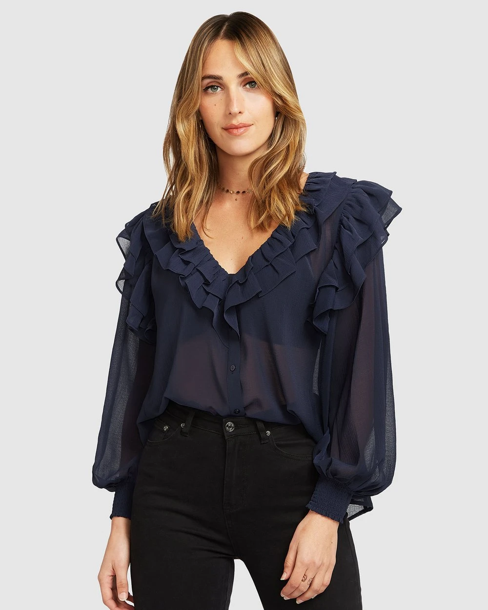 With an abundance of flirty layers, the Deja Vu Ruffle V-Neck Top by Belle & Bloom exudes a sweetly-feminine look in a lightweight chiffon.