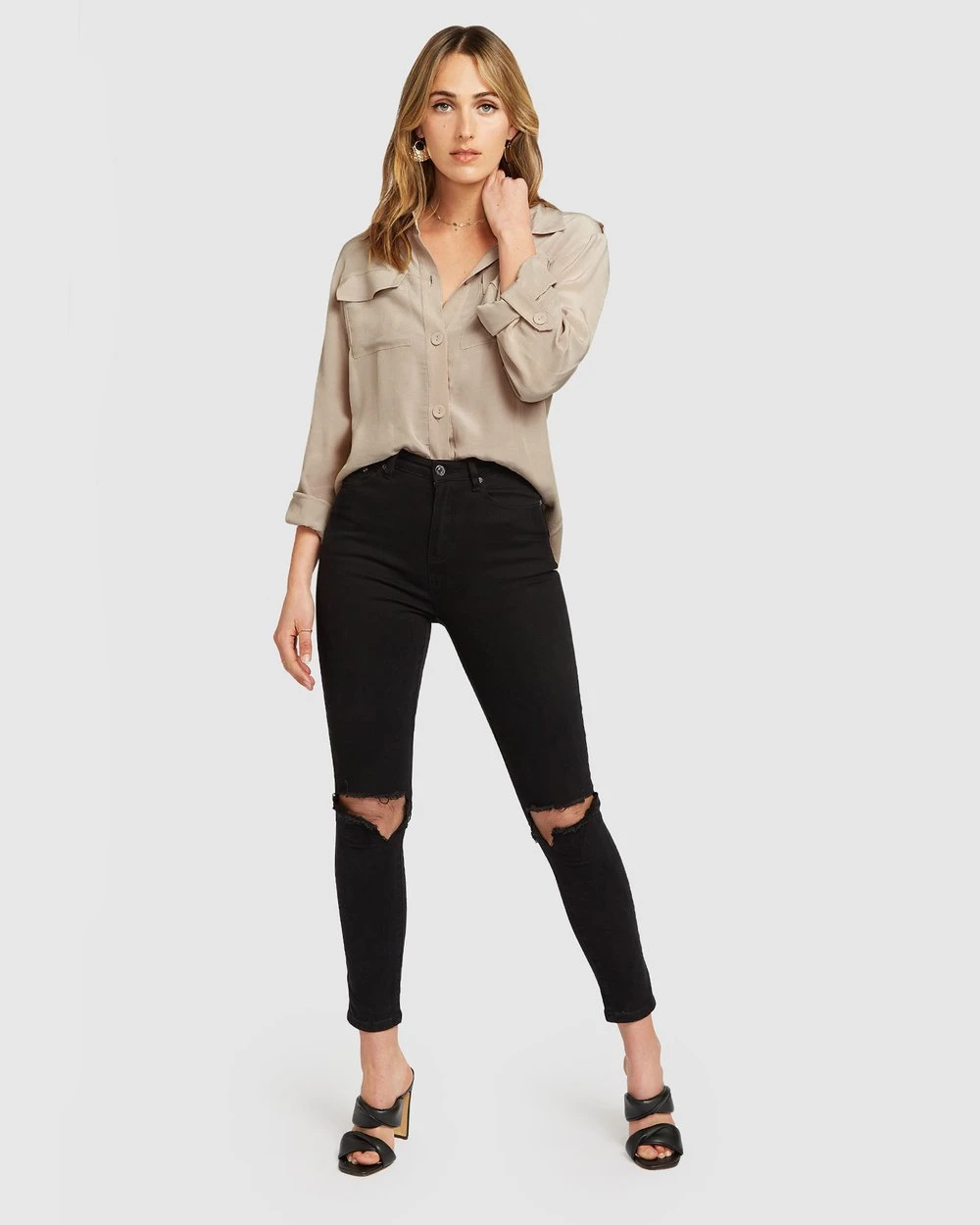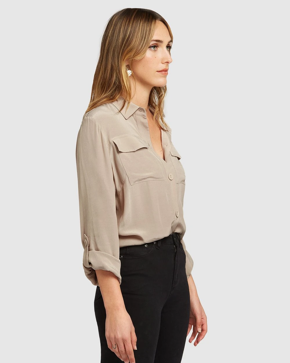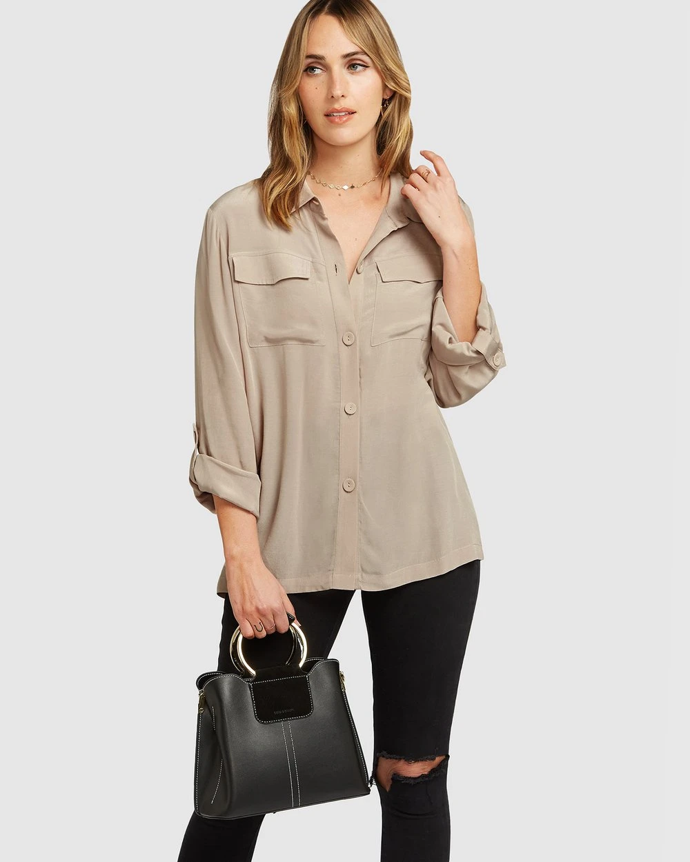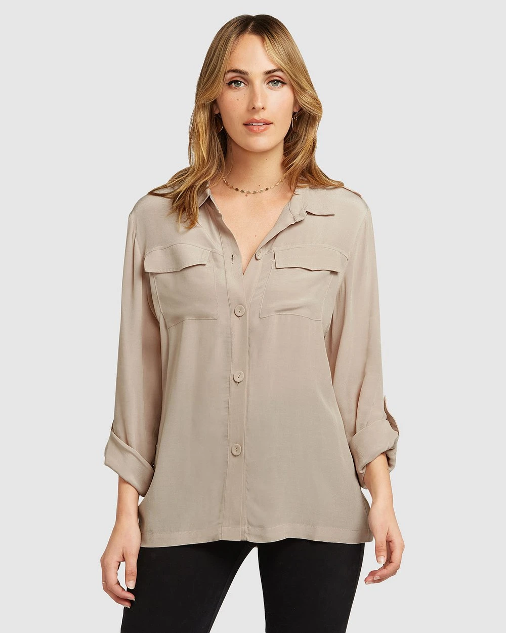 Lightweight and loose, the Eclipse Rolled Sleeve Blouse by Belle & Bloom is an upgraded basic that wears perfectly with both jeans and workwear. Adorned with premium buttons all over, the rolled-up sleeve feature stays put with a roll tab for that effortless ¾ look.