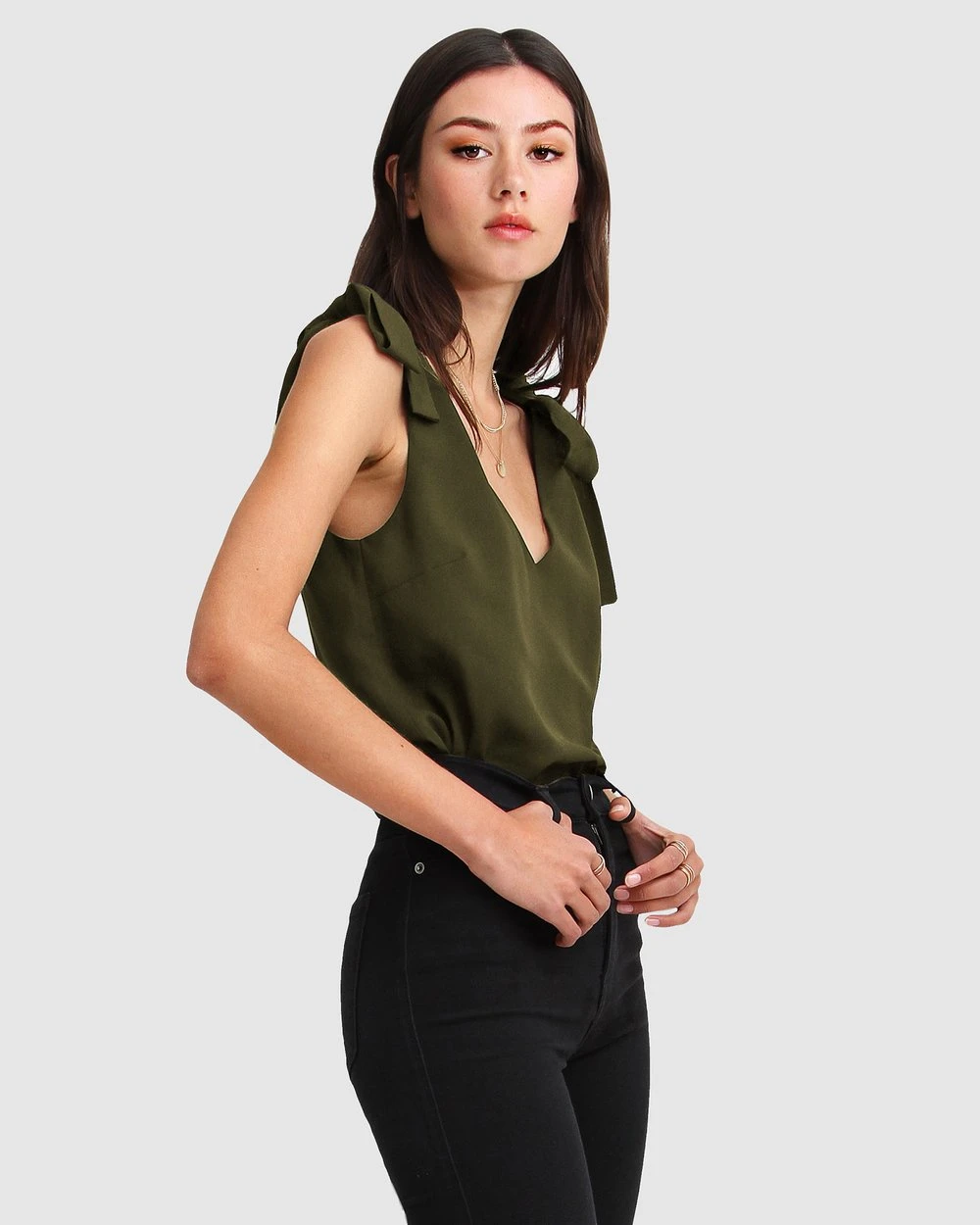 – Fabric: 100% Polyester – Length: 62cm (size small) – Regular fit – V-neck – Self-tie straps – Straight hem – Colour: military