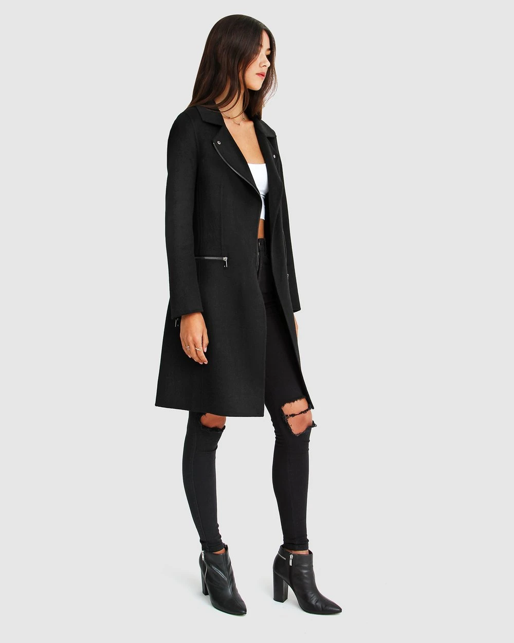 With a dressier take on the biker style jacket, the Last Chance Wool Blend Moto Coat by Belle & Bloom is crafted with all the classic moto details. It features an asymmetrical zip with all the hardware to add some bling to your winter style.