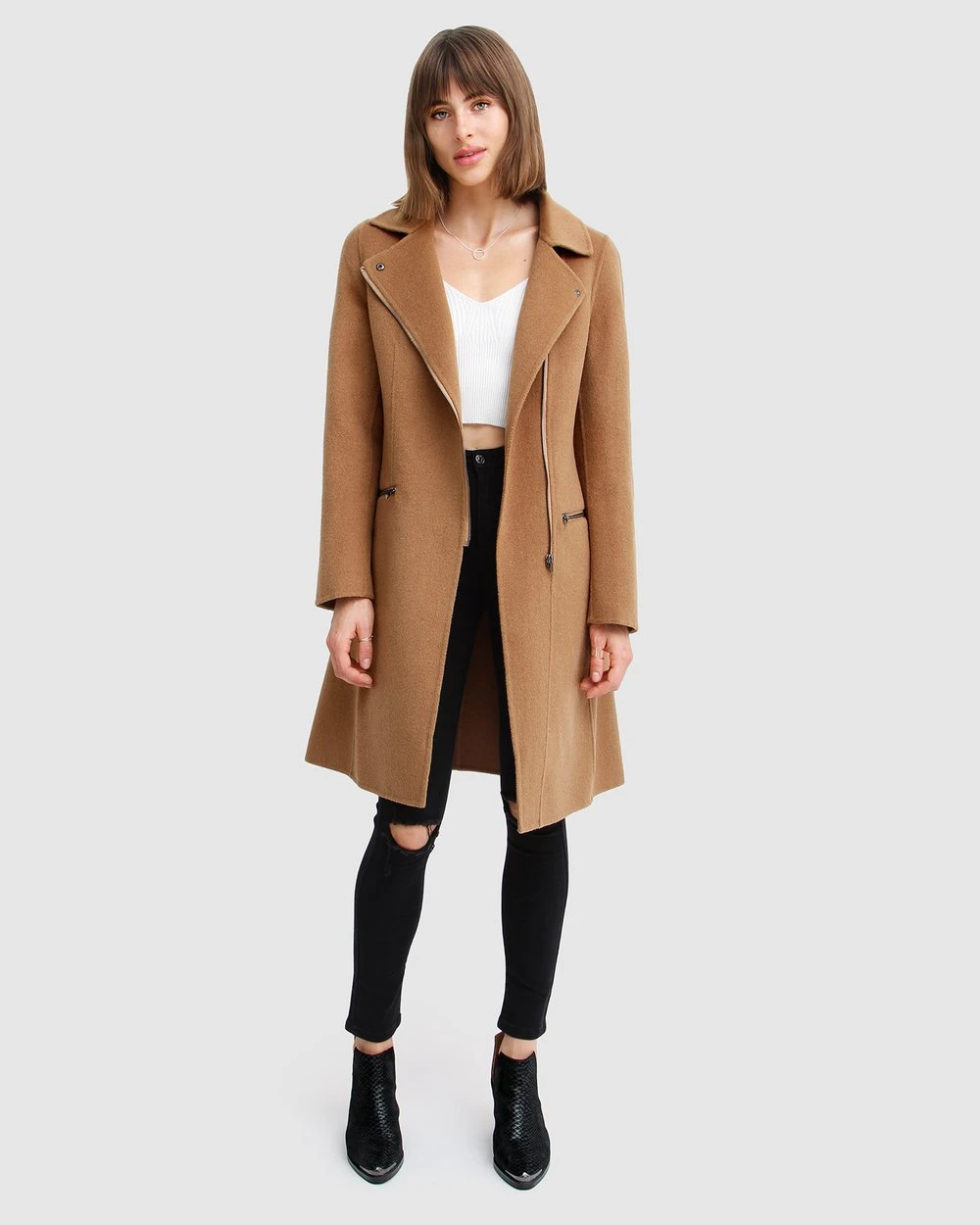 With a dressier take on the biker style jacket, the Last Chance Wool Blend Moto Coat by Belle & Bloom is crafted with all the classic moto details. It features an asymmetrical zip with all the hardware to add some bling to your winter style.