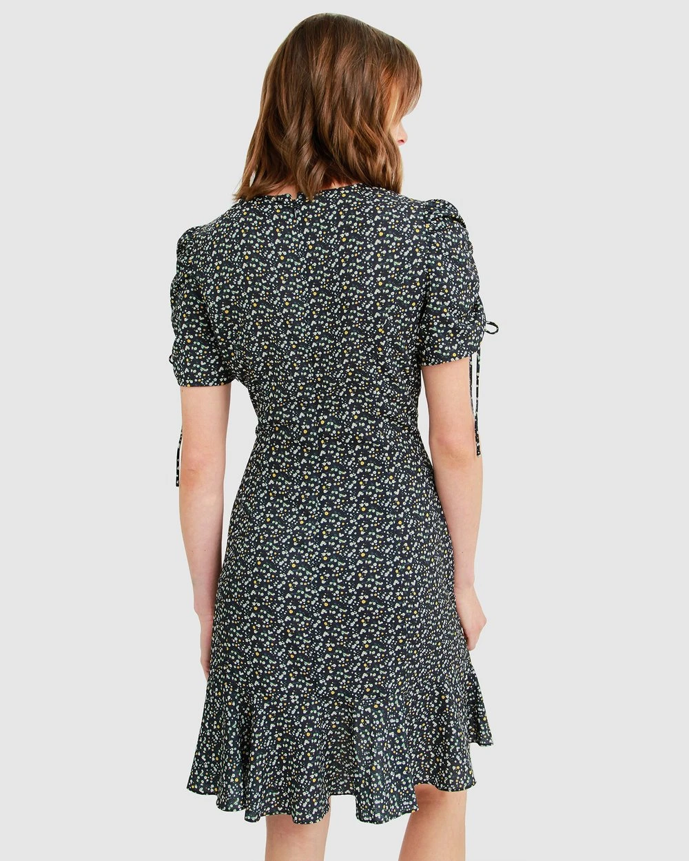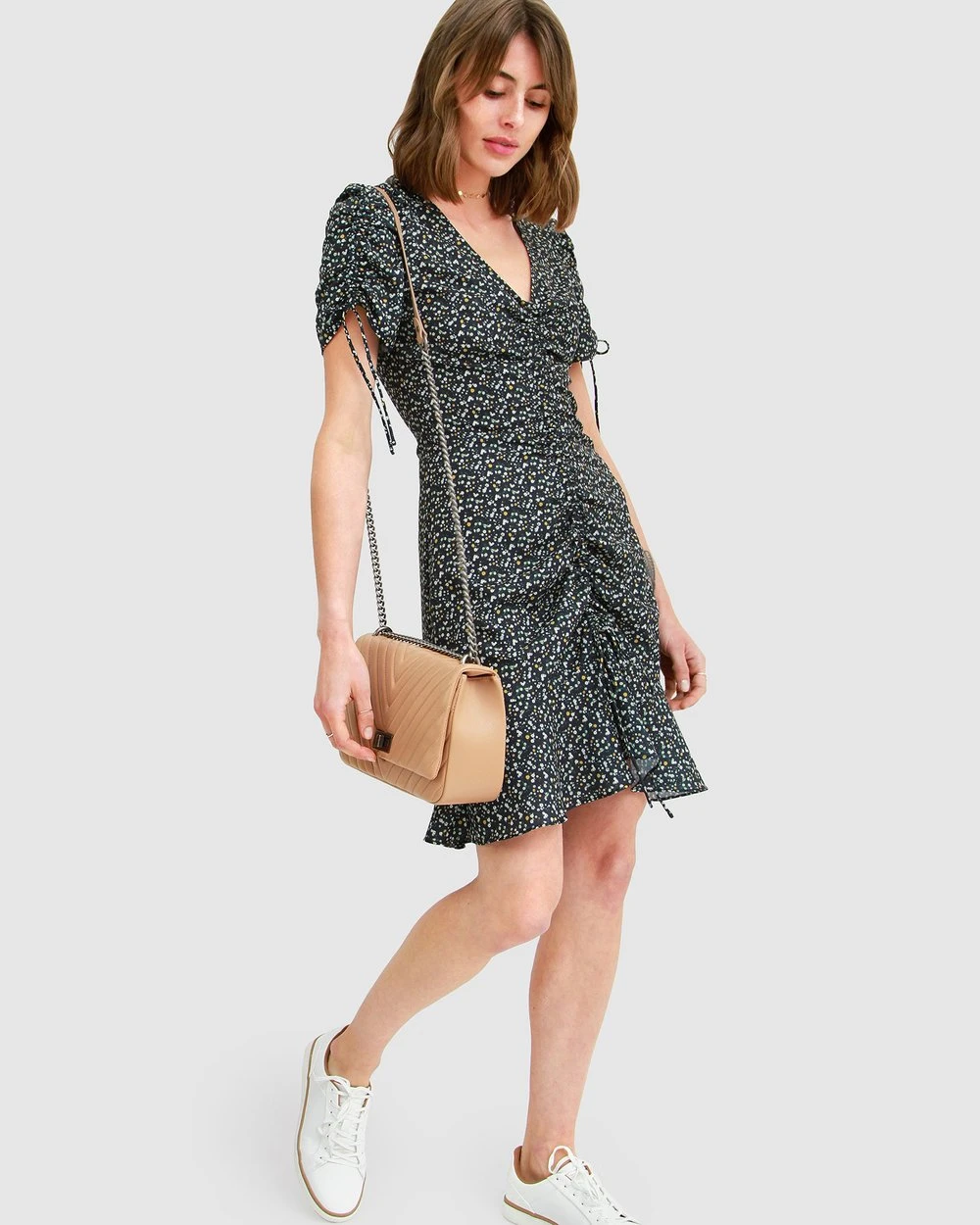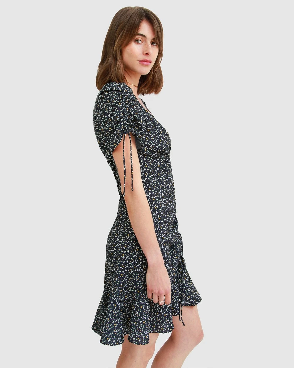 Emphasizing all the right curves, the Penny Lane Rouched Mini Dress by Belle & Bloom is beautifully styled with puffed sleeves and a ruffle at the hem. The rouching can be controlled to your liking with delicate drawstrings to best suit your shape.