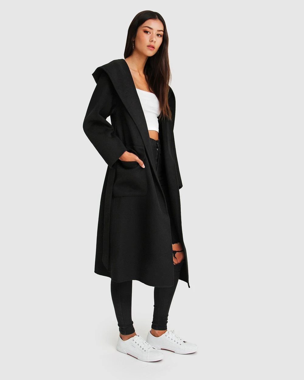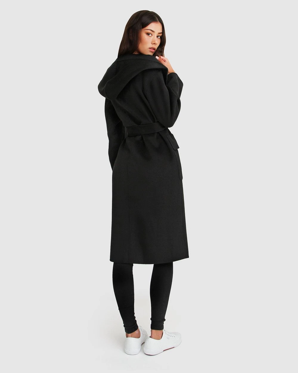 The Runaway Wool Blend Robe Coat by Belle & Bloom features an upgraded version the iconic robe coat with an oversized hood and functional pockets secured with a flap. It transitions easily from casual to glam by drawing the silhouette in with a self-tie belt.