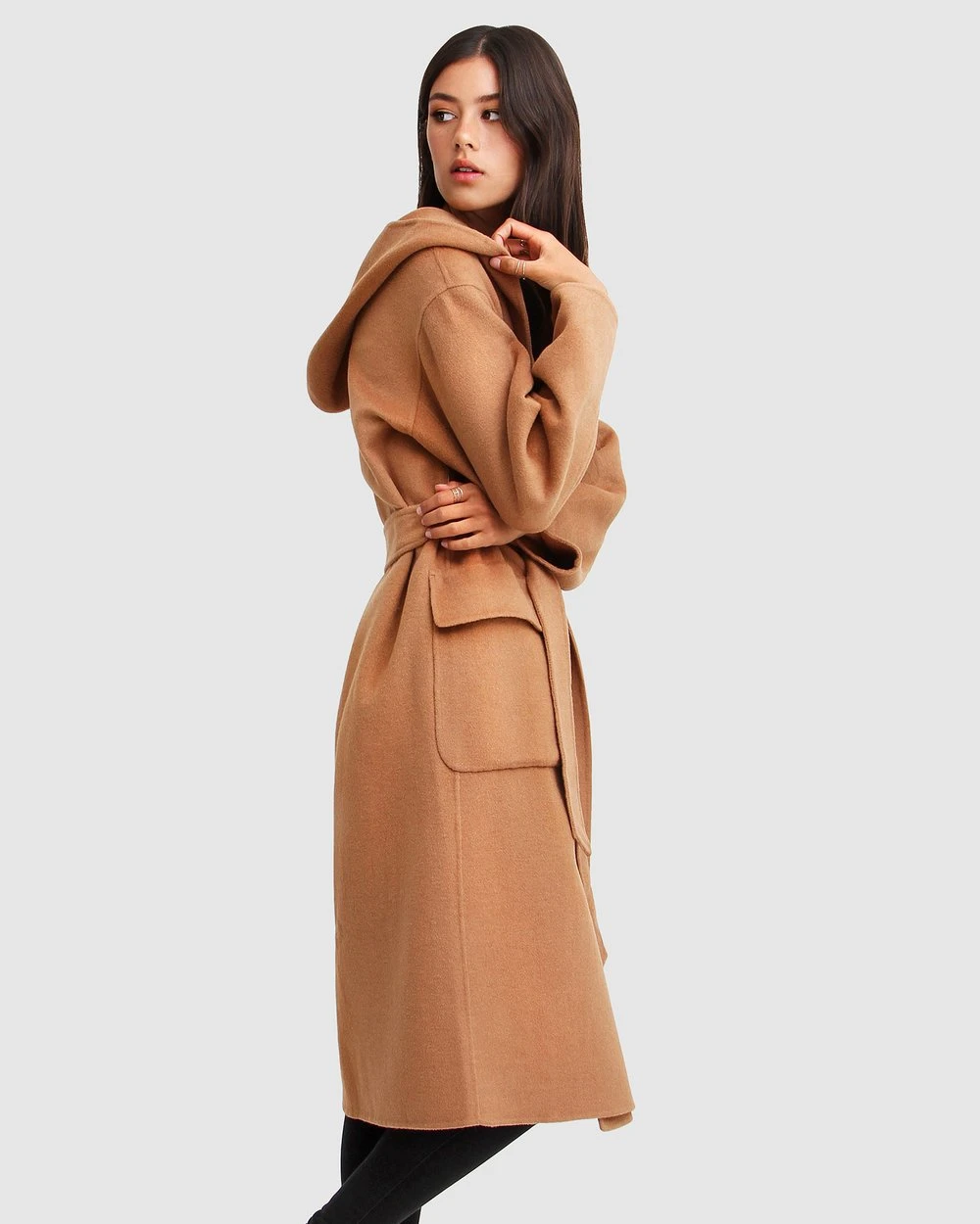The Runaway Wool Blend Robe Coat by Belle & Bloom features an upgraded version the iconic robe coat with an oversized hood and functional pockets secured with a flap. It transitions easily from casual to glam by drawing the silhouette in with a self-tie belt.