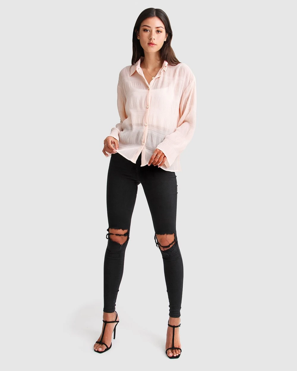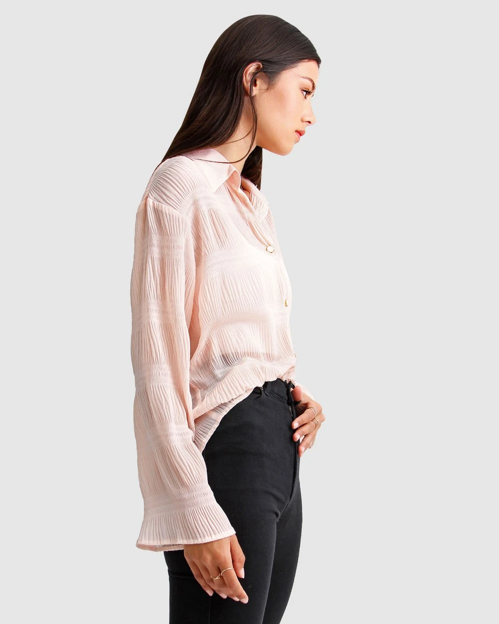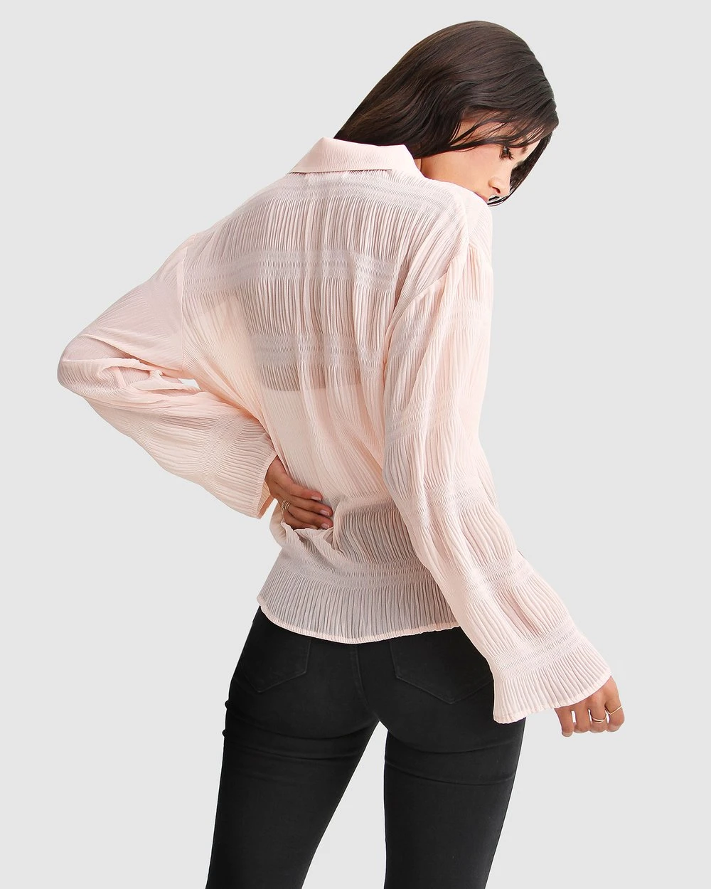 Beautifully textured with broomstick pleated chiffon, the Yoko Shirred Chiffon Blouse by Belle & Bloom is the feminine take on the classic button-down shirt. This workwear top features bell sleeves and elegant buttons, perfect for elevating your everyday basics.