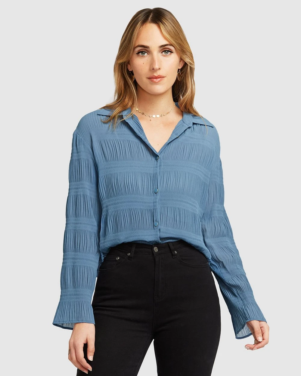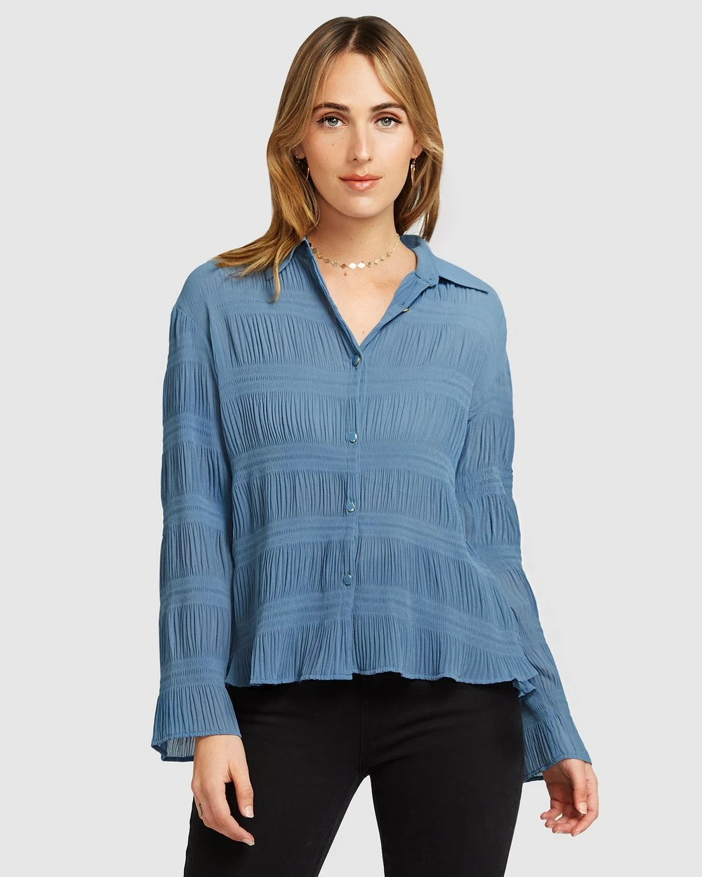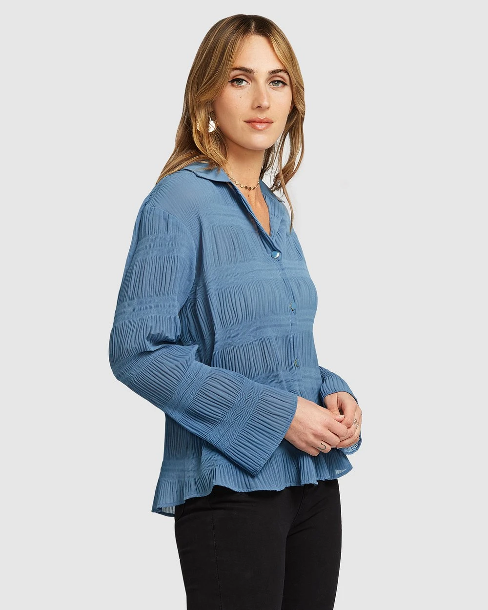 Beautifully textured with broomstick pleated chiffon, the Yoko Shirred Chiffon Blouse by Belle & Bloom is the feminine take on the classic button-down shirt. This workwear top features bell sleeves and elegant buttons, perfect for elevating your everyday basics.