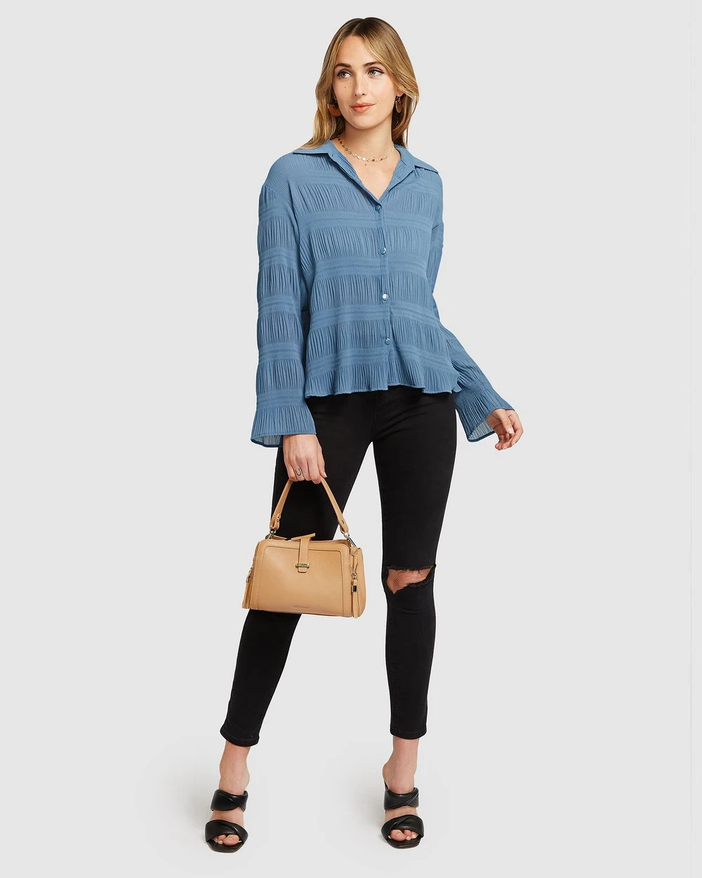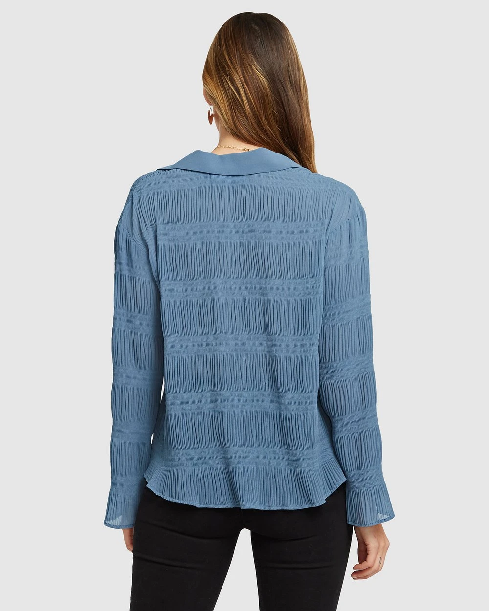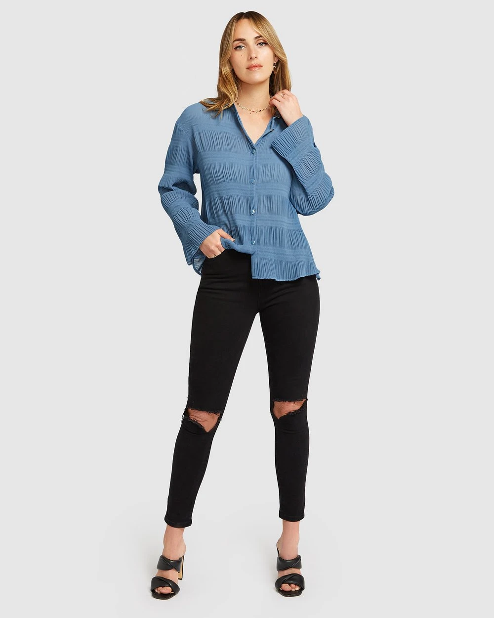 Beautifully textured with broomstick pleated chiffon, the Yoko Shirred Chiffon Blouse by Belle & Bloom is the feminine take on the classic button-down shirt. This workwear top features bell sleeves and elegant buttons, perfect for elevating your everyday basics.