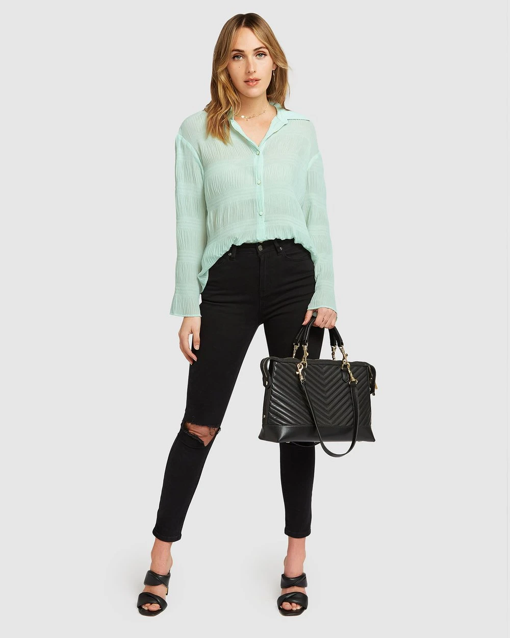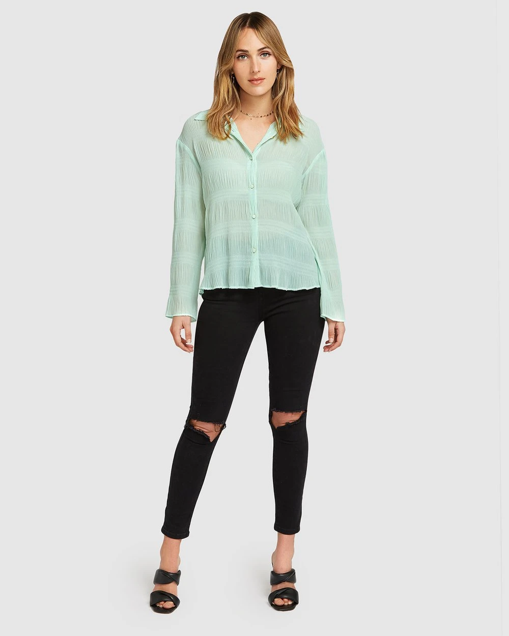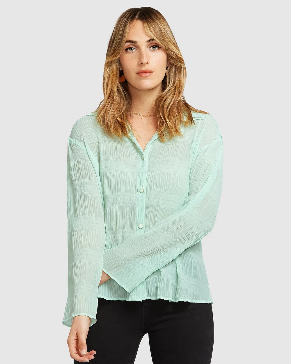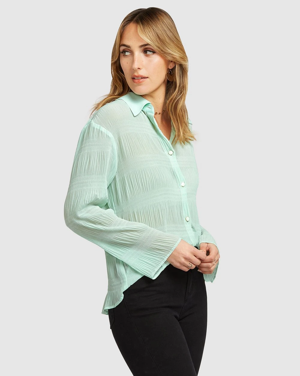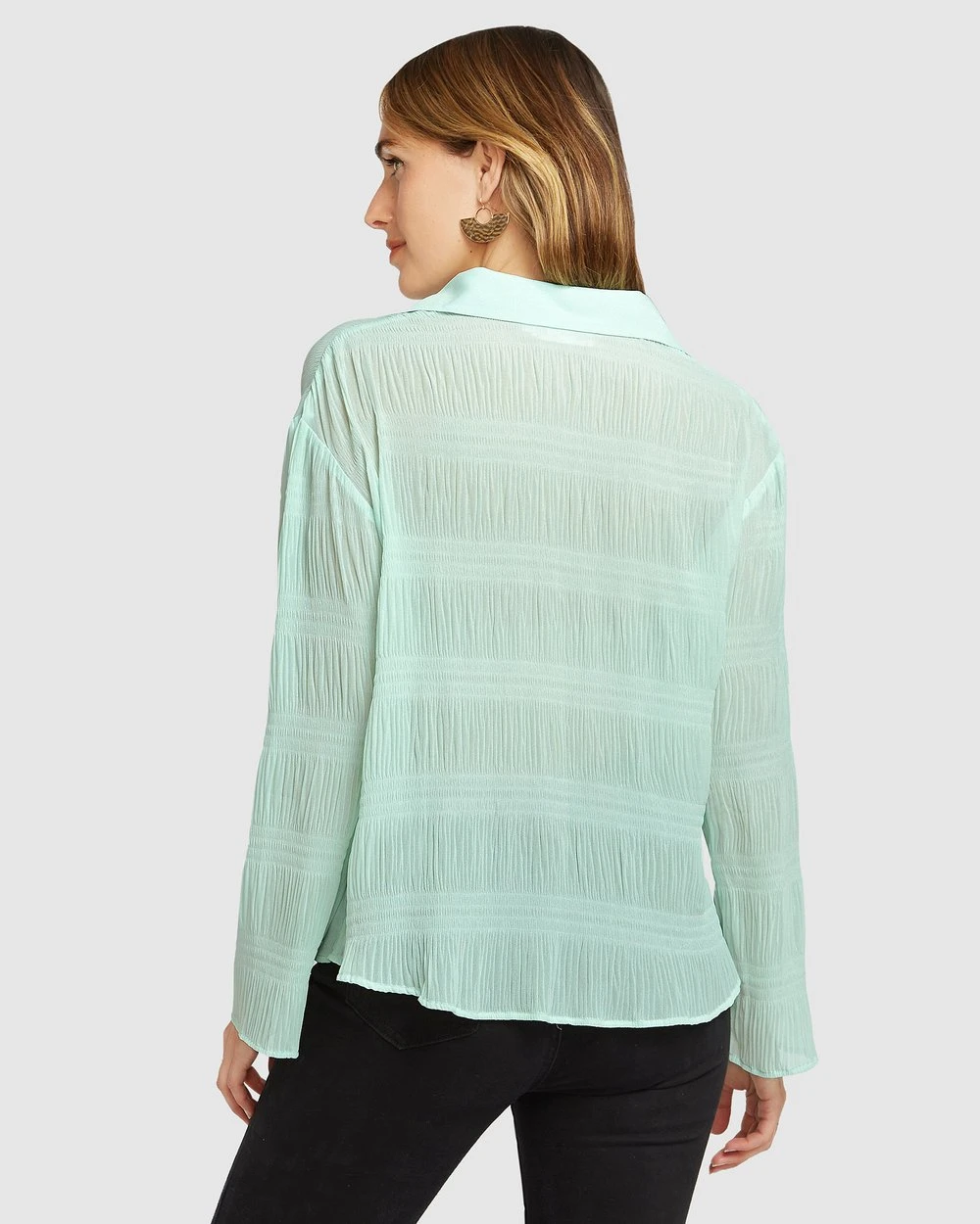 Beautifully textured with broomstick pleated chiffon, the Yoko Shirred Chiffon Blouse by Belle & Bloom is the feminine take on the classic button-down shirt. This workwear top features bell sleeves and elegant buttons, perfect for elevating your everyday basics.