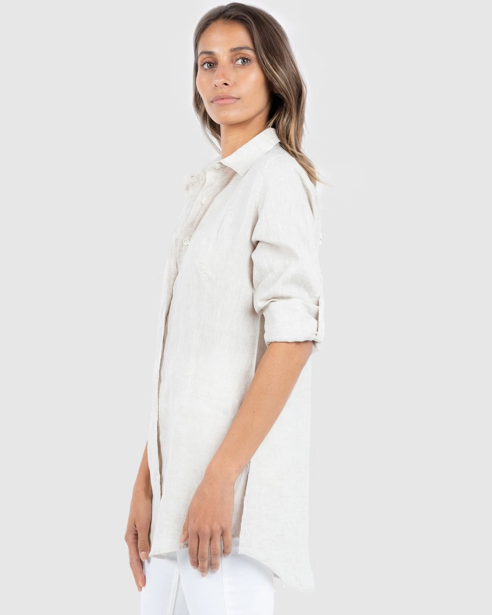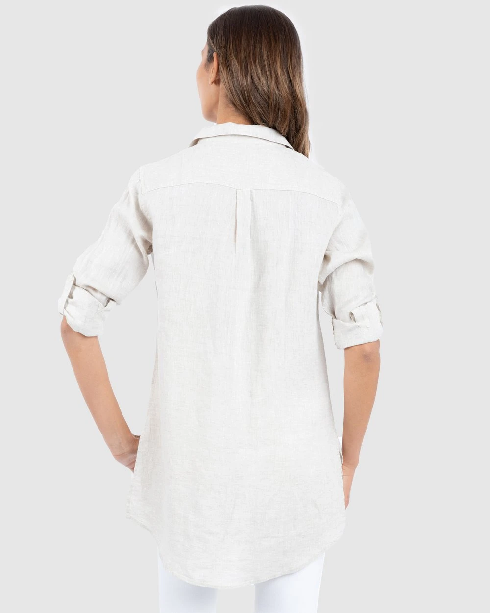 This comfortable Gaia Oat airy tunic by CAMIXA is a modern take on the classic shirt-dress. Keeping you cool and right on trend, this pure linen treat will become a favourite go to in your wardrobe. Gently relaxed with sleeve tabs, hi-low to hide all the things that needs to hide, it’s great with leggings or trousers as it falls over your hips. Made with soft mid-weight pure linen it features a full-length button closure, side slits and a longer back.