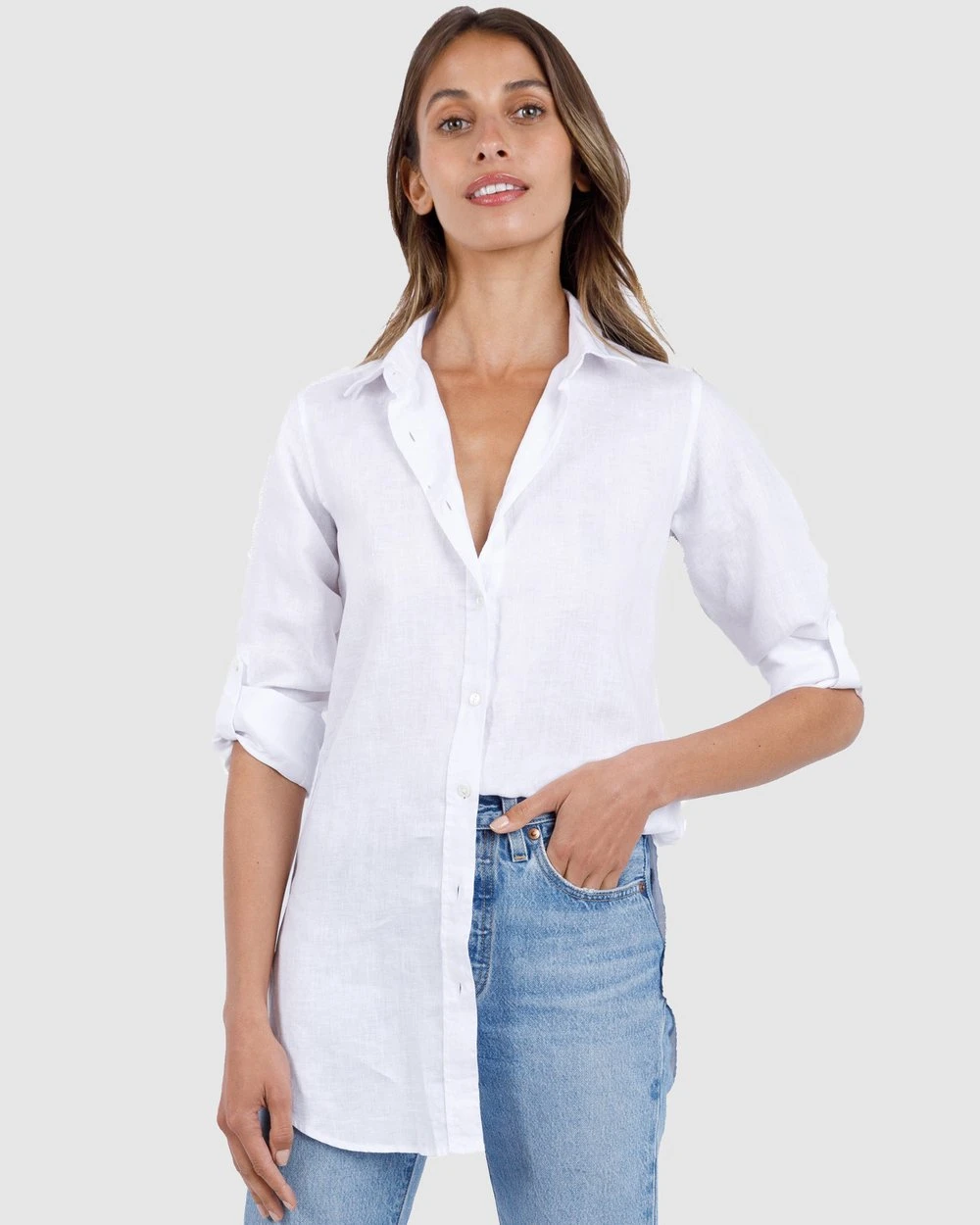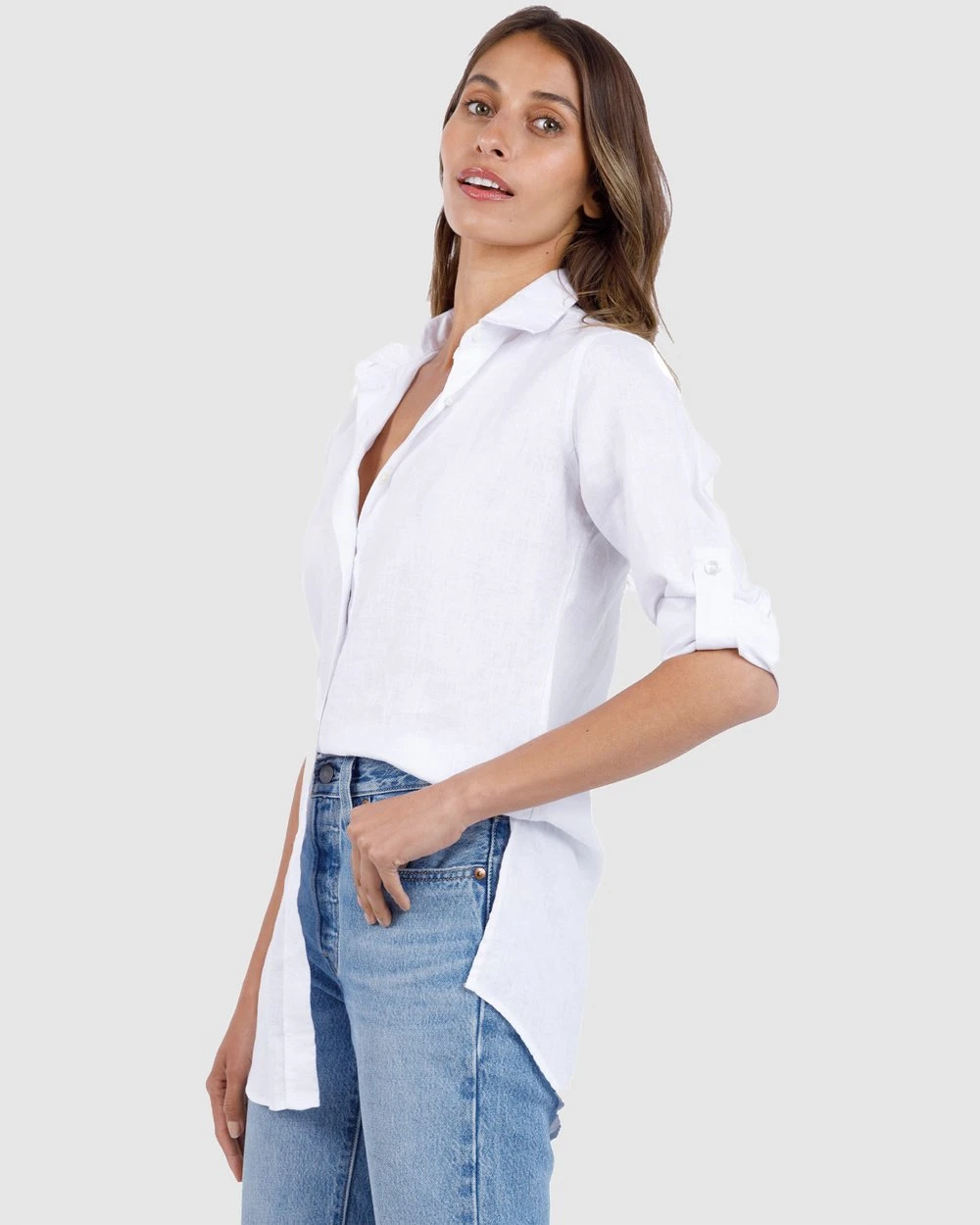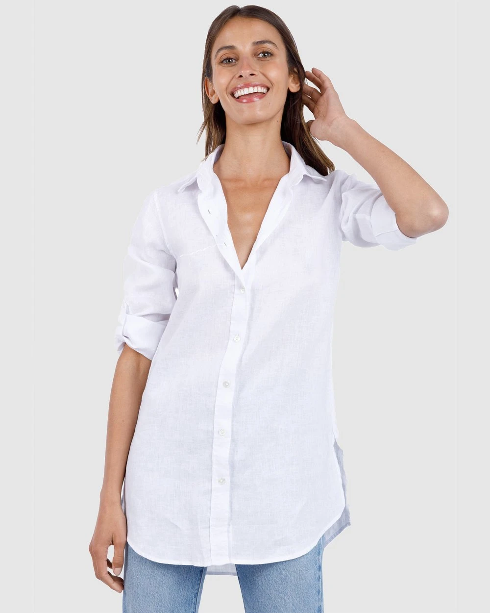 This comfortable and airy Gaia White tunic by CAMIXA is a modern take on the classic shirt-dress. Keeping you cool and right on trend, this pure linen treat will become a favourite go to in your wardrobe. Gently relaxed with sleeve tabs, hi-low to hide all the things that needs to hide, it’s great with leggings or trousers as it falls over your hips. Made with soft mid-weight pure linen it features a full-length button closure, long side slits to knot the front and a longer back.