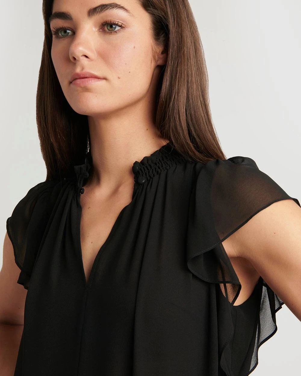 – High neckline with shirred detail
