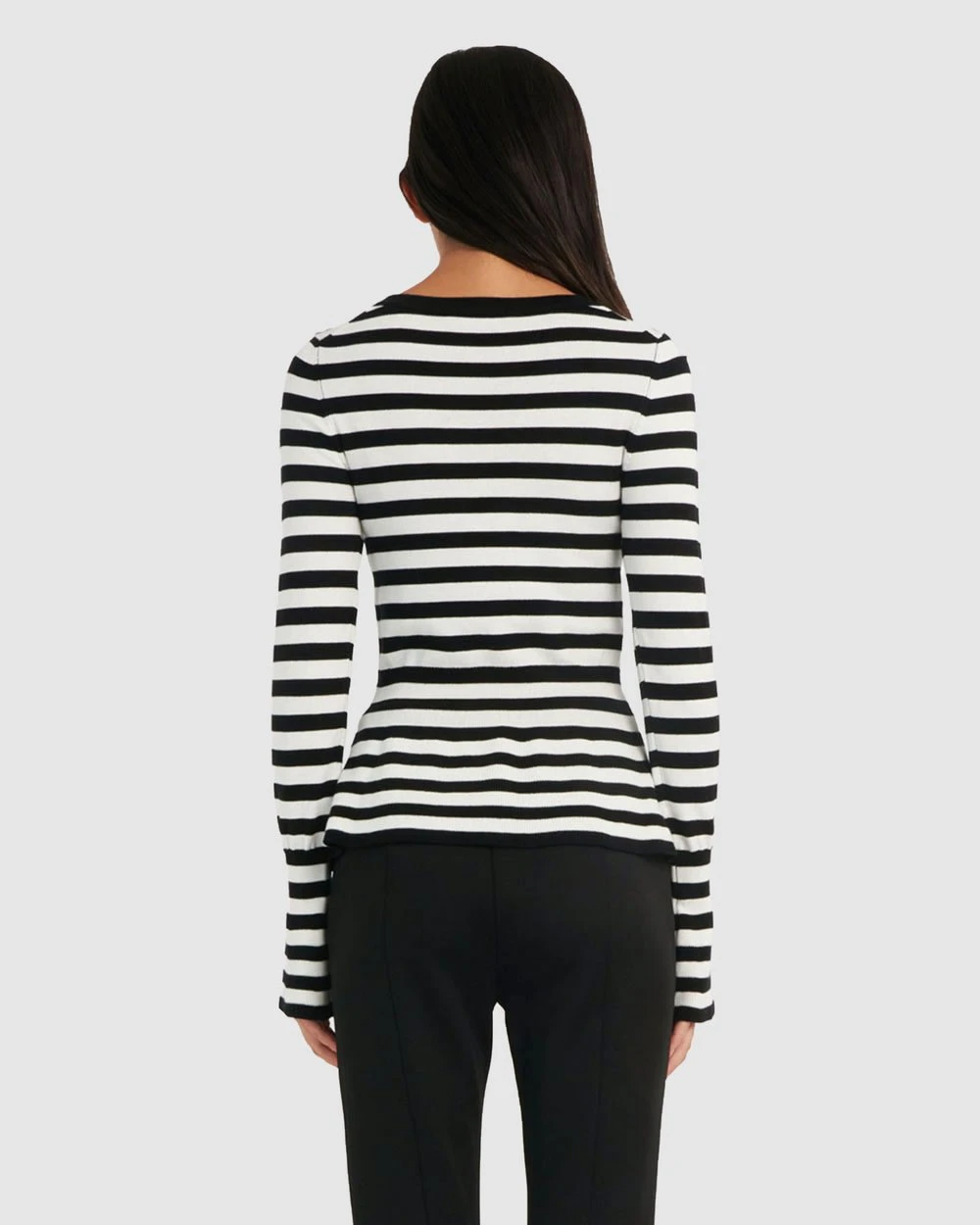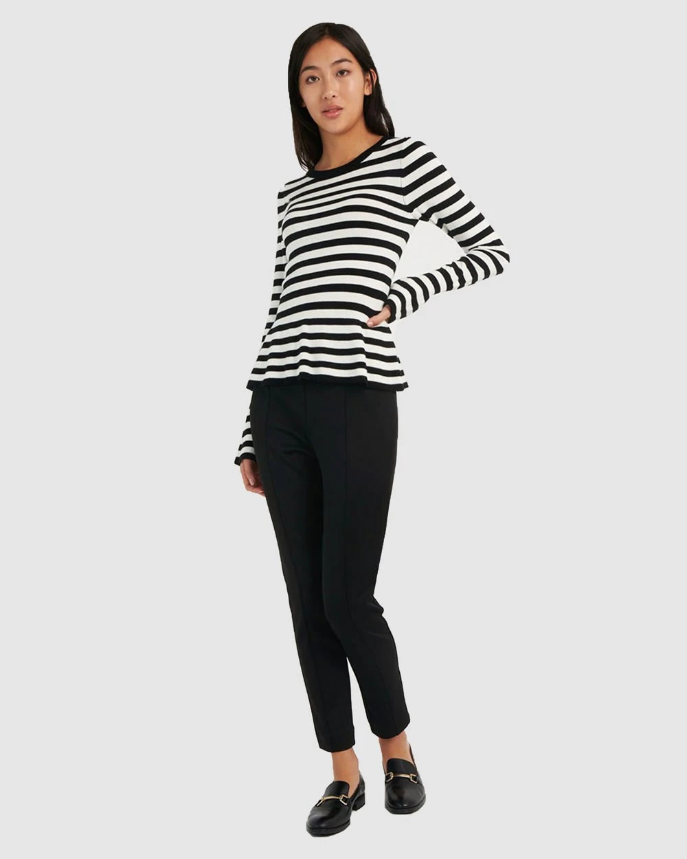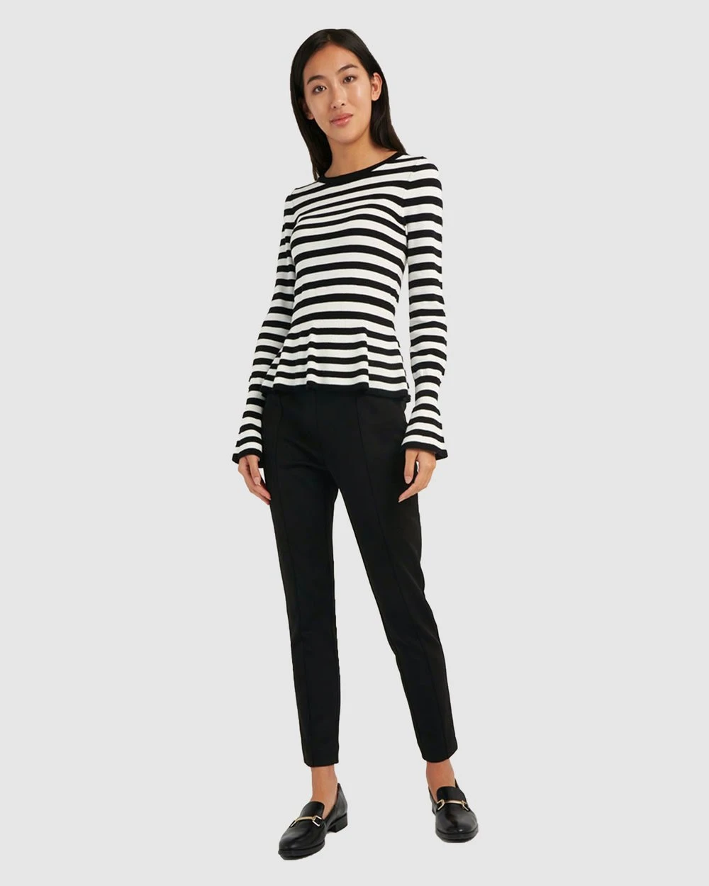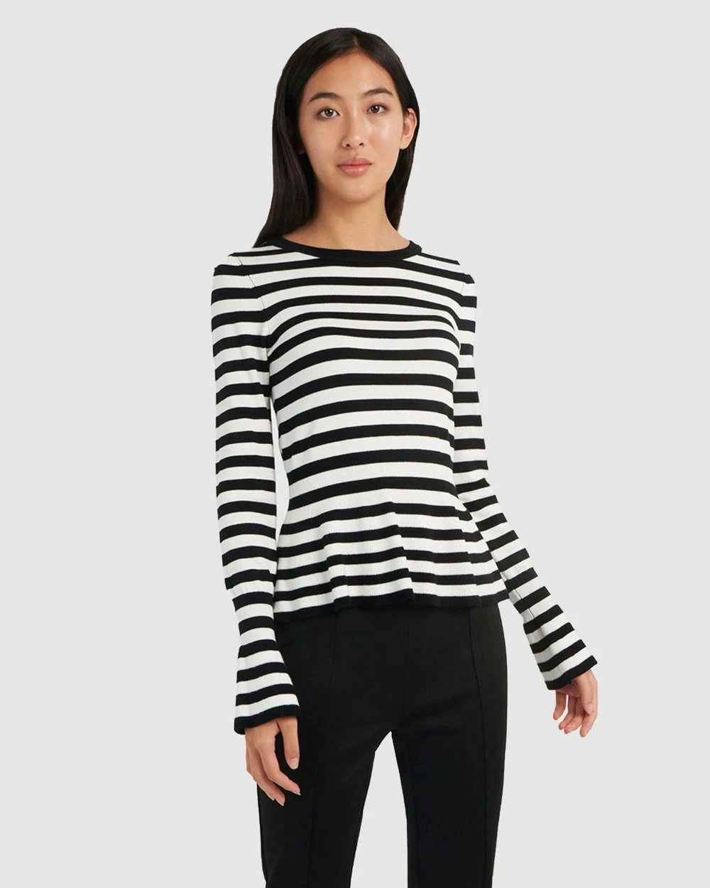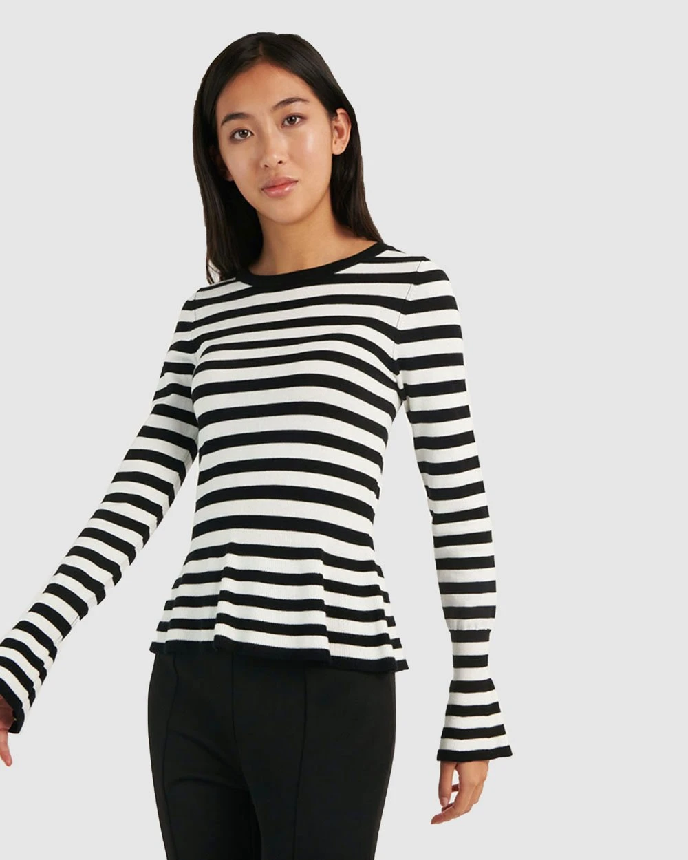 Classy and contemporary, the Belle Pinstripe Peplum Knit is a must have style this season. Featuring black and white stripe throughout with a peplum silhouette and bell sleeves. Pair this feminine design with a classic slim fit pants and heels for an elegant look to take you from day to night on any day of the week.
