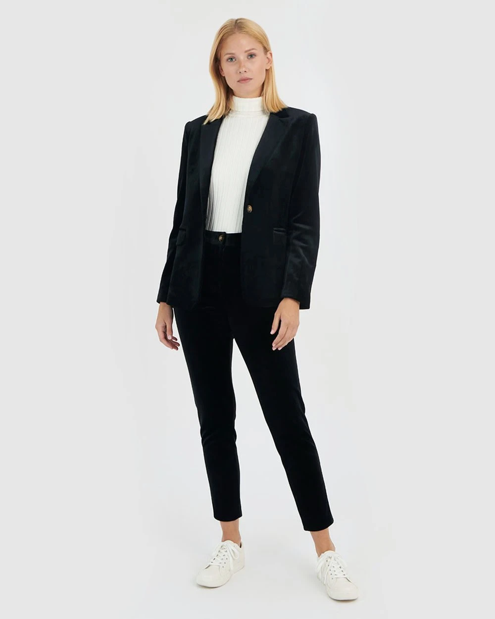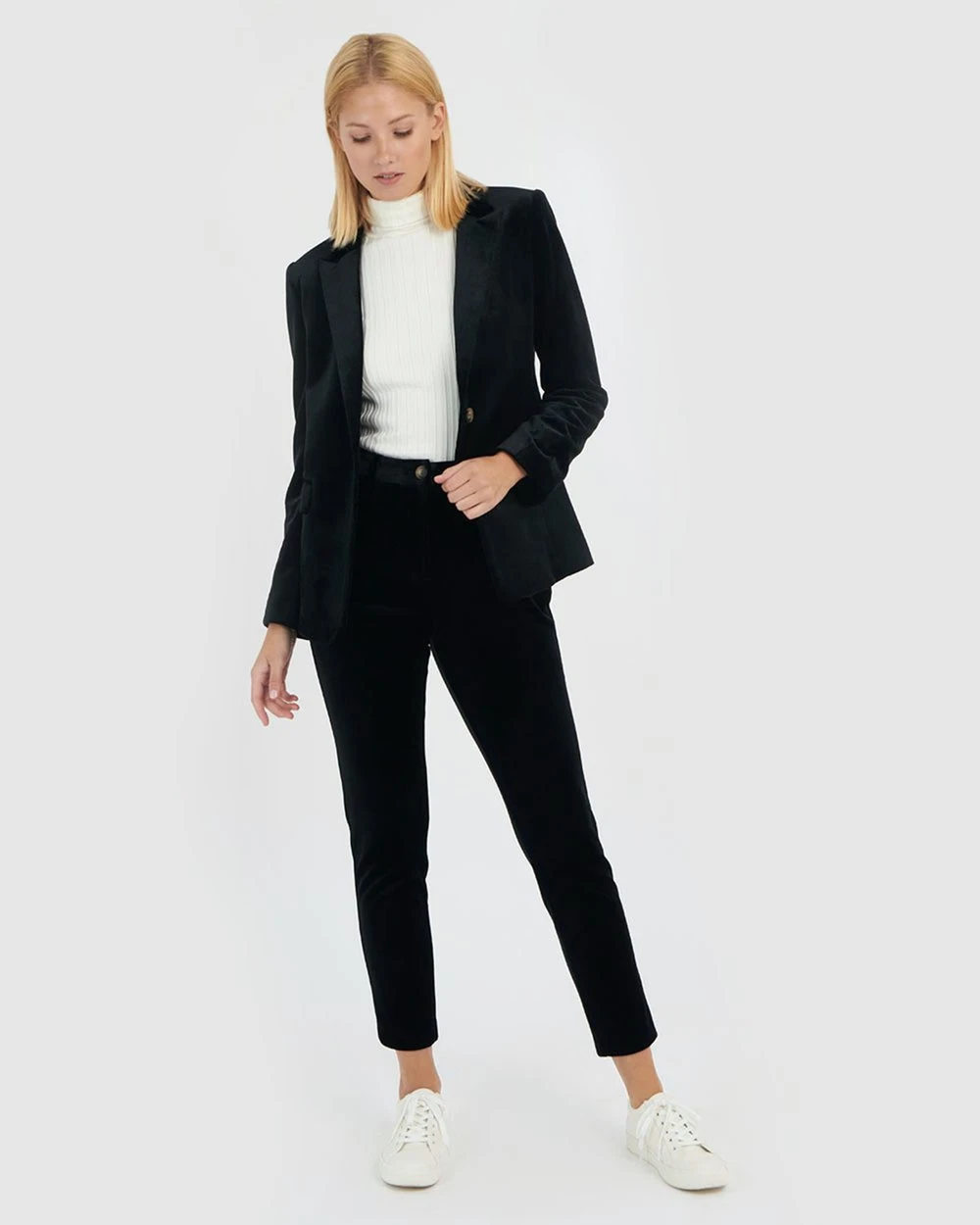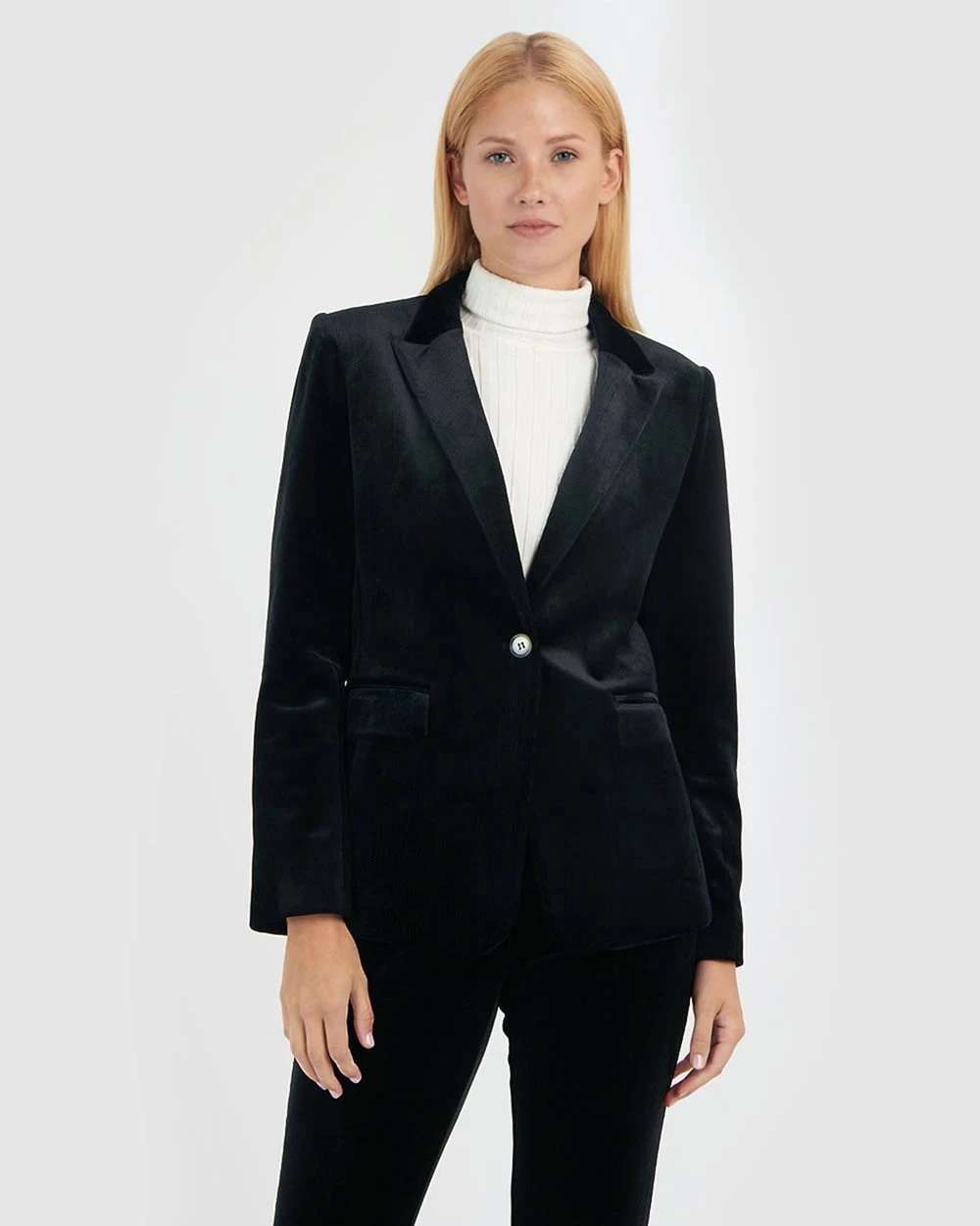The Bentley Corduroy Blazer by Forcast gives the classic blazer a contemporary edge with its soft corduroy fabrication with subtle shine. Whether styled as its own piece or in a set, this design is sure to have you exuding elegance in the office. Wear over a V-neck top and the matching Bentley Corduroy Pants or the Bentley Corduroy Mini Skirt for a trendy corporate look.