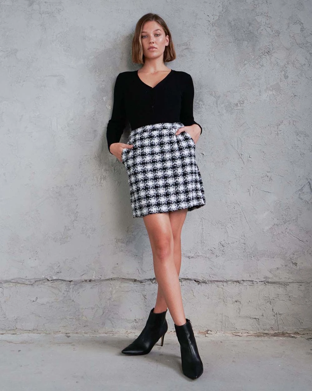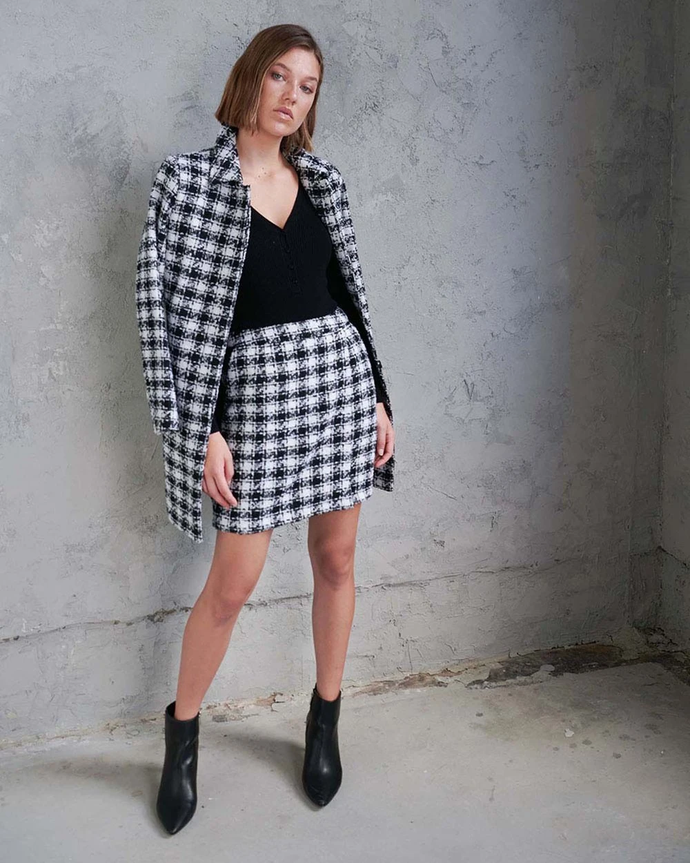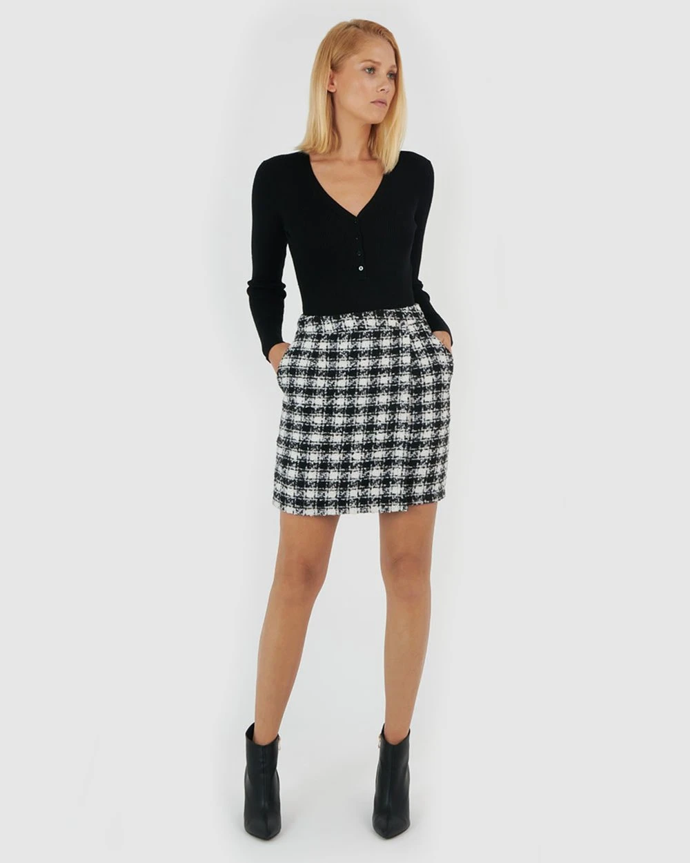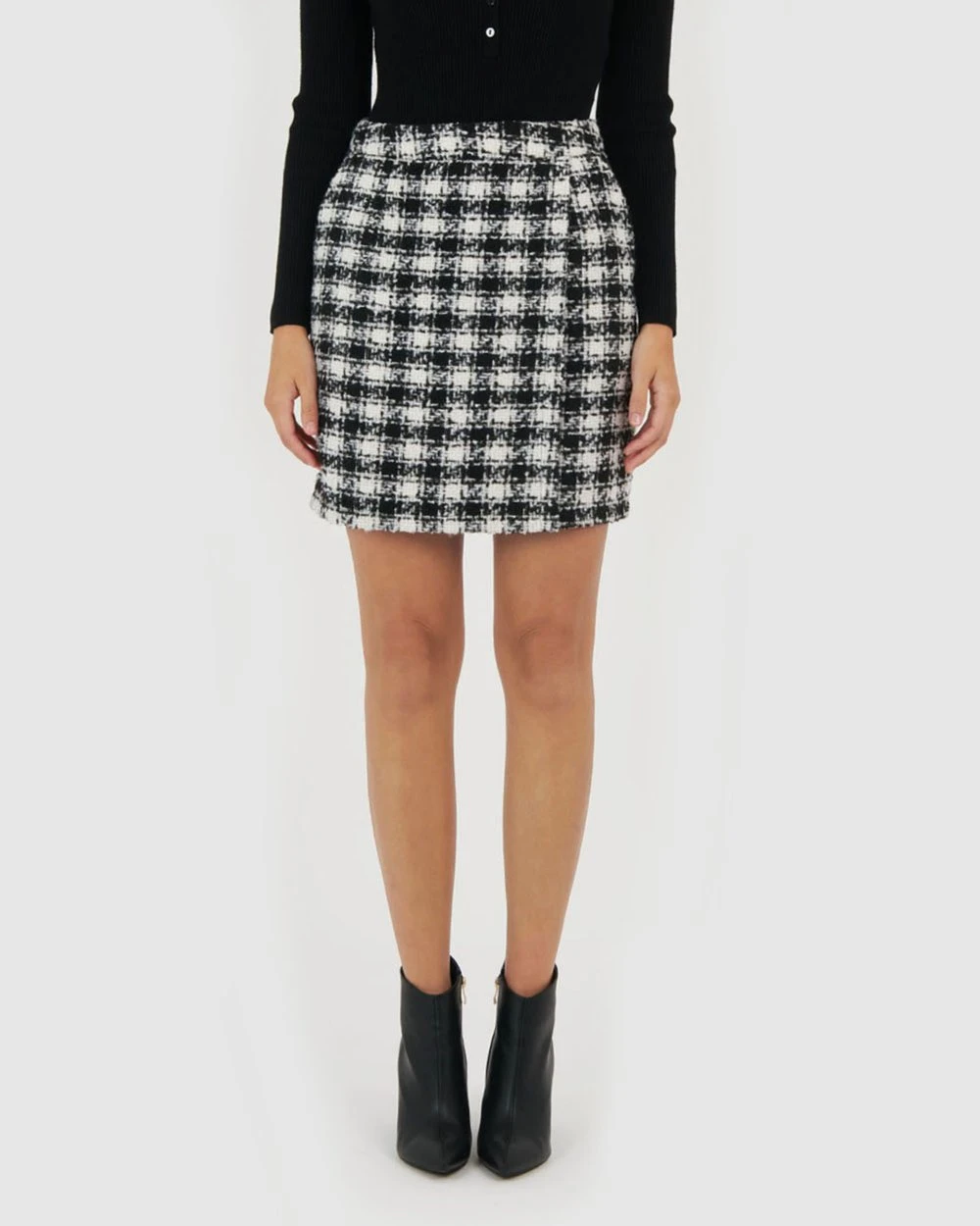 The Brielle Tweed Check Skirt by Forcast is a statement corporate piece, and is sure to be a favourite this season. A mini style with A-line silhouette, featuring faux cross over front with a flattering high waist design. Pair with a light blouse and pumps for the perfect office outfit or complete the set with the Brielle Tweed Check Coat that will keep you comfortable and looking polished throughout the day.