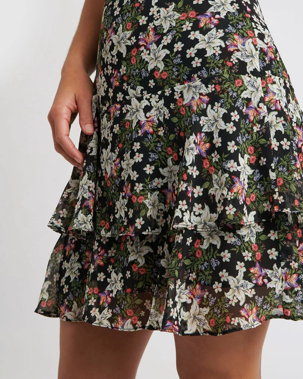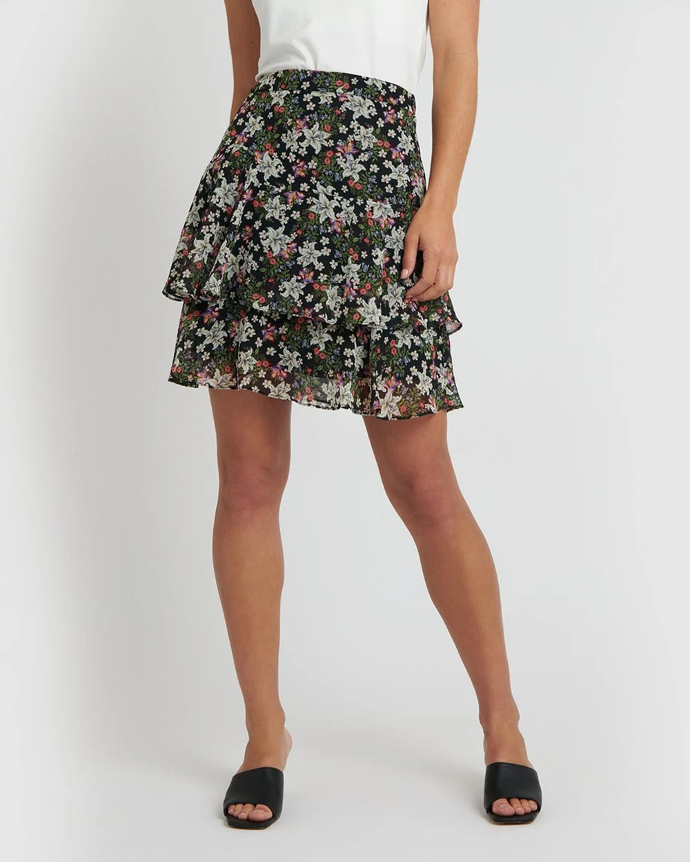 The Carly Mini Skirt by Forcast is a chic addition to any closet with its fun layered frills and floral print. Pair this on-trend design with a basic blouse and heels for a perfectly chic night look.