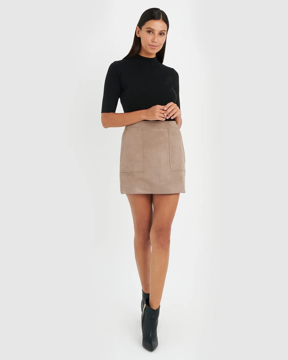 Redefining the mini skirt with the Cassie Mini Skirt by Forcast. The flattering high waist featuring patch pocket detail, A-line silhouette alongside the soft suede like fabrication will accentuate the femininity of the mini skirt. Dress with seasonal blouses or one of our essential tops.
