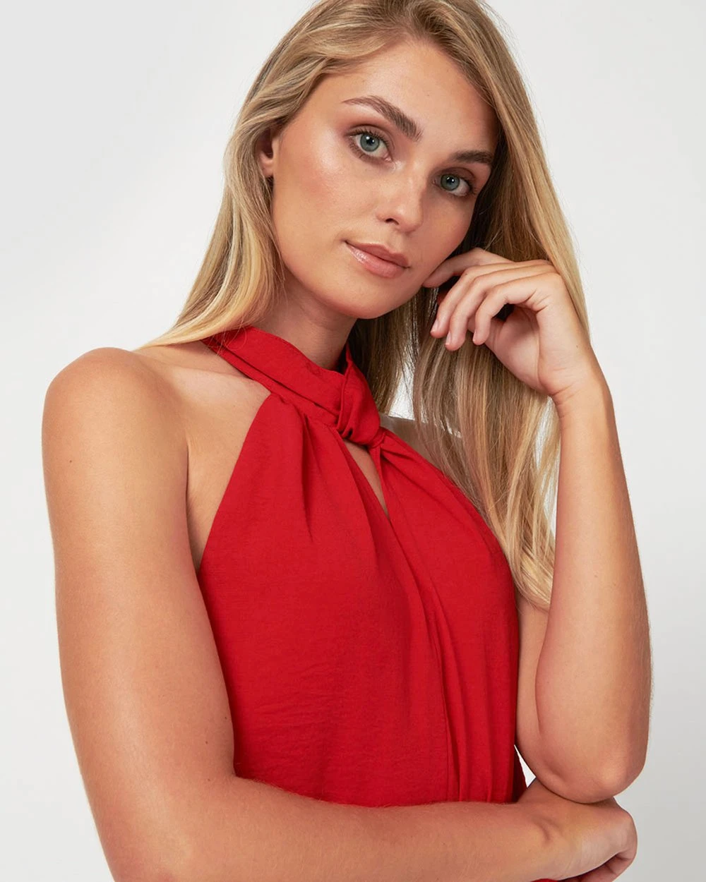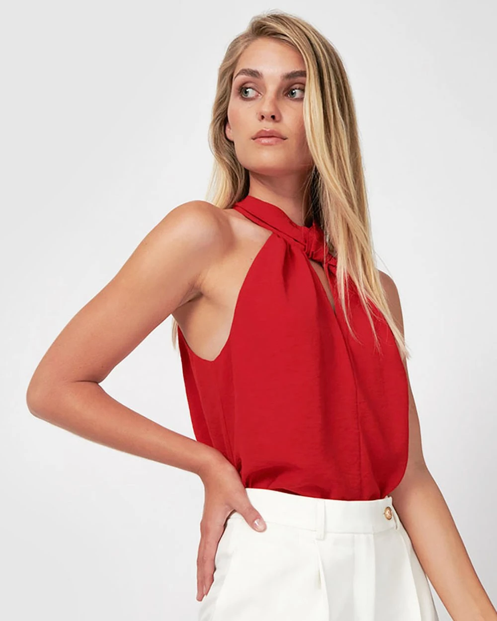 Add a pop of colour to your look in the Dominique Halter Neck Keyhole Top by Forcast. Designed with a flattering halter neckline with a unique keyhole, this style is an elegantly modern piece to add to your style selection. For an edgy day to night look, wear it with high-waisted white pants and strappy heels.