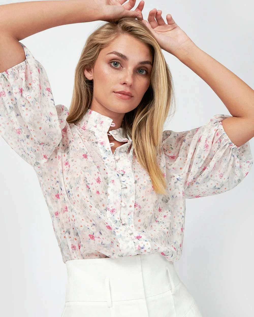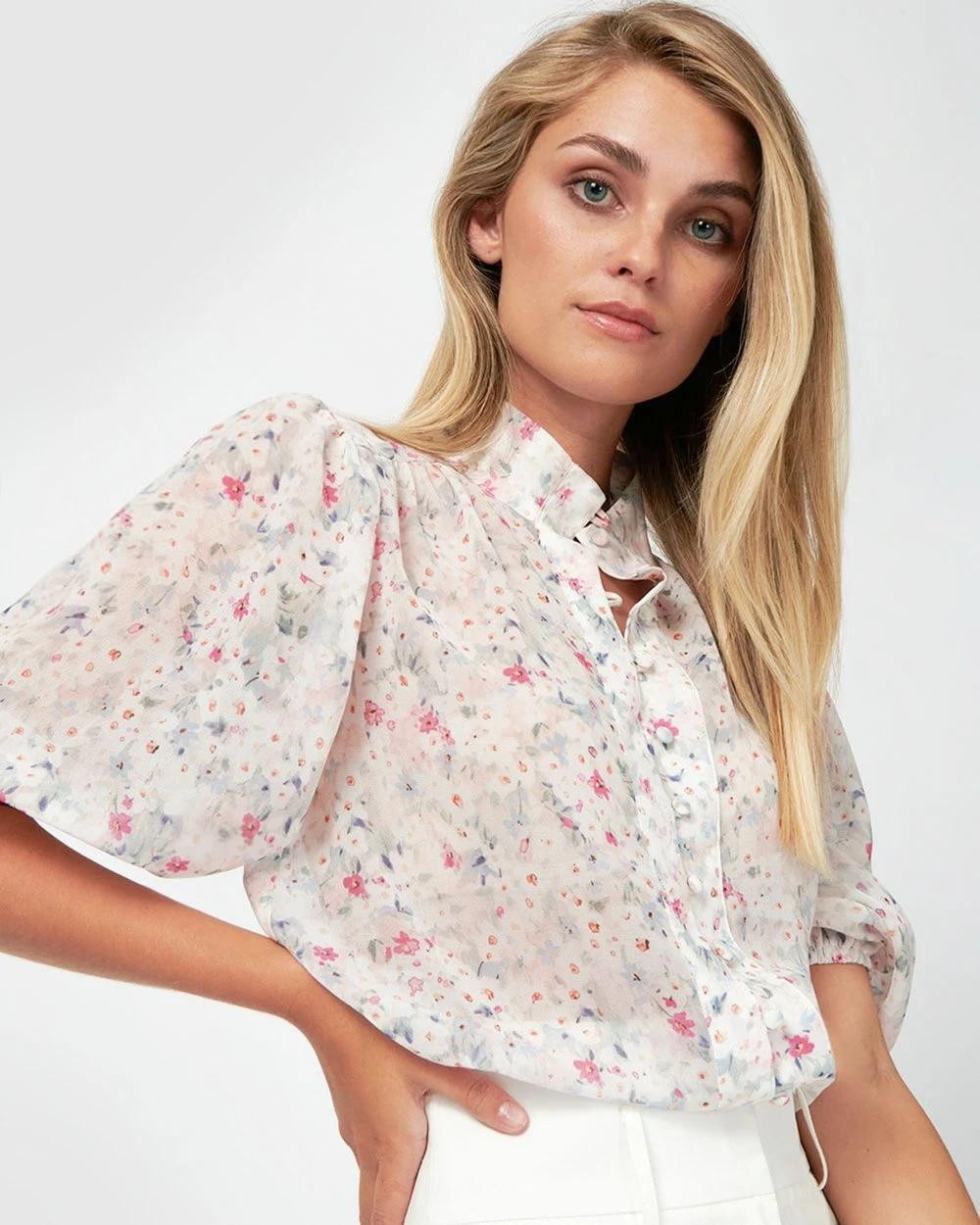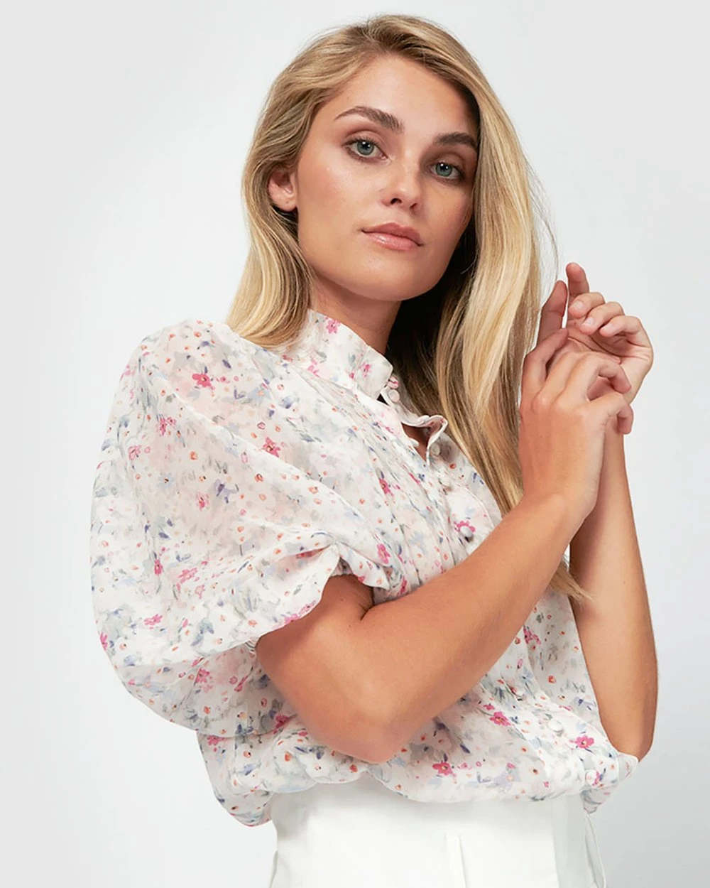 Add a feminine touch to your wardrobe with the Elizabeth Button Up Puff Sleeve Blouse by Forcast. Featuring dreamy floral print with dramatic puff sleeves in a button-down design, making it an easy day to night look this summer. Style it with slim pants and strappy mules for an on-trend, casual chic finish.