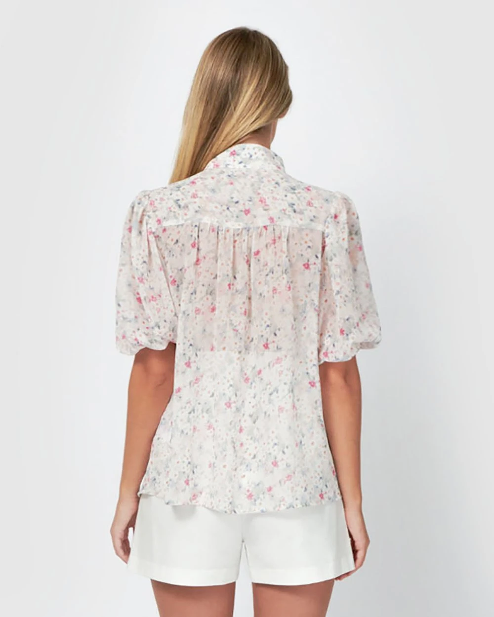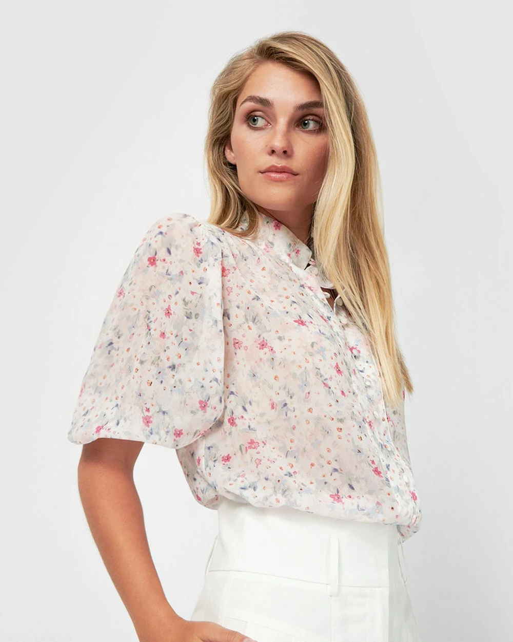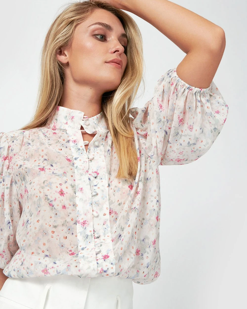 Add a feminine touch to your wardrobe with the Elizabeth Button Up Puff Sleeve Blouse by Forcast. Featuring dreamy floral print with dramatic puff sleeves in a button-down design, making it an easy day to night look this summer. Style it with slim pants and strappy mules for an on-trend, casual chic finish.