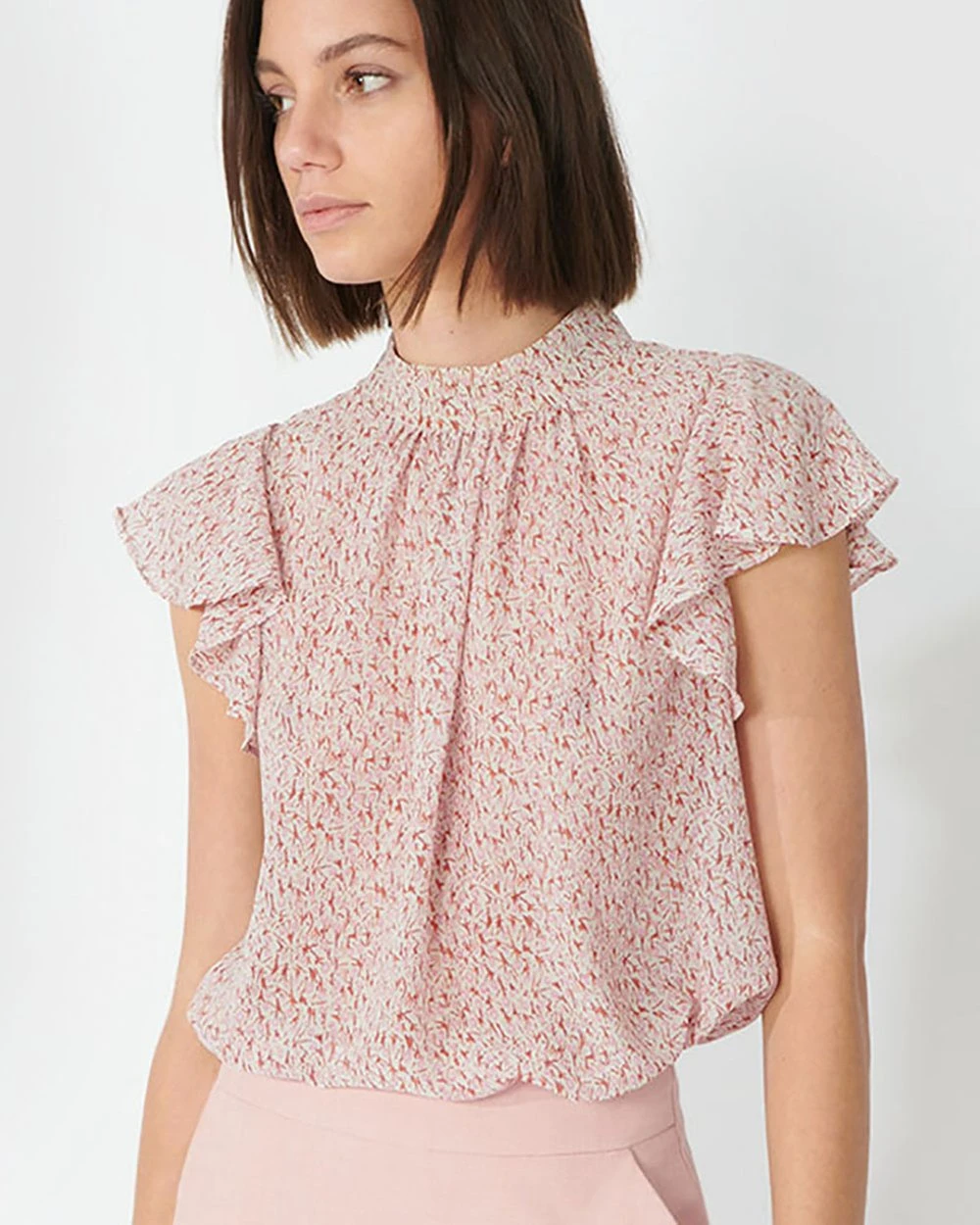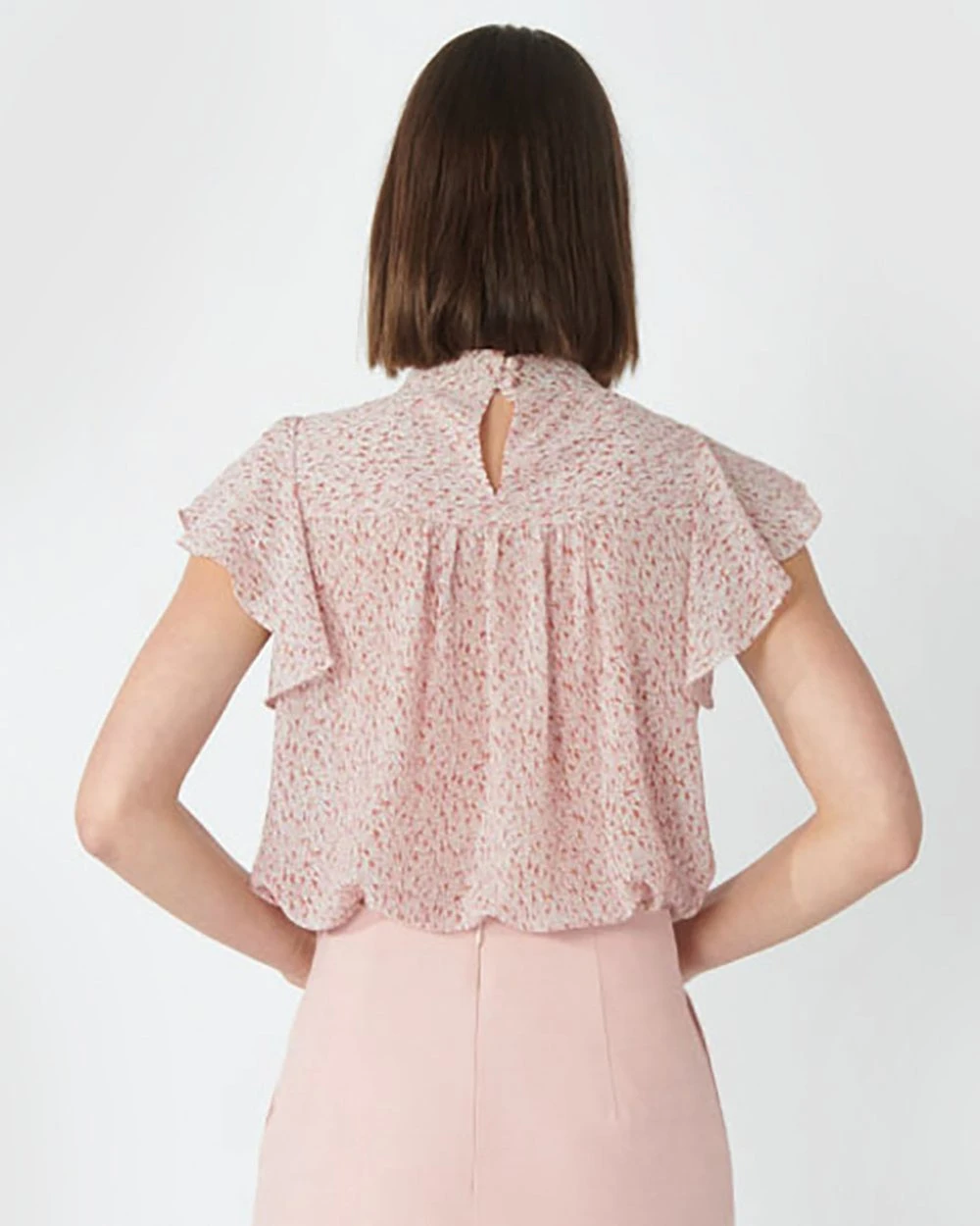 – High neckline with gathered details