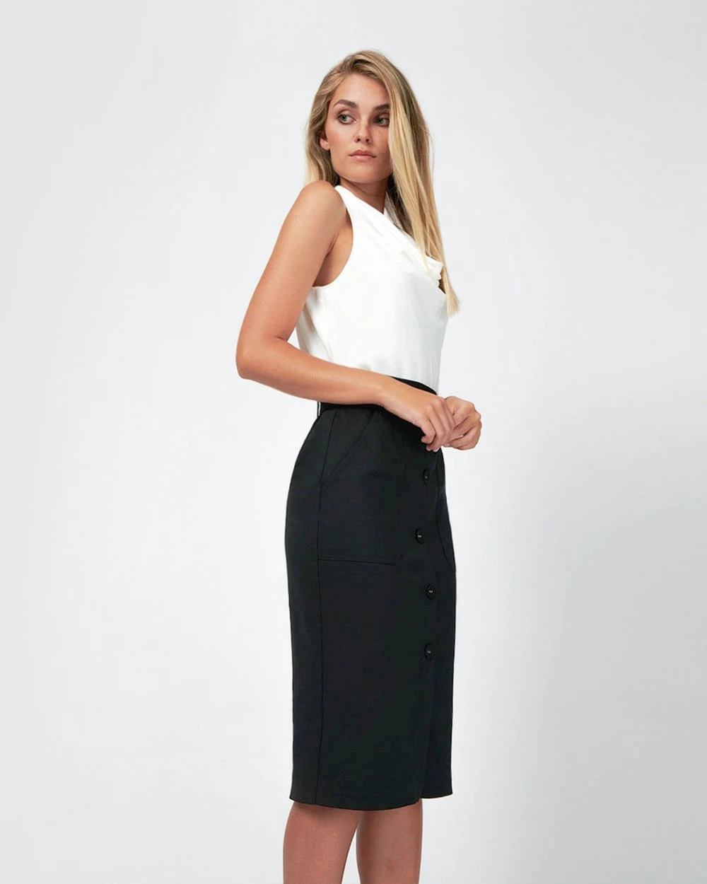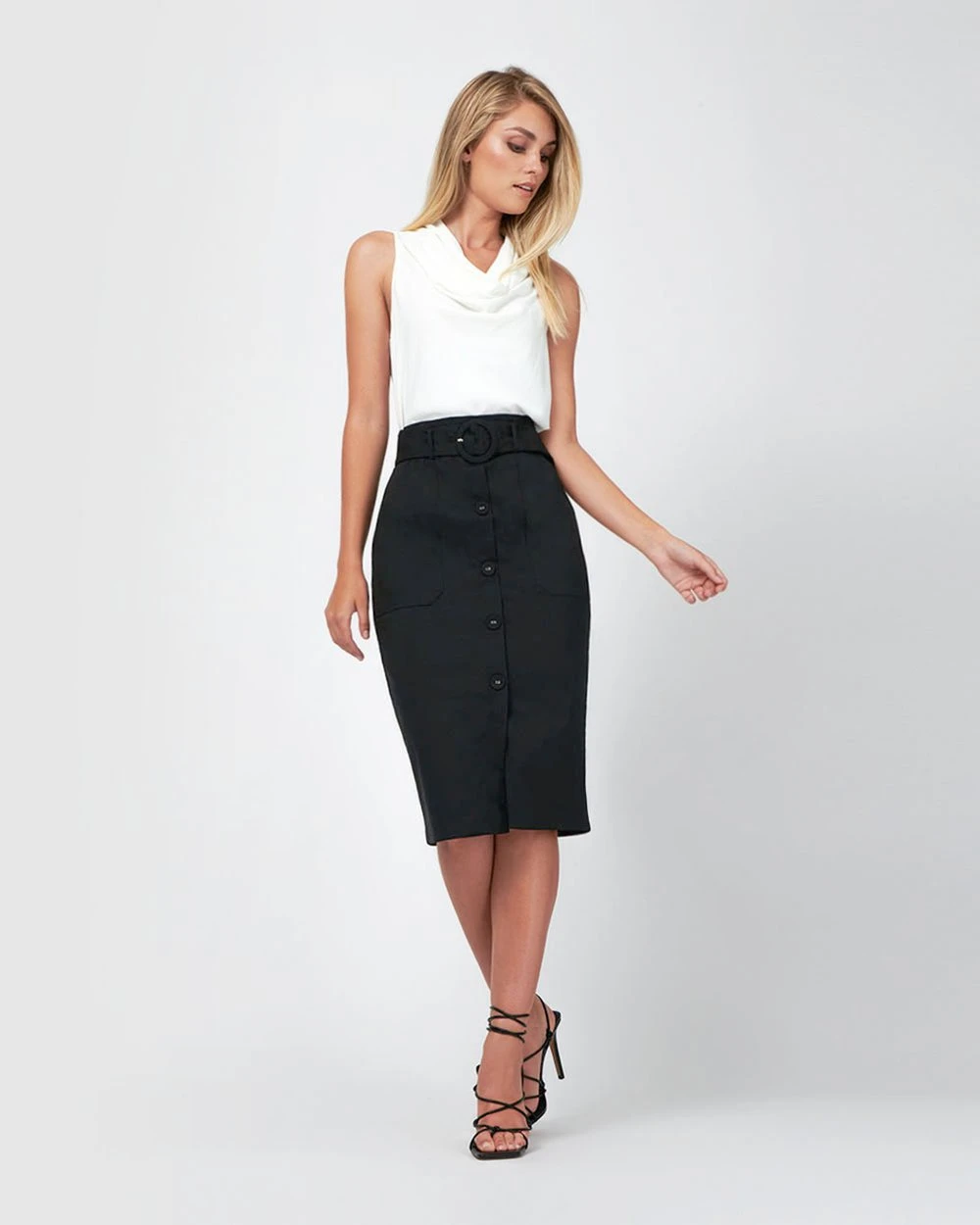 Getting ready for work is easy with the Erika Button Up Skirt by Forcast, featuring button down details and matching belt in a pencil silhouette. Styled with a fitted basic top, this modern design will take you from desk to dinner looking chic and classy.