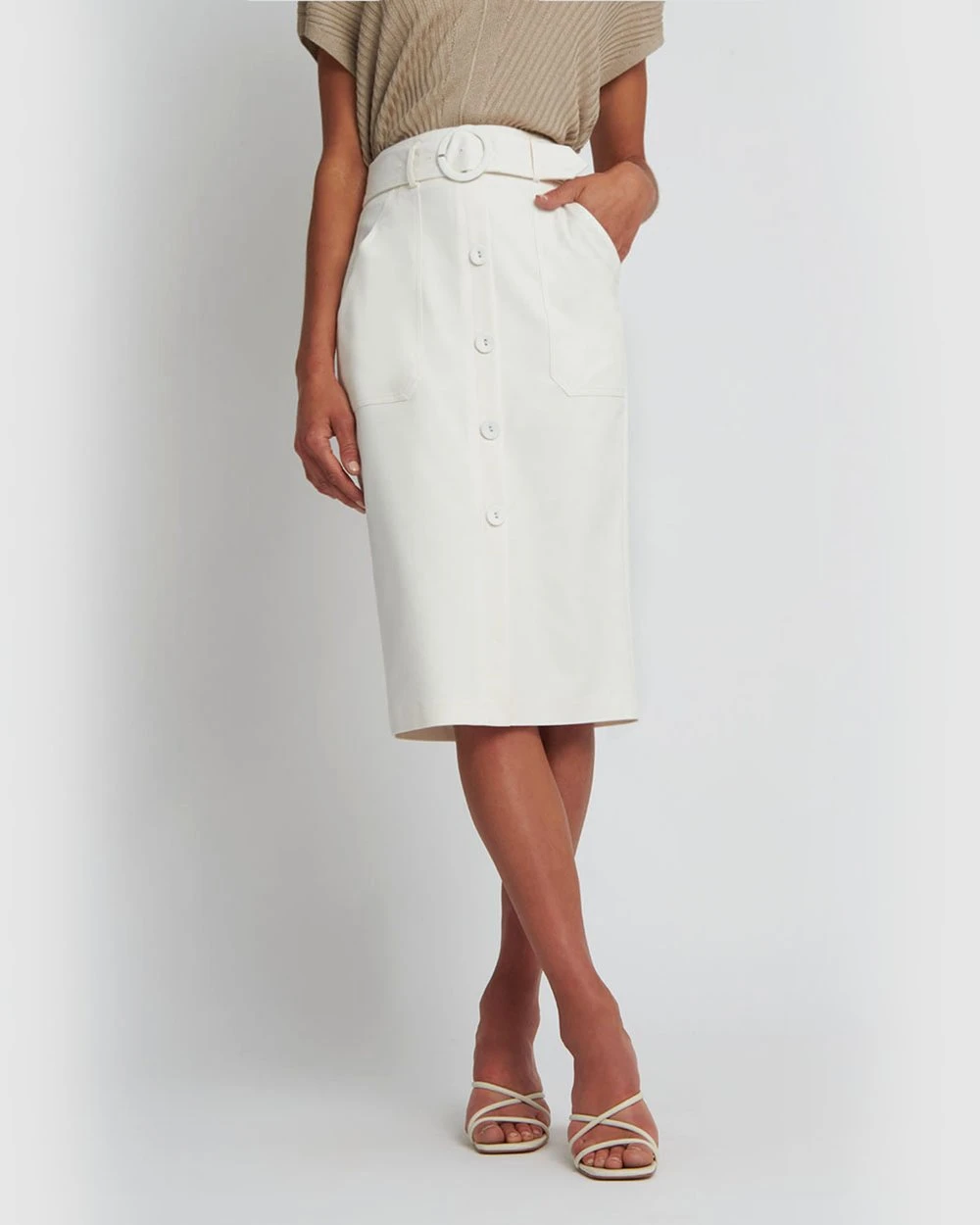 Getting ready for work is easy with the Erika Button Up Skirt by Forcast, featuring button down details and matching belt in a pencil silhouette. Styled with a fitted basic top, this modern design will take you from desk to dinner looking chic and classy.