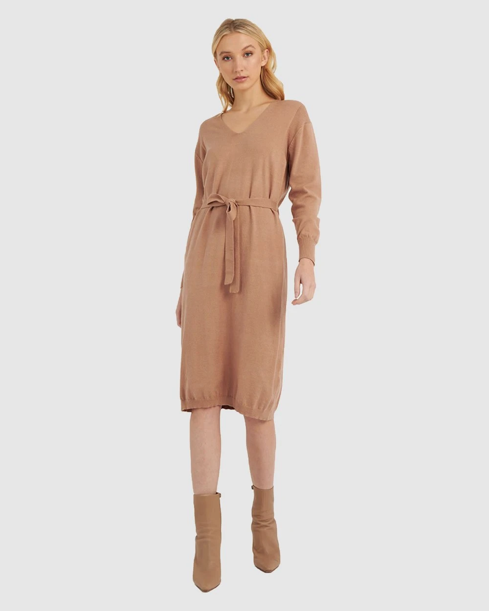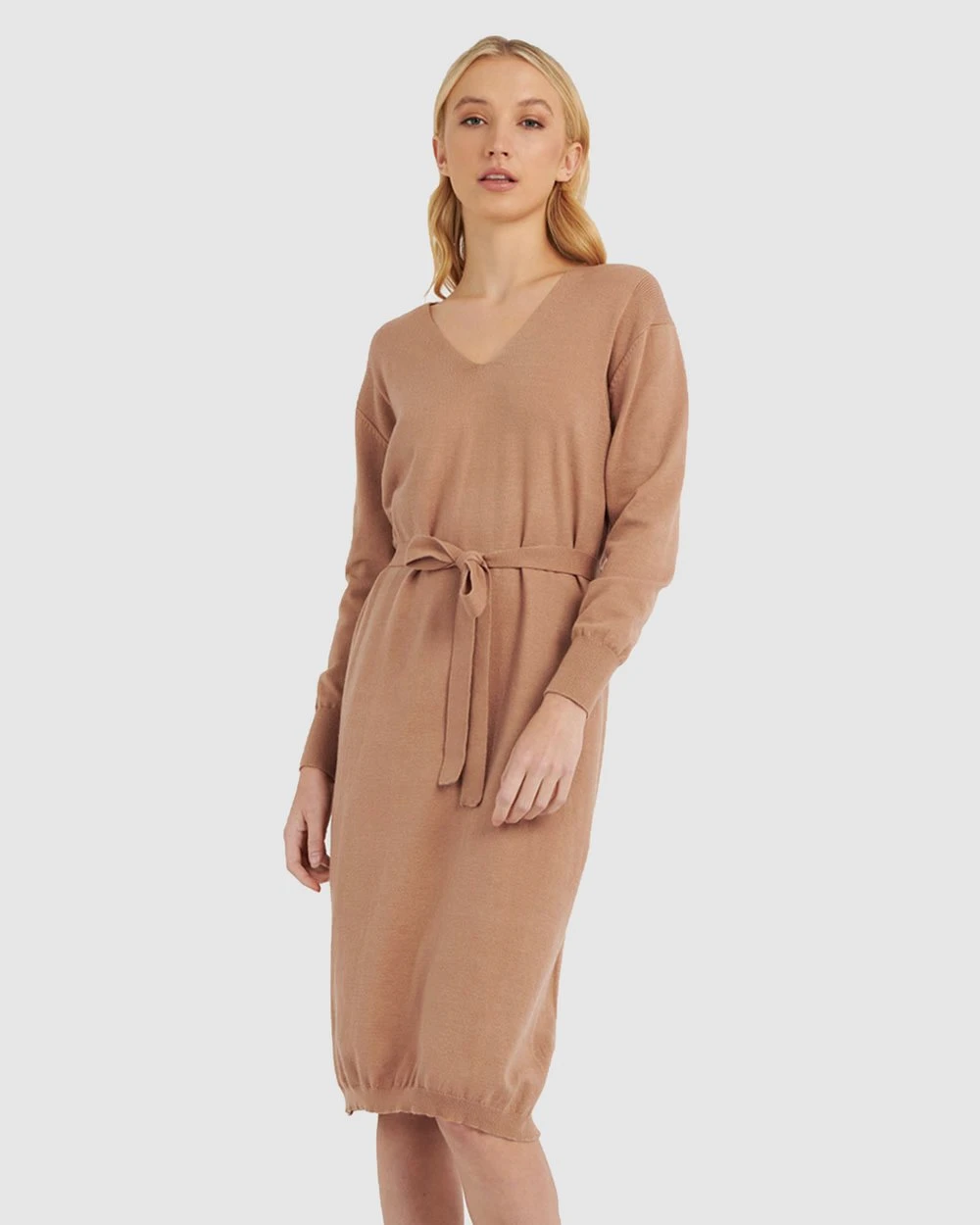 The Francesca Tie Waist Knit Dress by Forcast is a must-add to your style selection this Winter. Designed in a knit fabric and featuring a v-neckline and tie waist, this relaxed style will keep you warm and looking sophisticated through the day. For a complete look, finish off with heeled ankle boots.