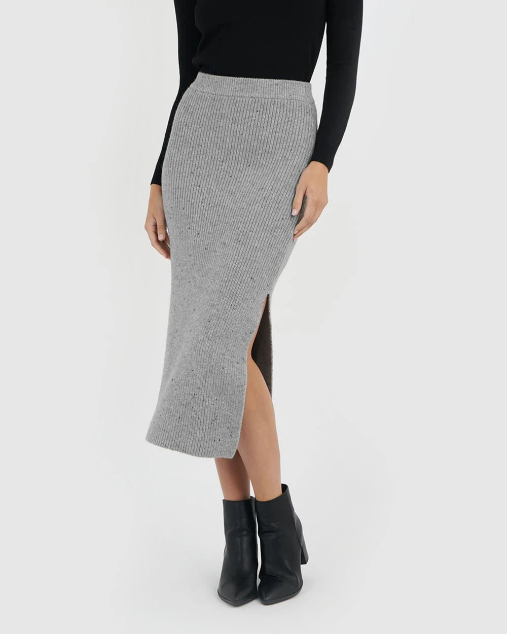 Find the perfect balance between comfort and style with our Gloria Split Knit Skirt by Forcast. Designed in stretch, ribbed knit texture with a flattering high waist, pencil silhouette and a side hem split, this skirt will refresh your winter-seasonal closet.