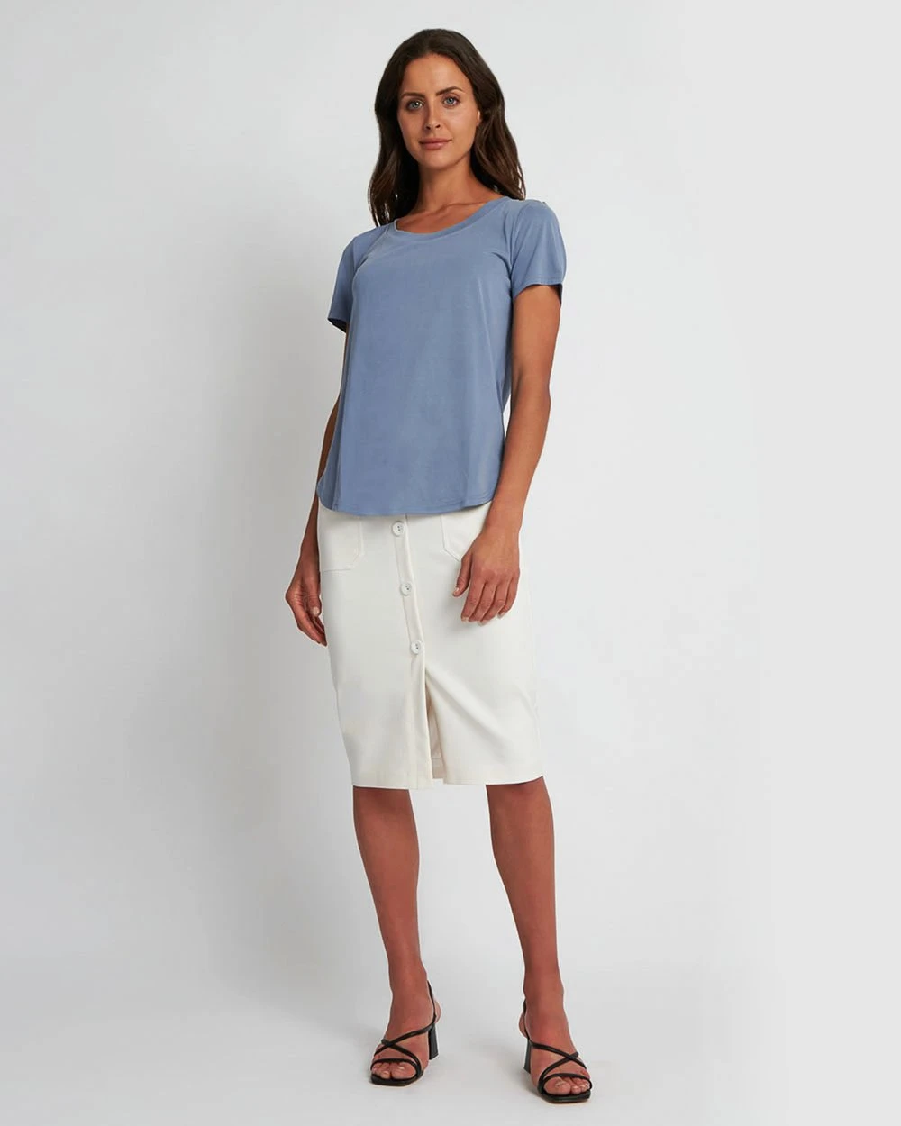 Luxuriously soft and cool to the touch, the Hanna Scoop Modal Tee by Forcast will be your must-have staple this summer. Simple in design, this bare essential is makes it easy to mix and match with your favourite accessories and bottom apparel.