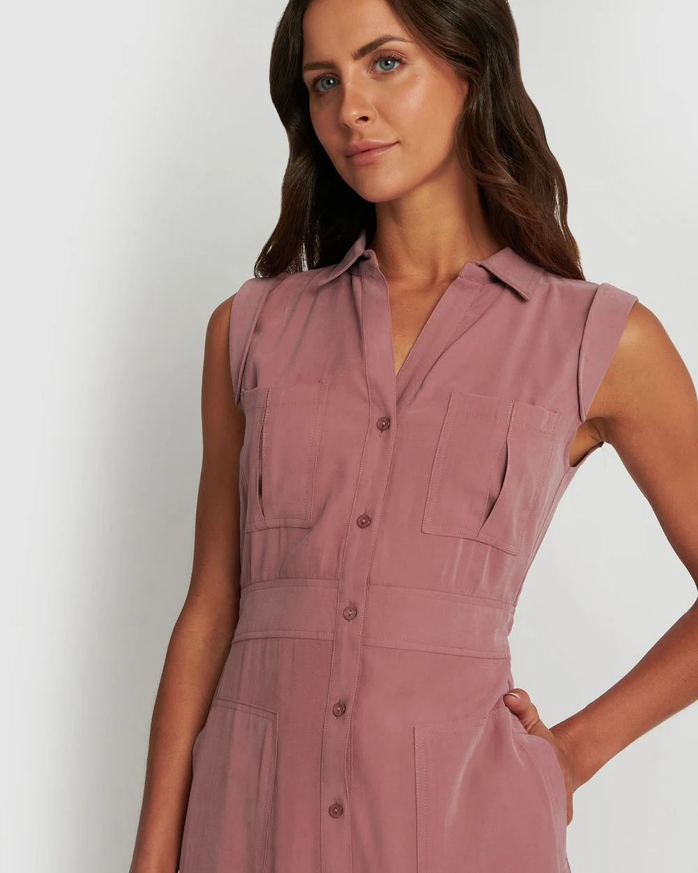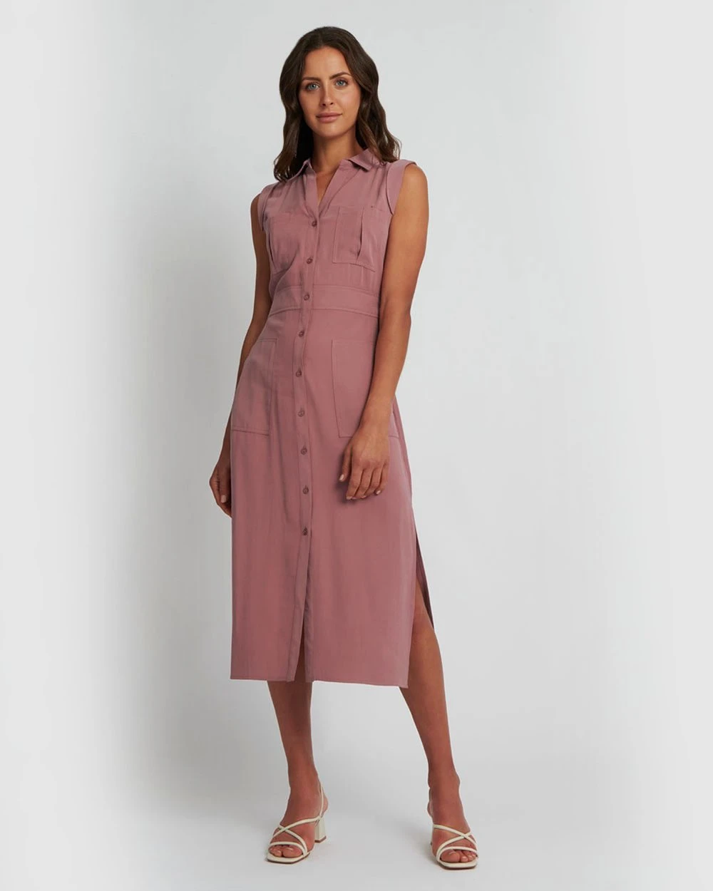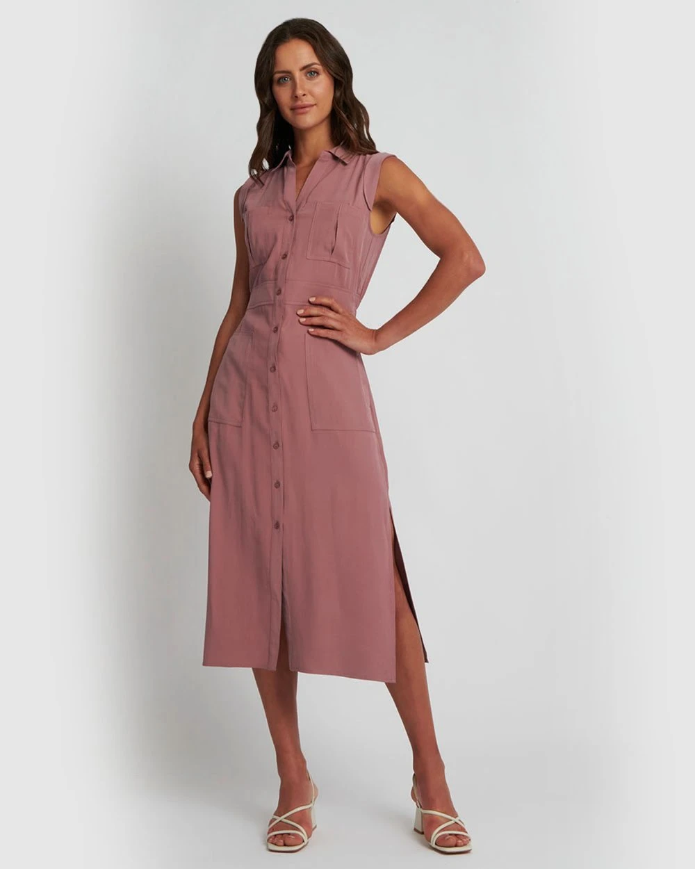 The Jasmin Utility Dress by Forcast is destined for urban outfitting. Crafted from soft textured fabrication, this sleeveless collared dress features patch pocket details, button down closure and side split hem, in a relaxed fit for true utility fashion. Wear this dress with your favourite pair of heels for functional, day dressing.