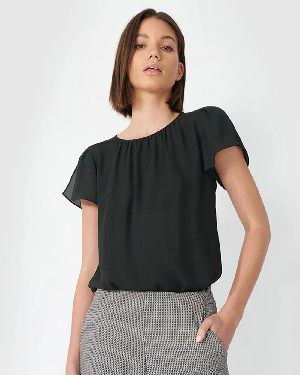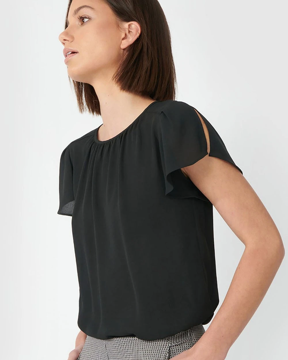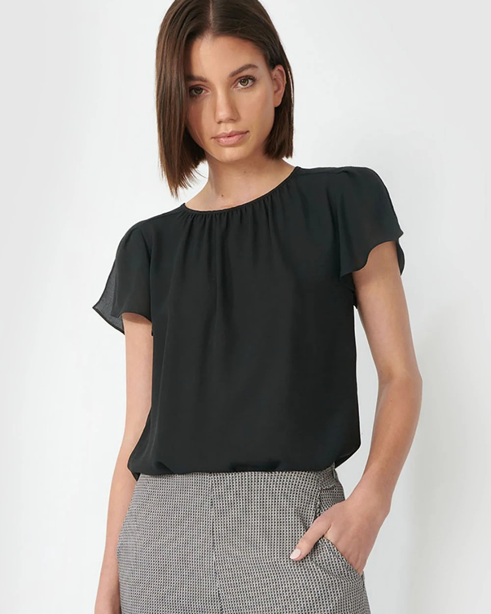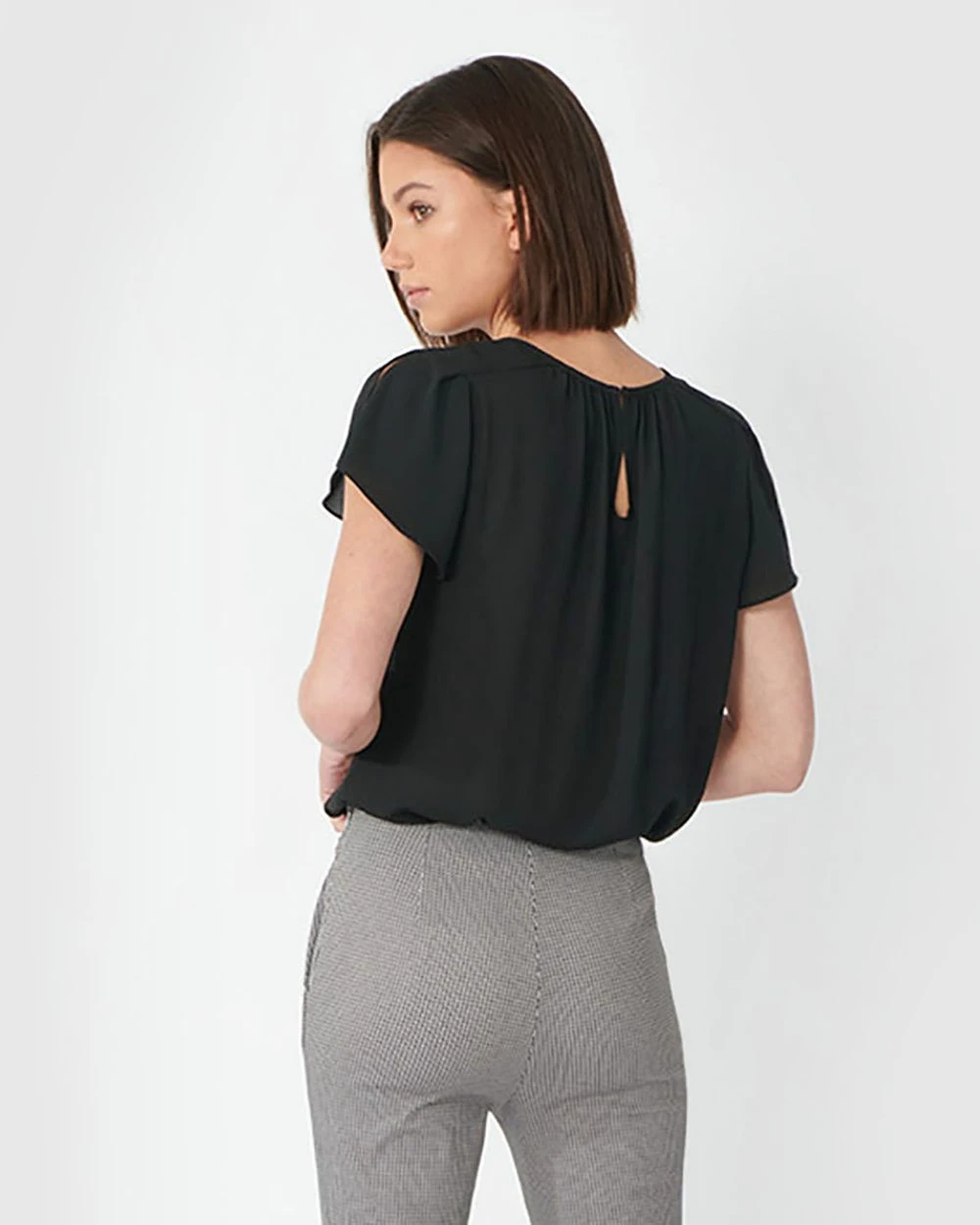 Make getting ready for work easy with the Karen Key Hole Blouse by Forcast. Featuring front and back gathering along the neckline and soft flutter split cap sleeve details, this piece will keep you polished all day long. For a sophisticated style, tuck into high waisted pants and finish off with nude pumps.