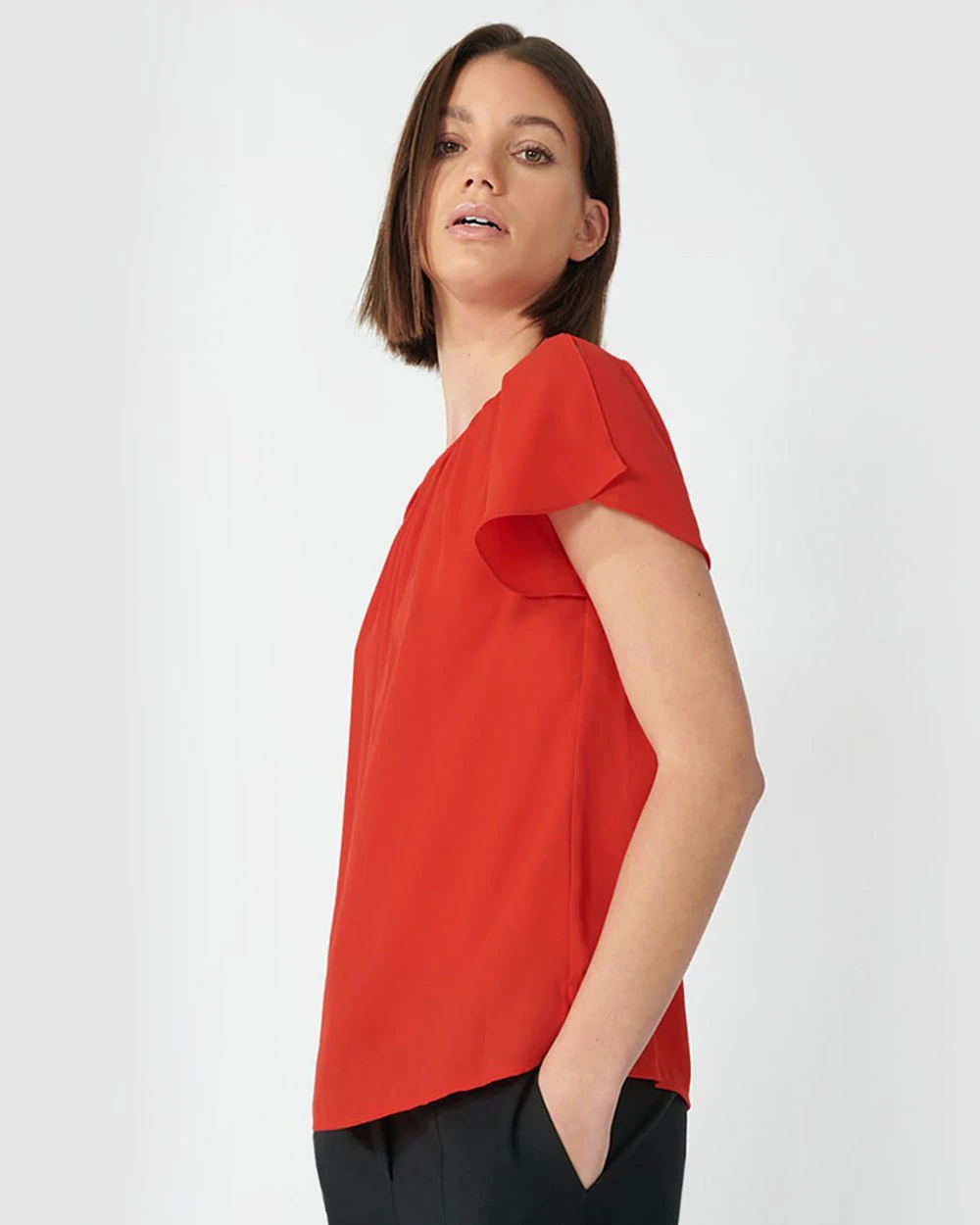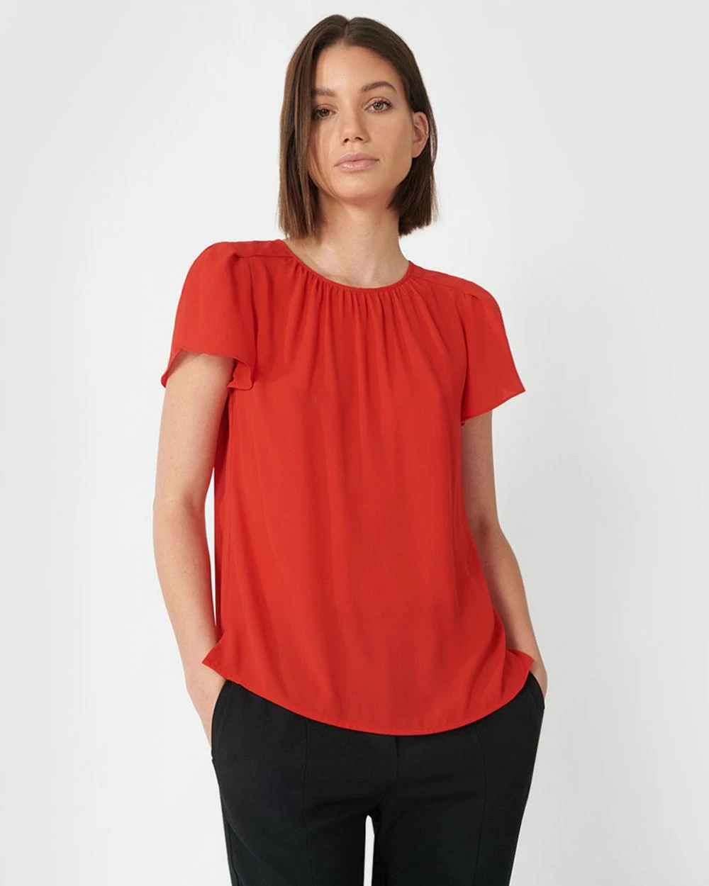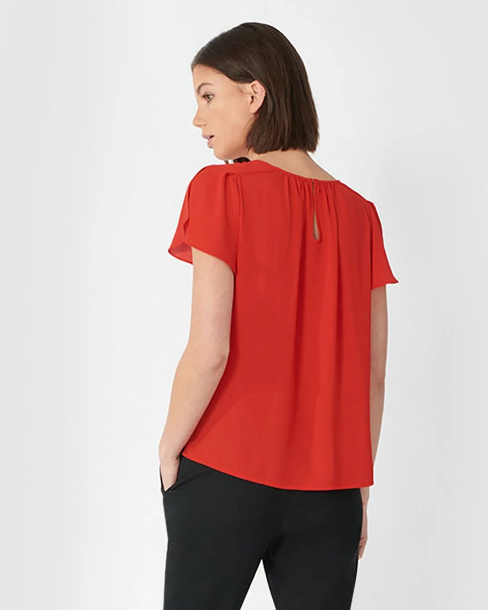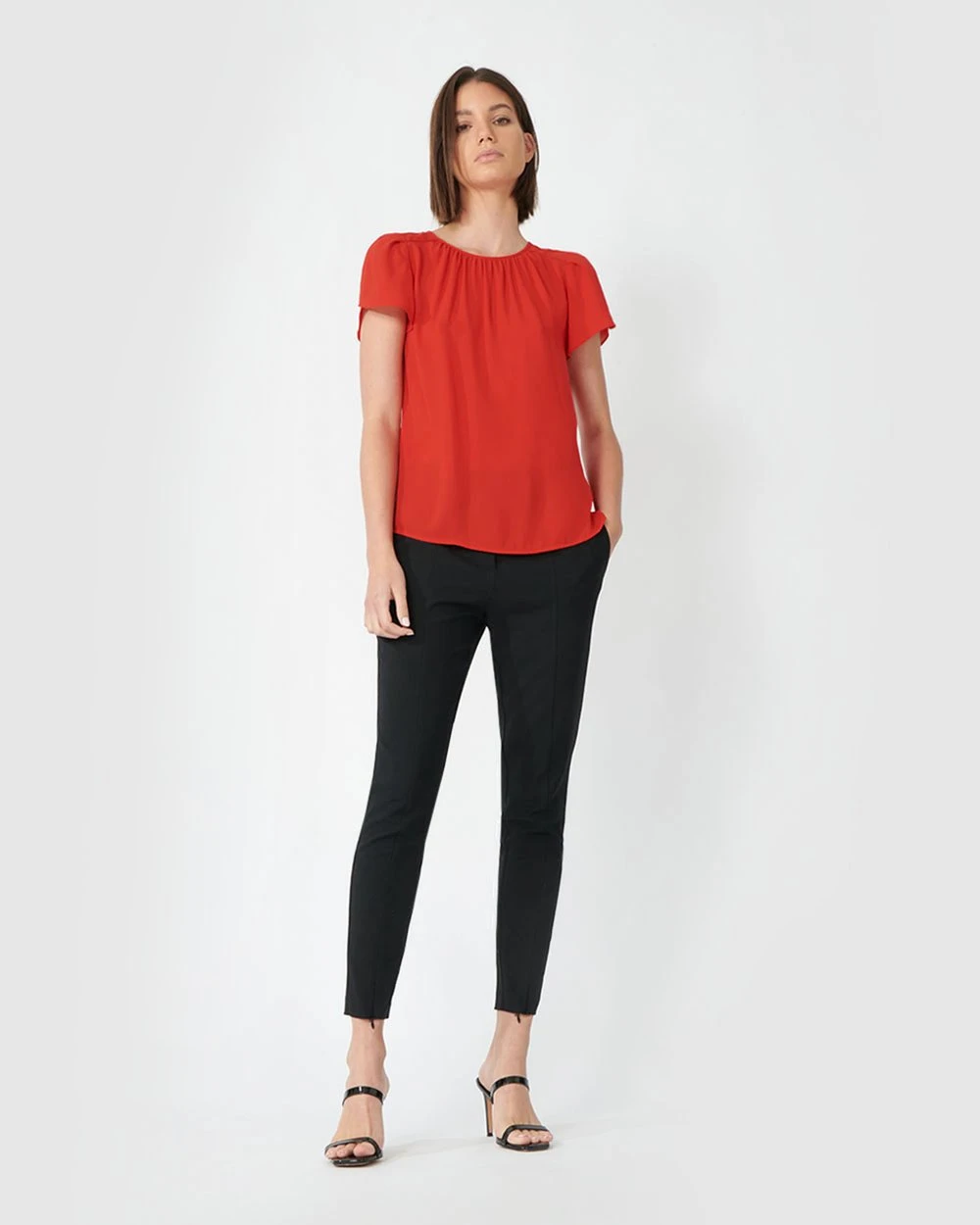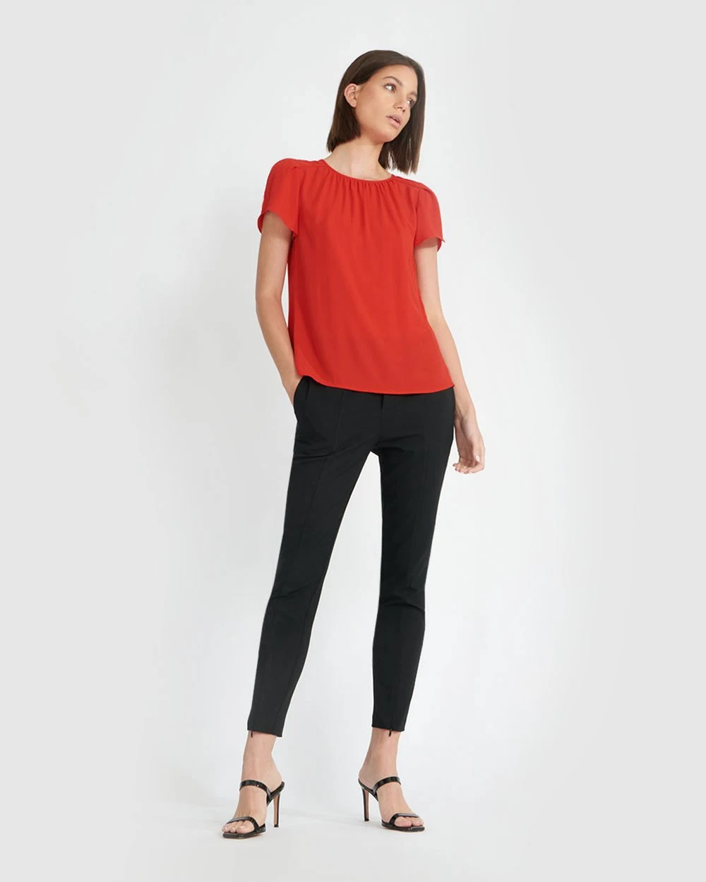 Make getting ready for work easy with the Karen Key Hole Blouse by Forcast. Featuring front and back gathering along the neckline and soft flutter split cap sleeve details, this piece will keep you polished all day long. For a sophisticated style, tuck into high waisted pants and finish off with nude pumps.
