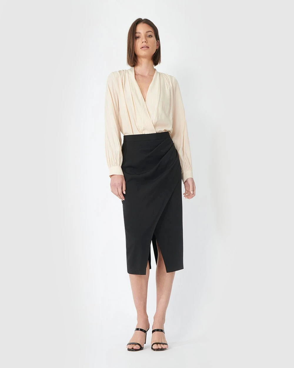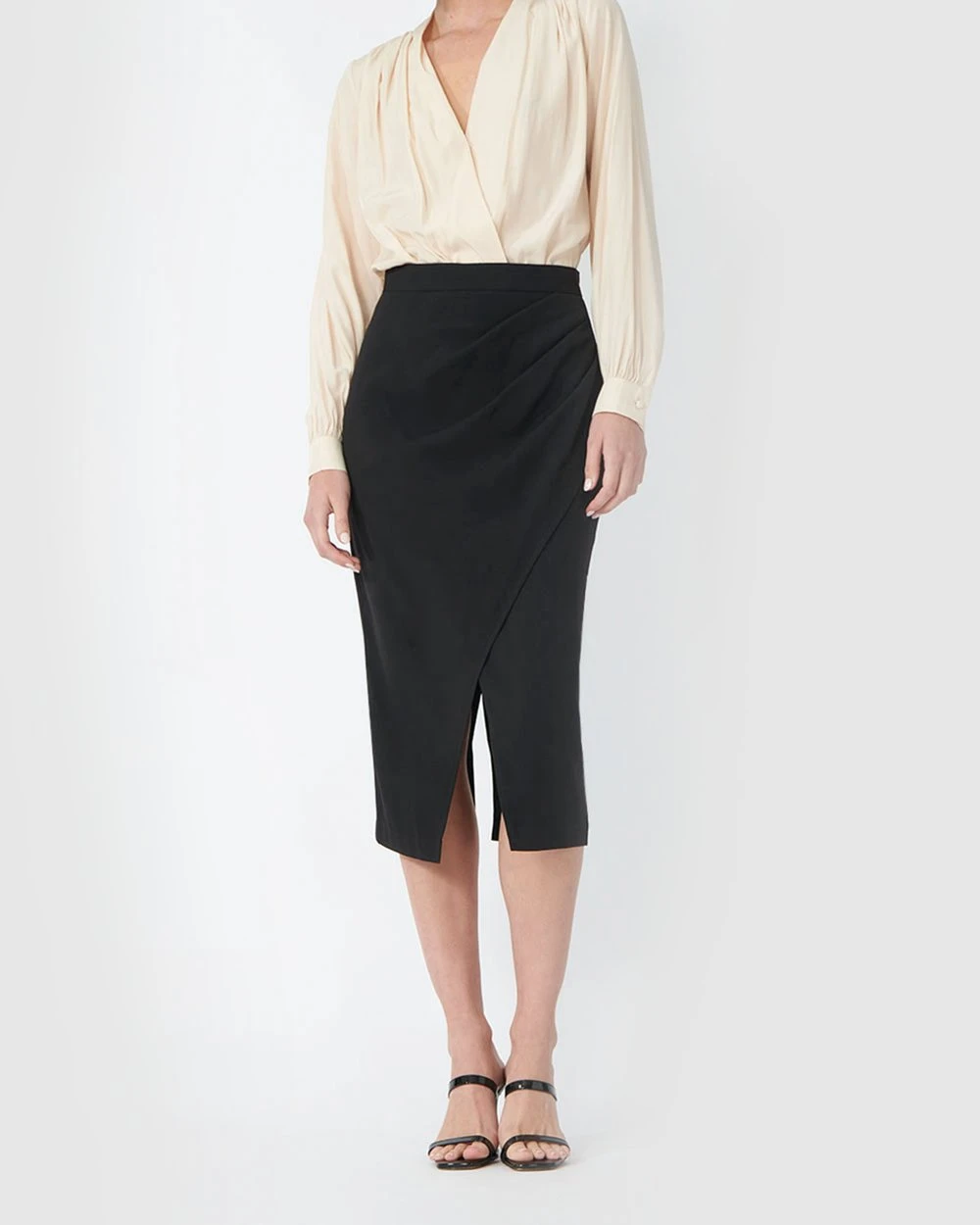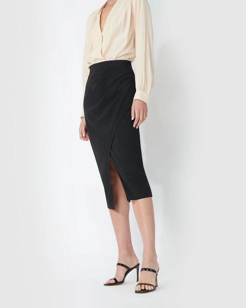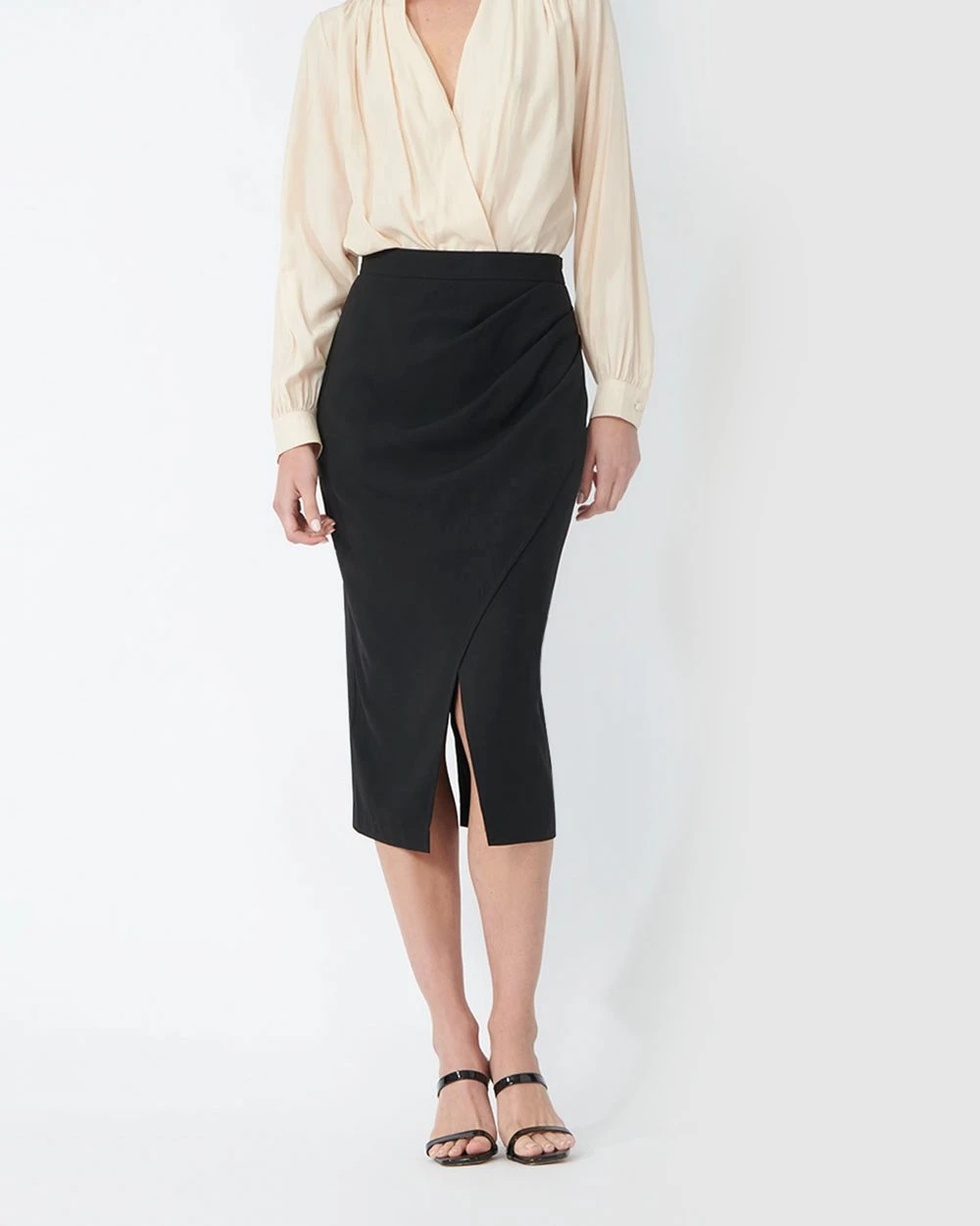 Refresh your work look this season with Keira Crossover Skirt by Forcast, featuring elegant wrap like detail in a pencil silhouette. Style it with a fitted basic top and strappy mules, adding simple drop earrings for a classy finish.