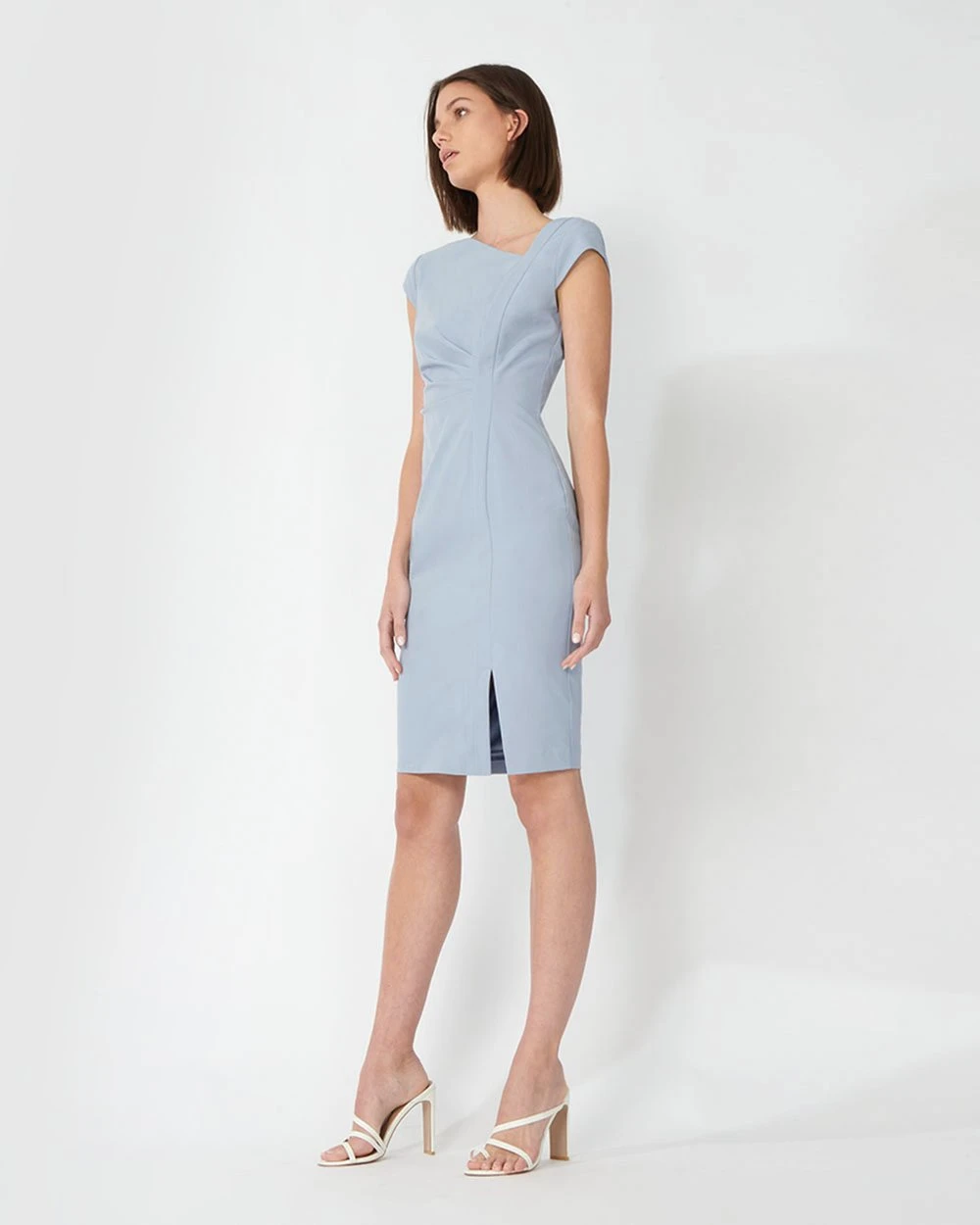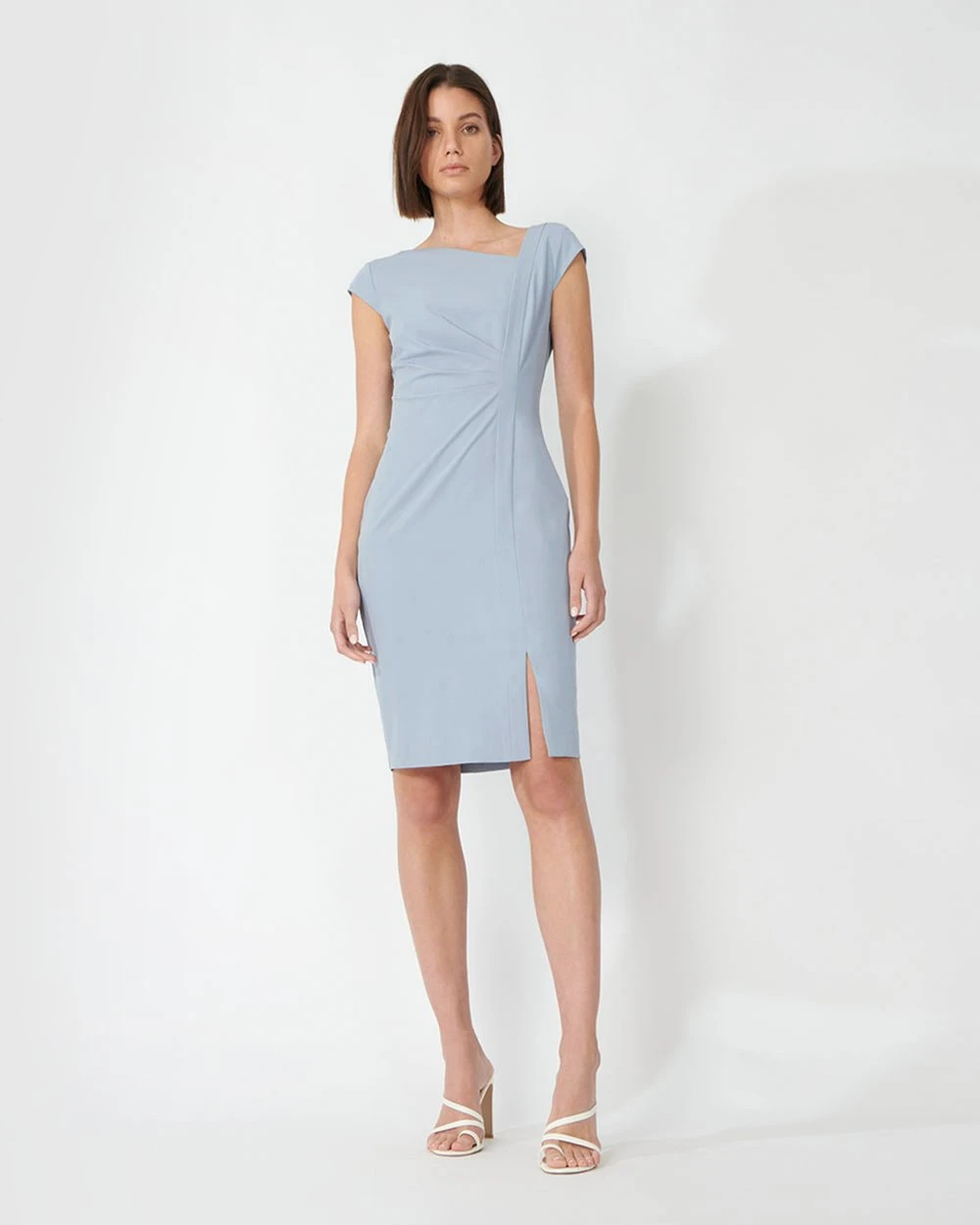 Elevate your work style with the Kenzie Asymmetric Dress by Forcast. Featuring the unique neckline and pleated waist details accentuate the sharpness of this design making it the ideal choice for a day in the corporate office. The pencil dress design is uniquely modern and the perfect pick for a desk to dinner look.