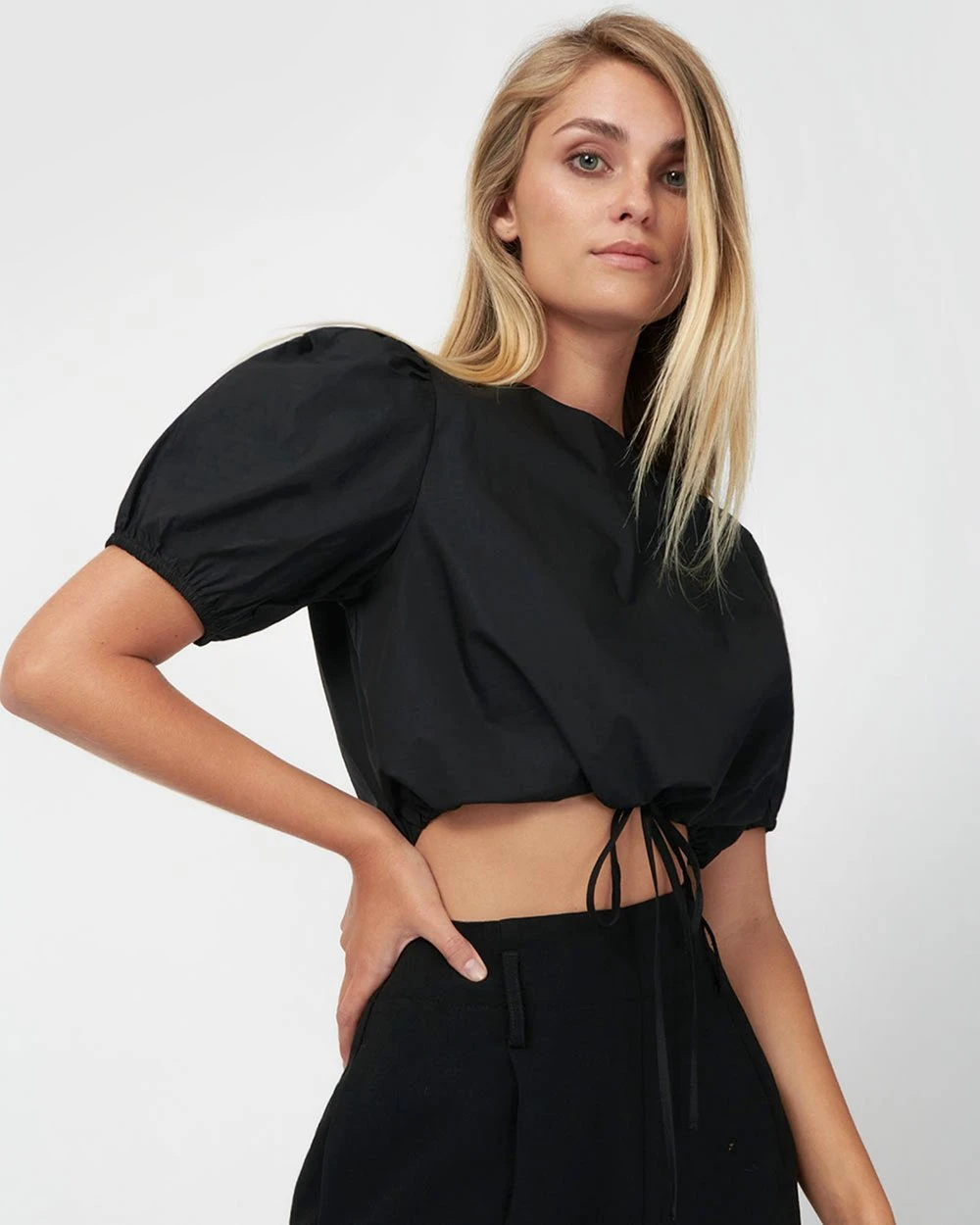 Getting ready for the weekend is simple with the London Puff Sleeve Crop Top by Forcast. This sweet summer style features puff sleeves in a cropped length that has an adjustable tie drawstring that provides a balance tuck. Look elegant and chic on any day of the week and pair with high waisted jeans or complete the matching set with the London Maxi Skirt.
