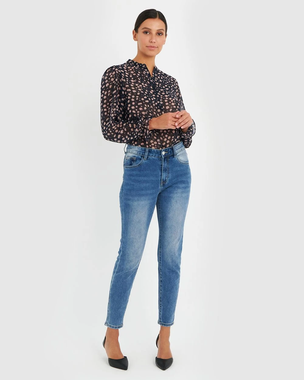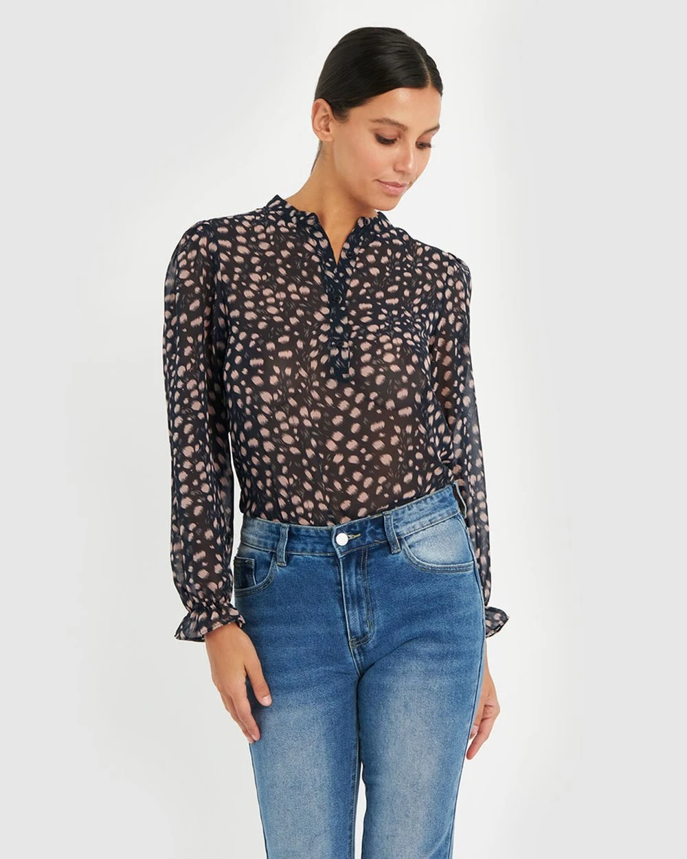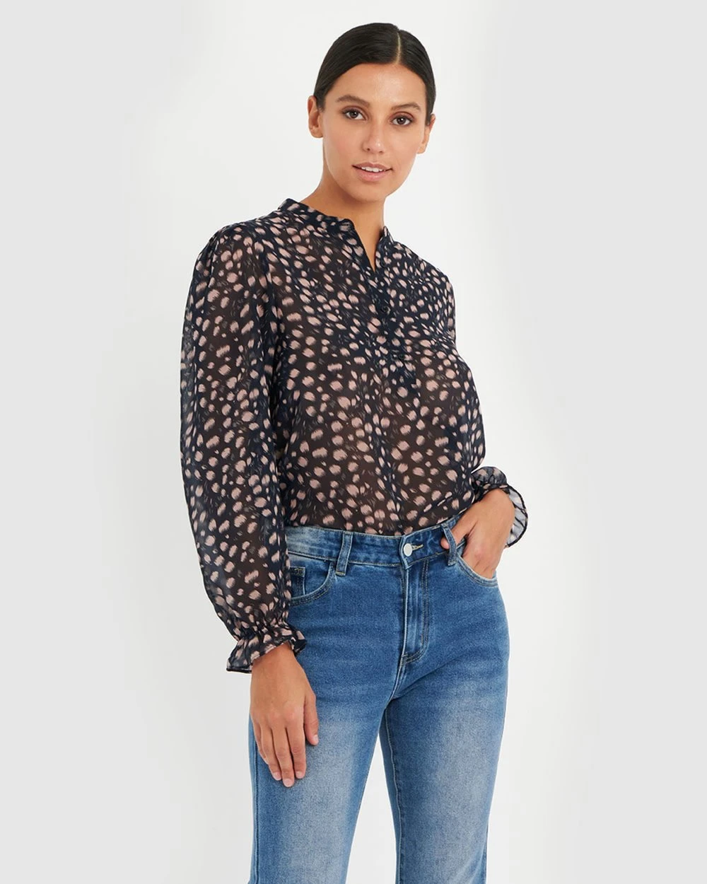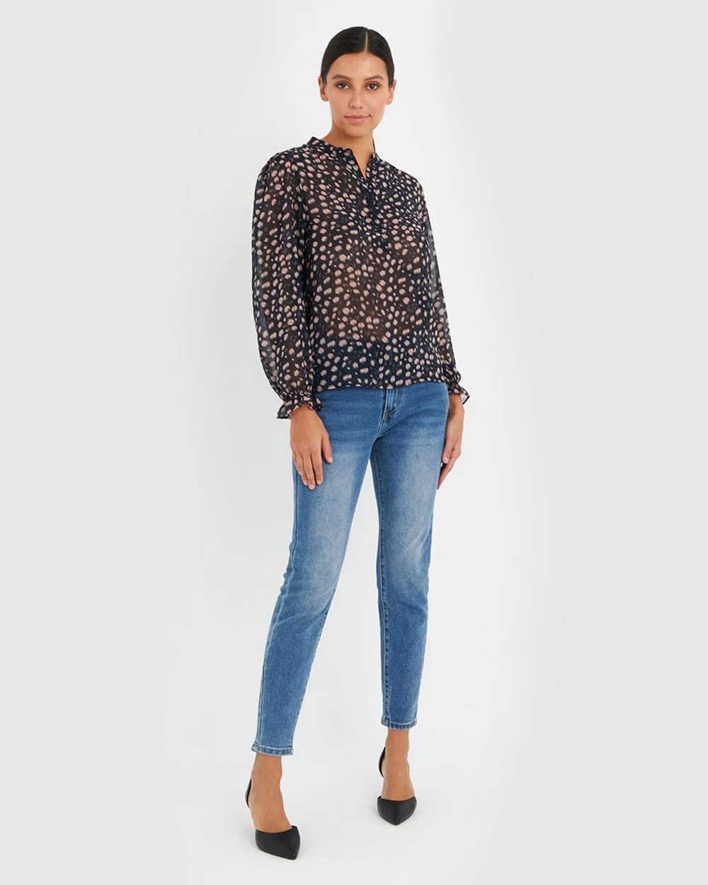Romantic in style, the Maddie Blouse from Forcast is elegant and simple featuring a sheer print, frill cuffs and a buttoned front. Pair with skirt or culottes for an effortless sophistication.