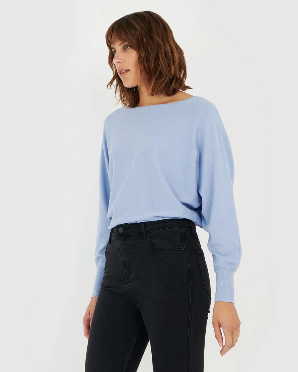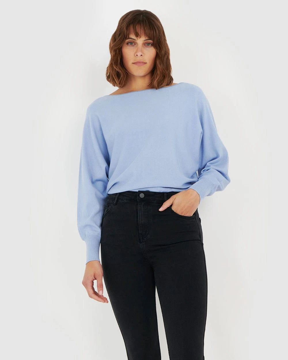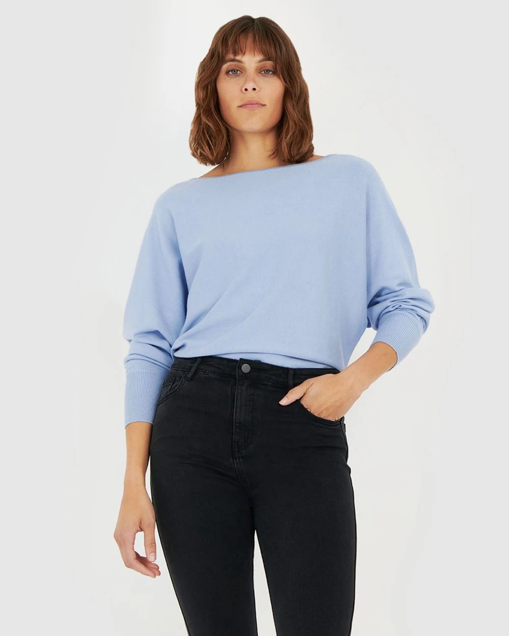 The Maxine Boat Neck Knit by Forcast is sure to be a new season favourite. Featuring boatneck line with batwing sleeves in and relaxed silhouette knit. For a cosy chic look to take you from work to the weekend, style it with classic slim pants and heels.