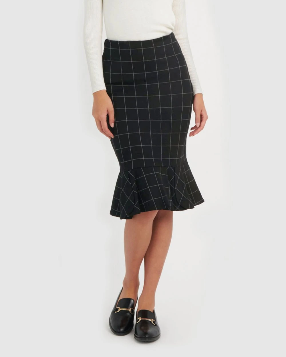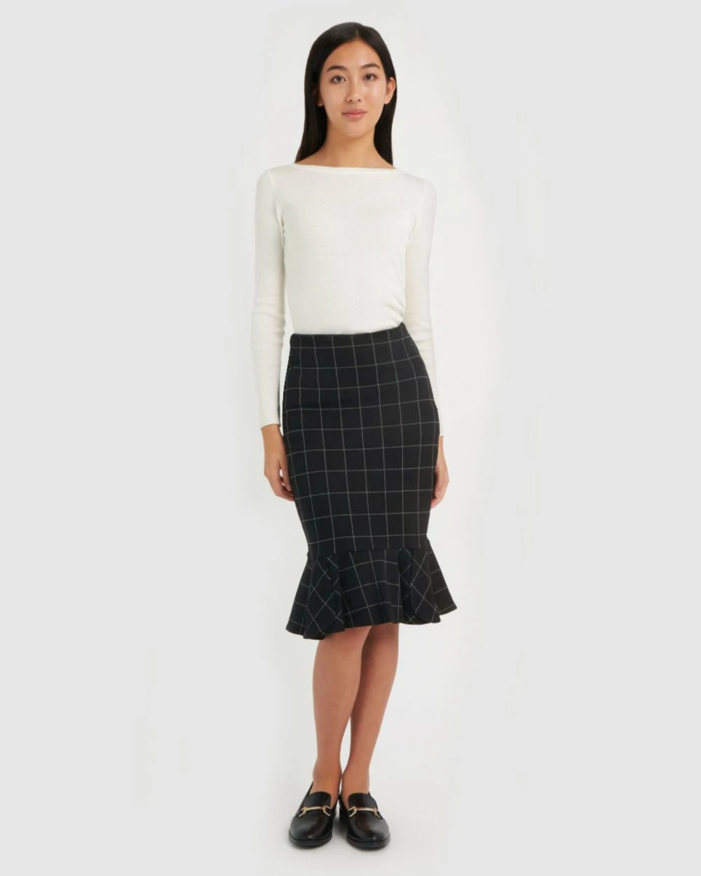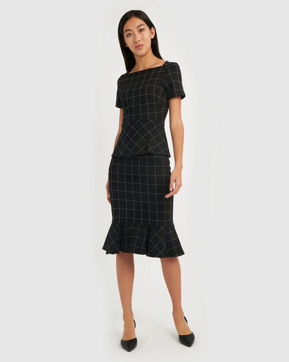 The Mya Grid Fluted Hem Skirt by Forcast is the perfect versatile piece for your everyday wardrobe. Designed with a flattering fluted hem and stretch fabrication that will accentuate all the right curves for a fitted silhouette. Pair with a simple top and black heels for a polished look or complete the set with the Mya Grid Peplum Top.