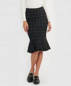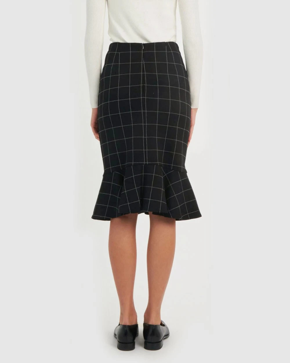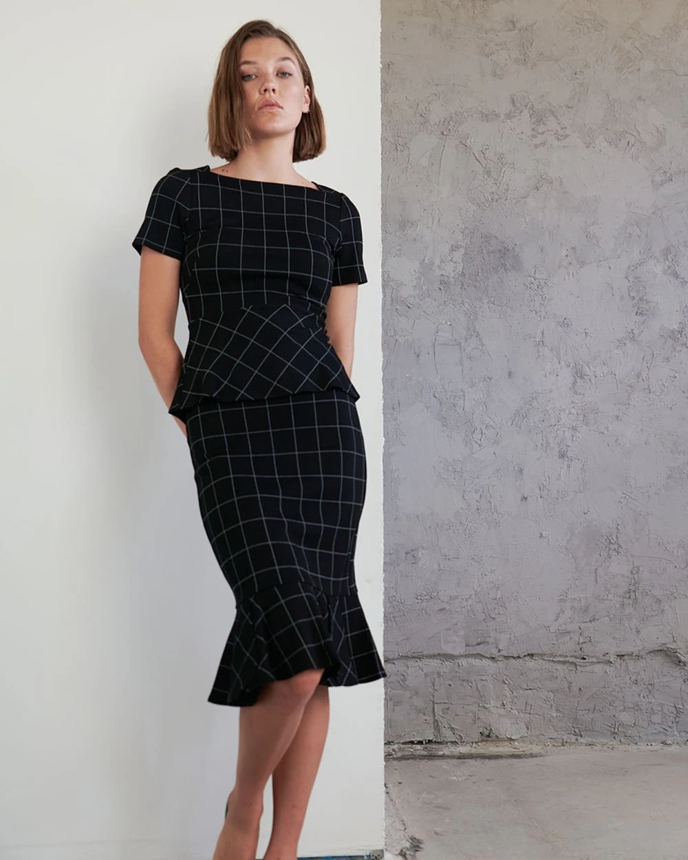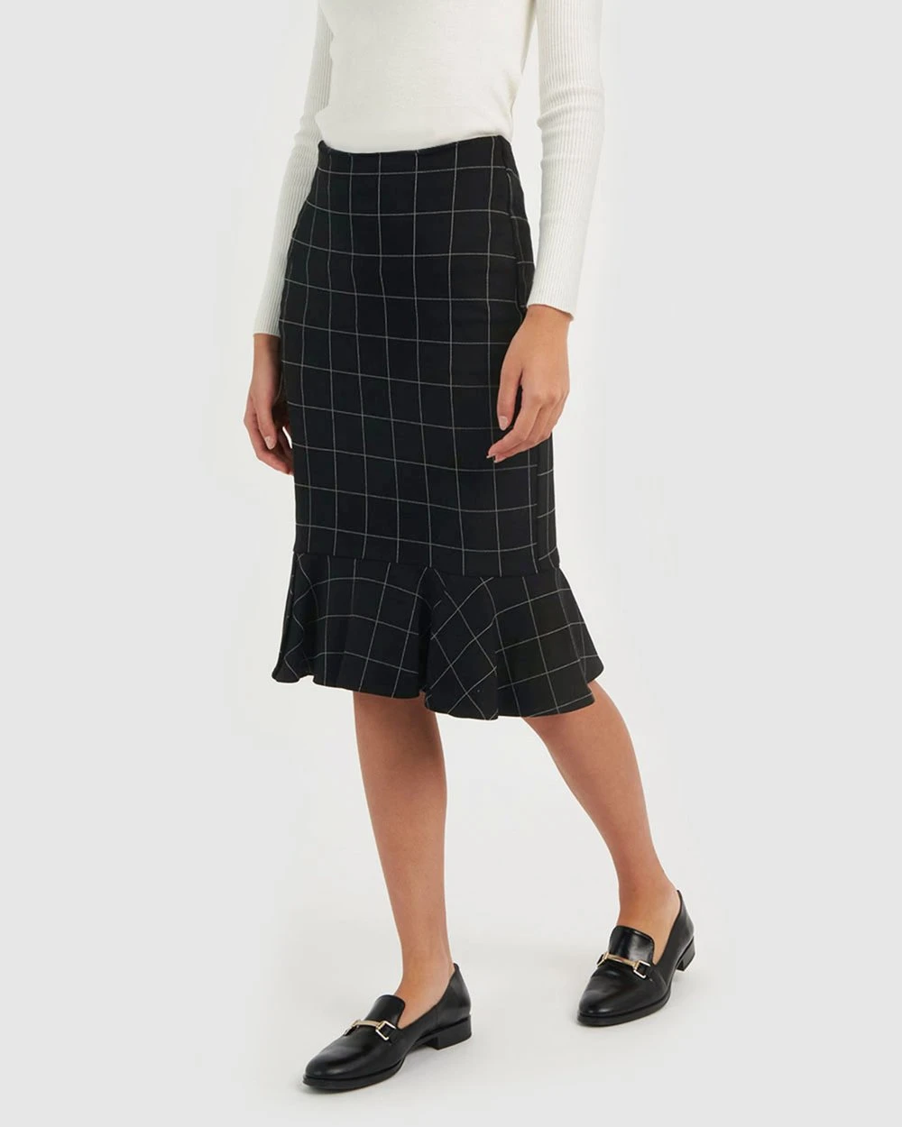 The Mya Grid Fluted Hem Skirt by Forcast is the perfect versatile piece for your everyday wardrobe. Designed with a flattering fluted hem and stretch fabrication that will accentuate all the right curves for a fitted silhouette. Pair with a simple top and black heels for a polished look or complete the set with the Mya Grid Peplum Top.