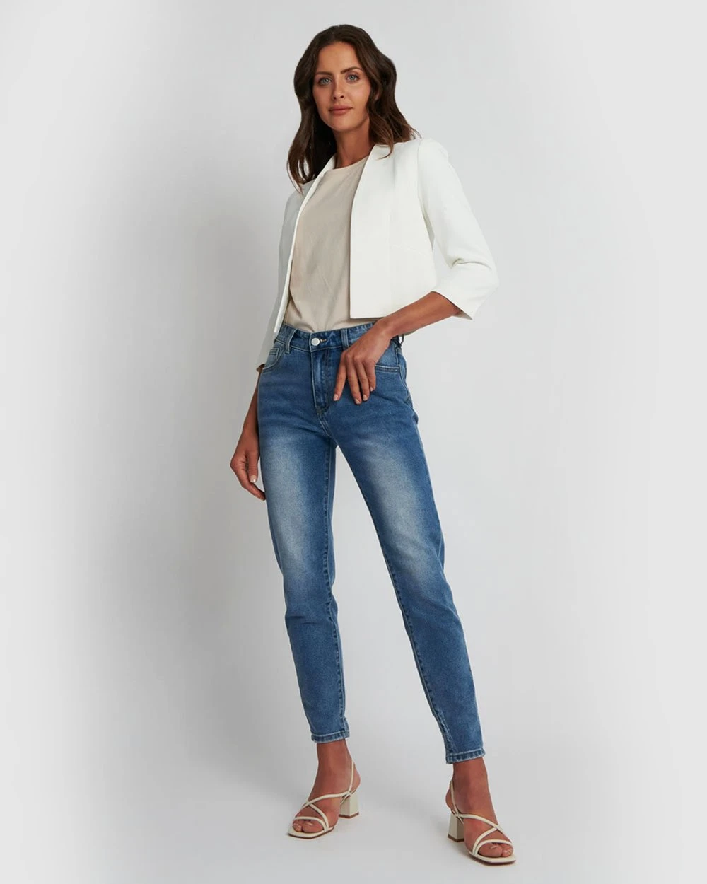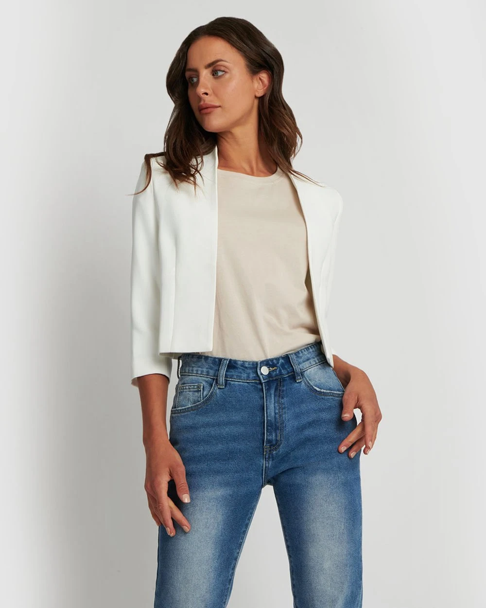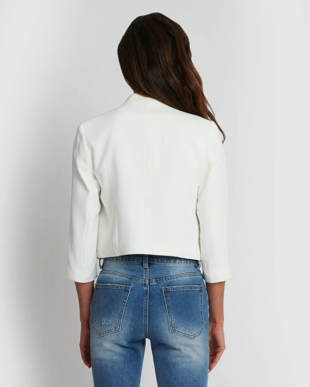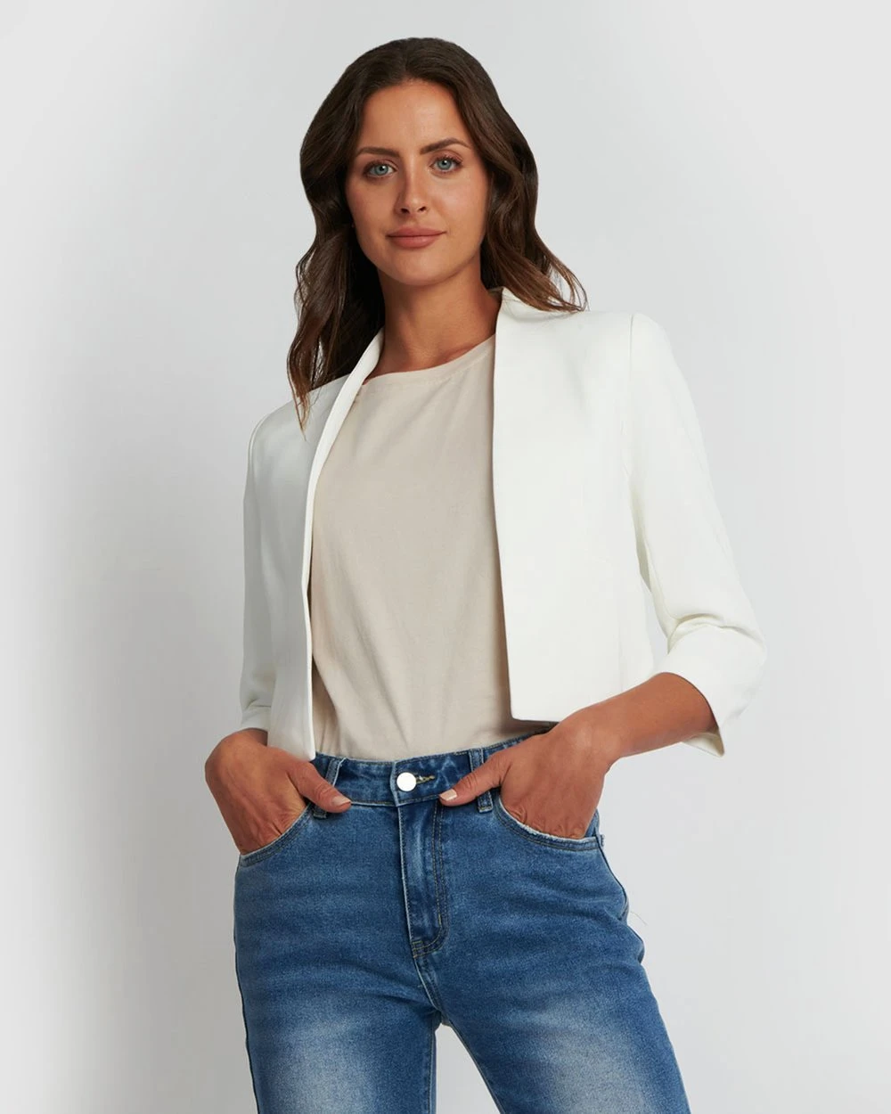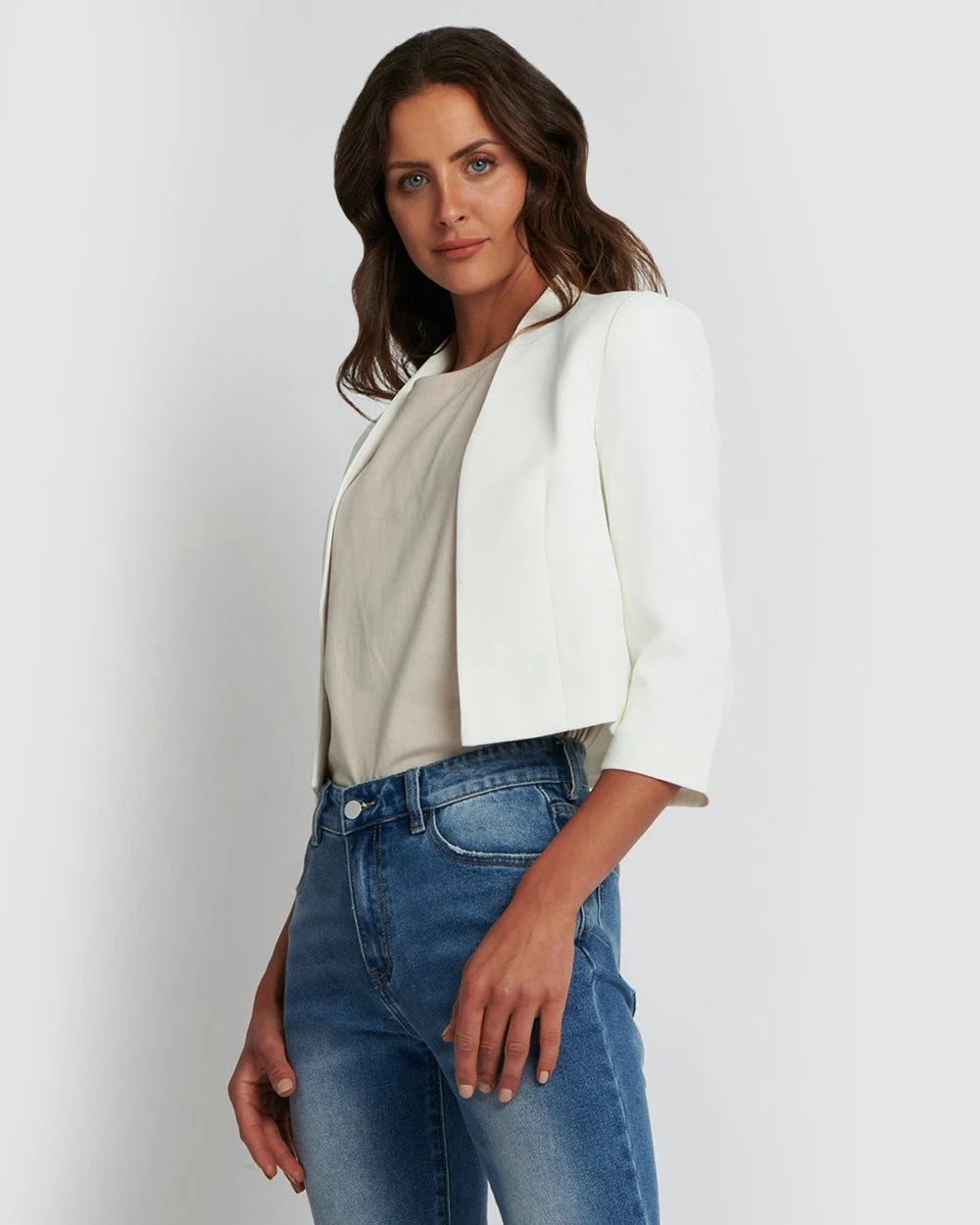The Polina Short Jacket by Forcast is the staple outerwear piece you need this season. This collarless jacket with its cropped length and structured fit features a simple open front design, will take you from work to play looking effortlessly chic all night and day. Complete the set with the matching Polina Sleeveless Dress.
