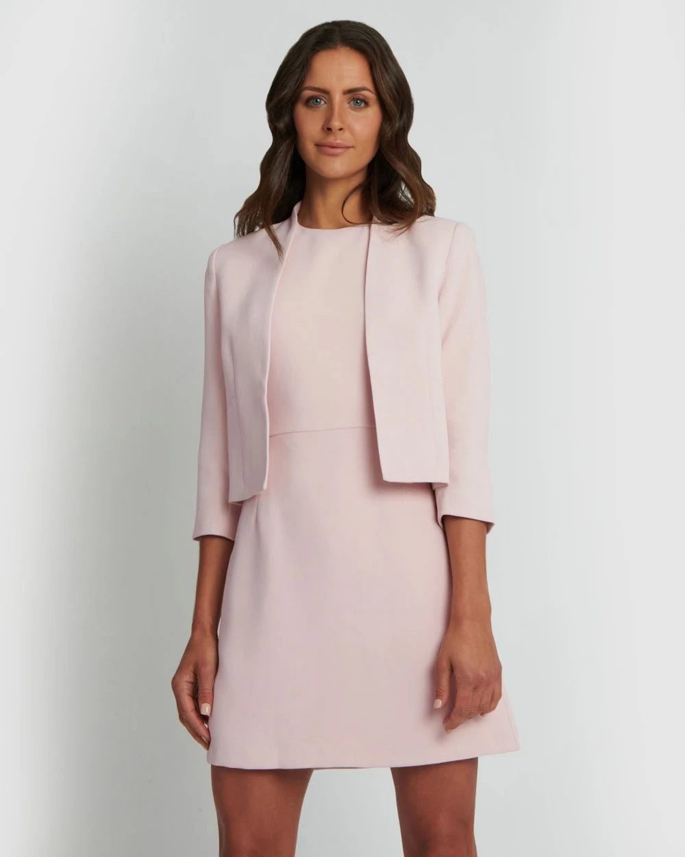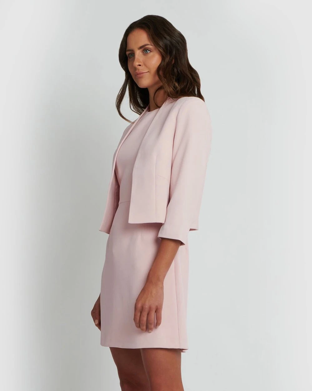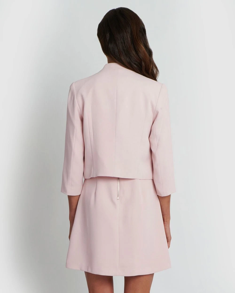 The Polina Short Jacket by Forcast is the staple outerwear piece you need this season. This collarless jacket with its cropped length and structured fit features a simple open front design, will take you from work to play looking effortlessly chic all night and day. Complete the set with the matching Polina Sleeveless Dress.